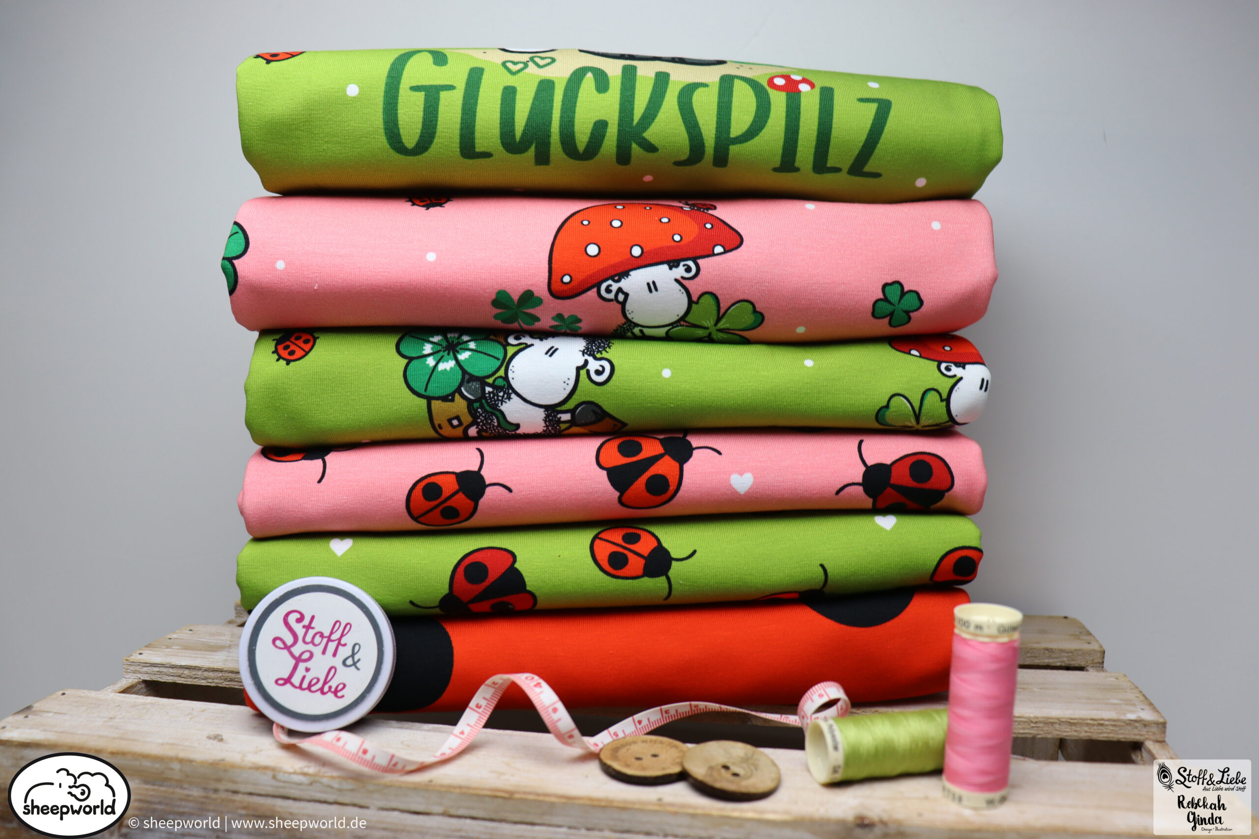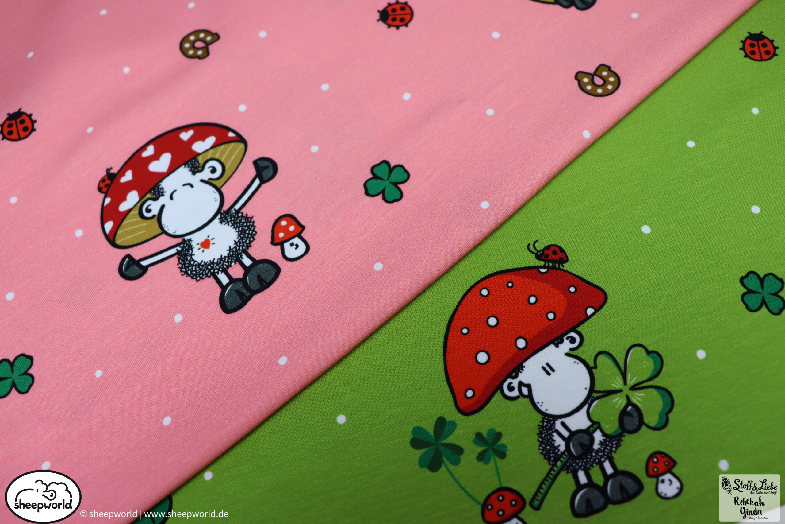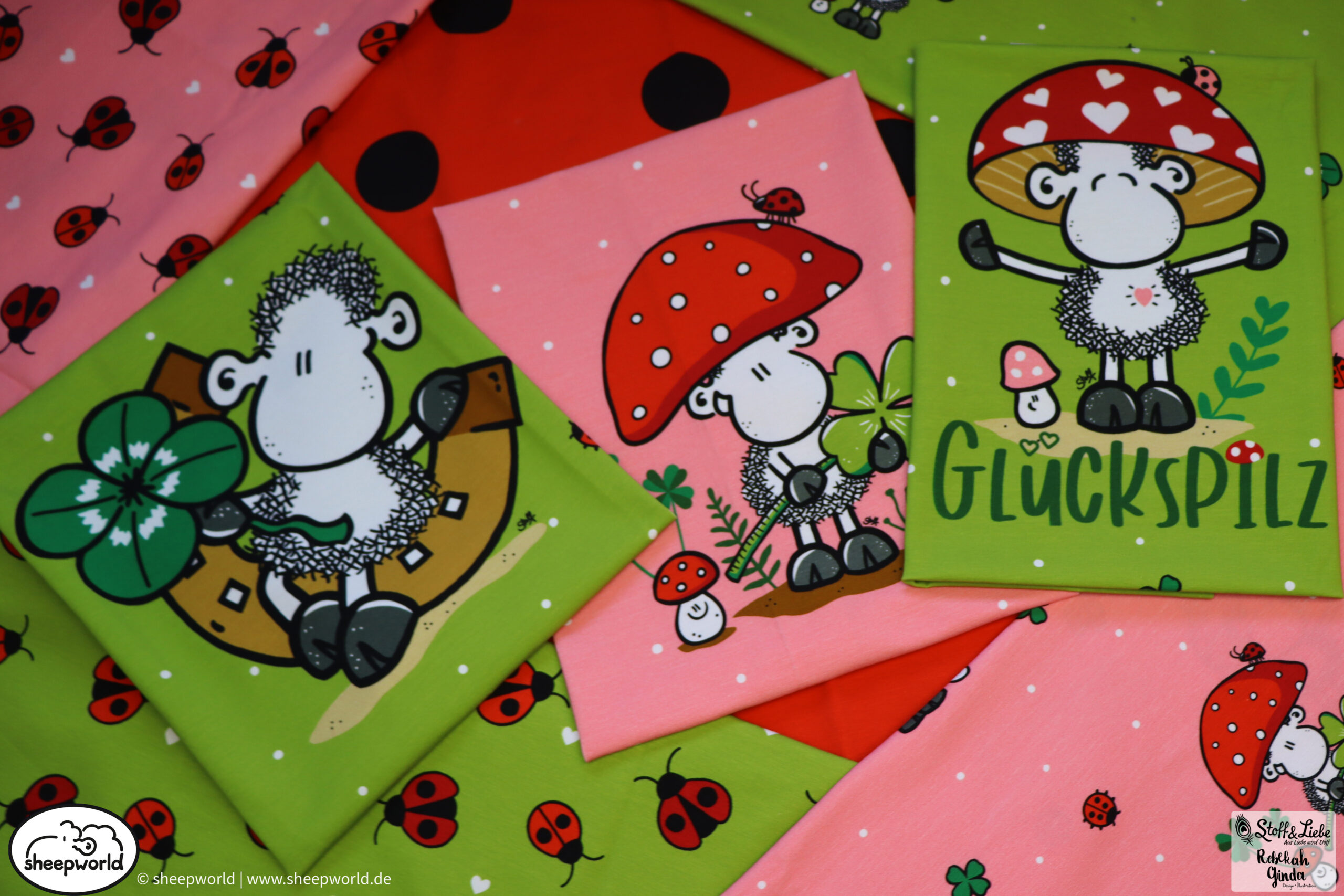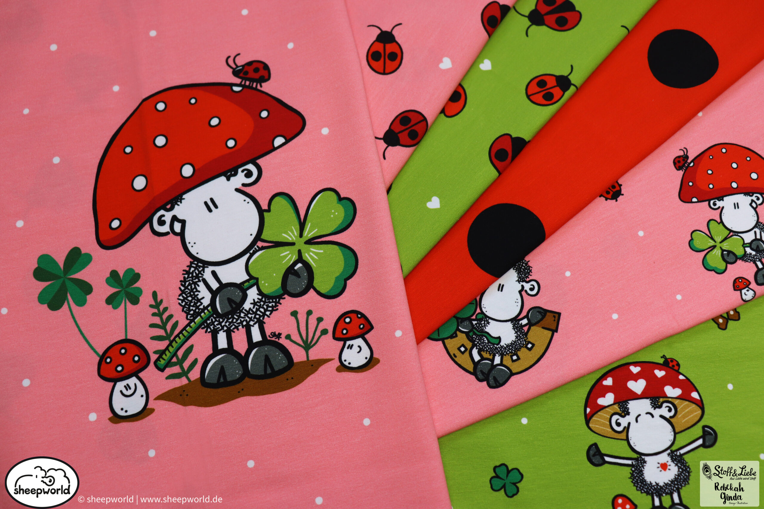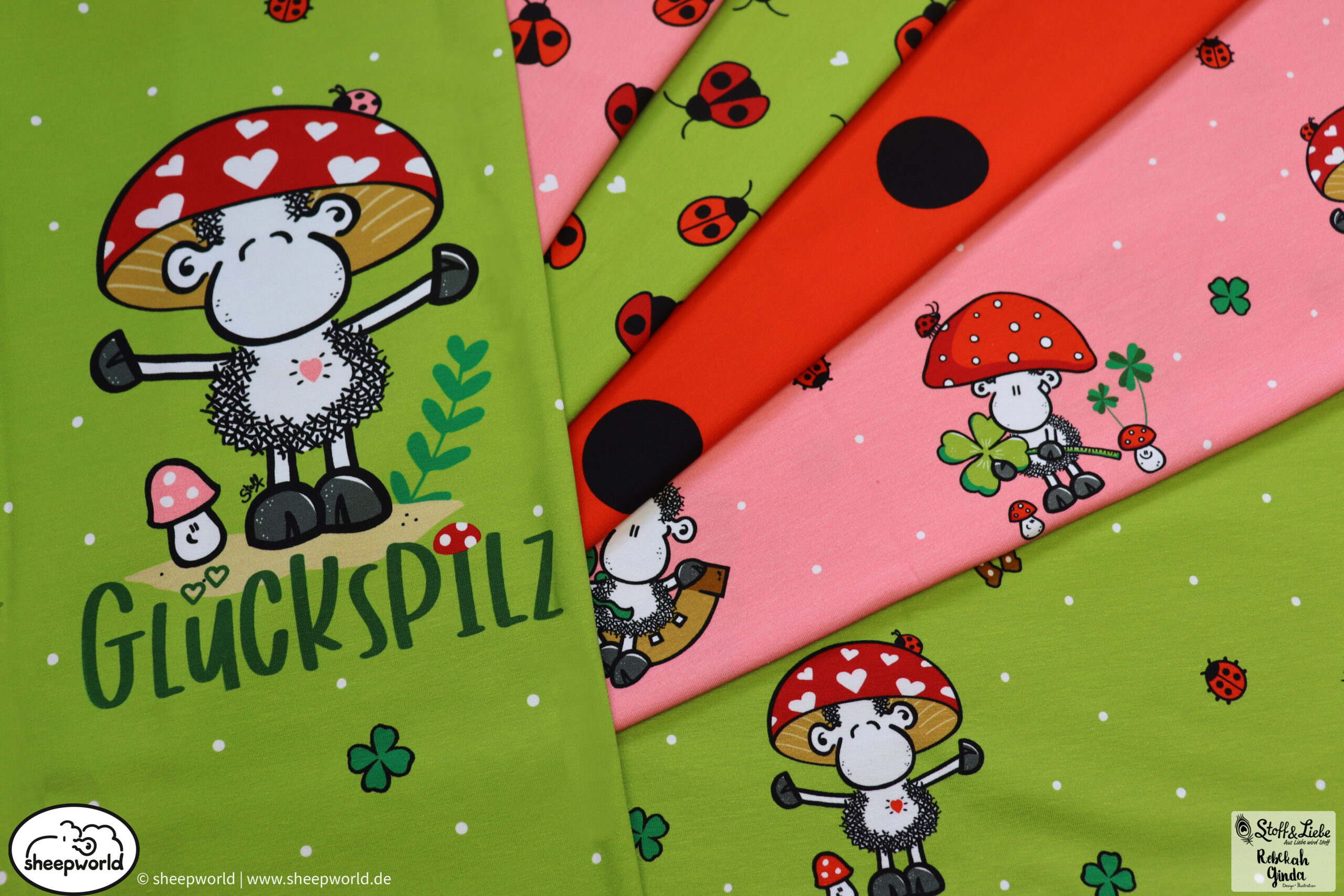 Unsere „sheepworld – Glückspilz“ Kollektion wurde umgesetzt von Rebekah Ginda Design. Wir haben für Euch ein Panel, einen Hauptstoff in zwei Farben und passend dazu zwei Kombistoffe, einer davon ebenfalls in zwei Farbvarianten. Die Stoffe dieser Kollektionen erscheinen auf Jersey und haben eine Materialzusammensetzung von 95% Baumwolle und 5% Elasthan.