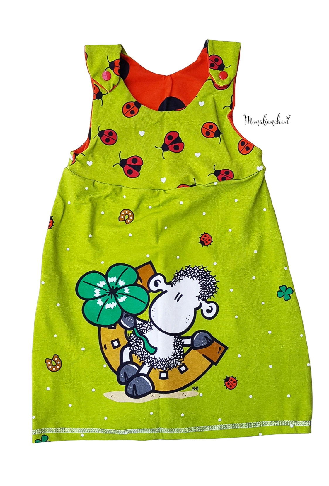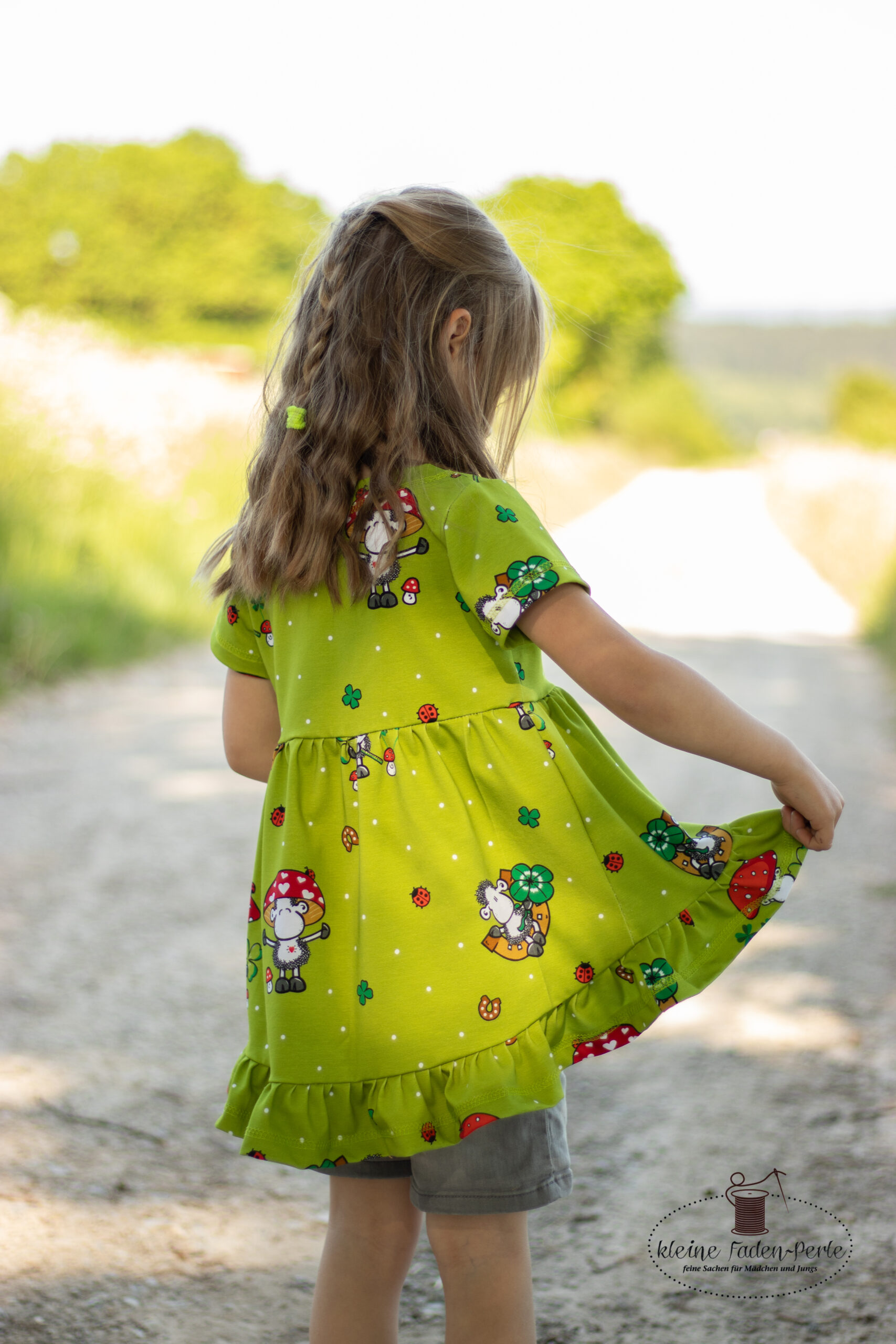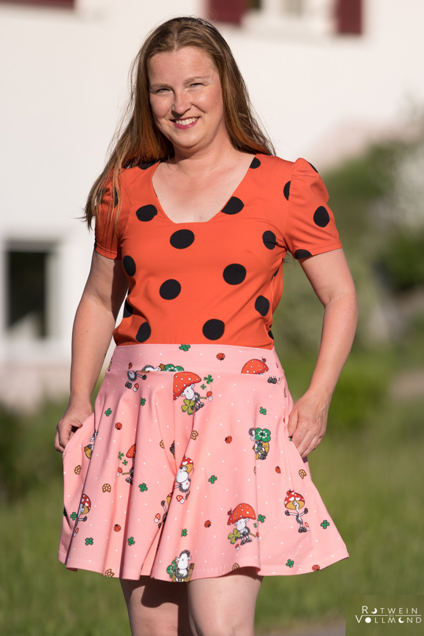 Den Hauptstoff „Glückspilz“ bekommt Ihr in zwei Farben: Rosa und Grün. Hier findet Ihr die Motive vom Panel in einer Größe von ca. 8 cm bis 9 cm (Schäfchen). Die weiteren über den Stoff verstreuten Motive wie Kleeblätter und Marienkäfer haben eine Höhe von ca. 2 cm.