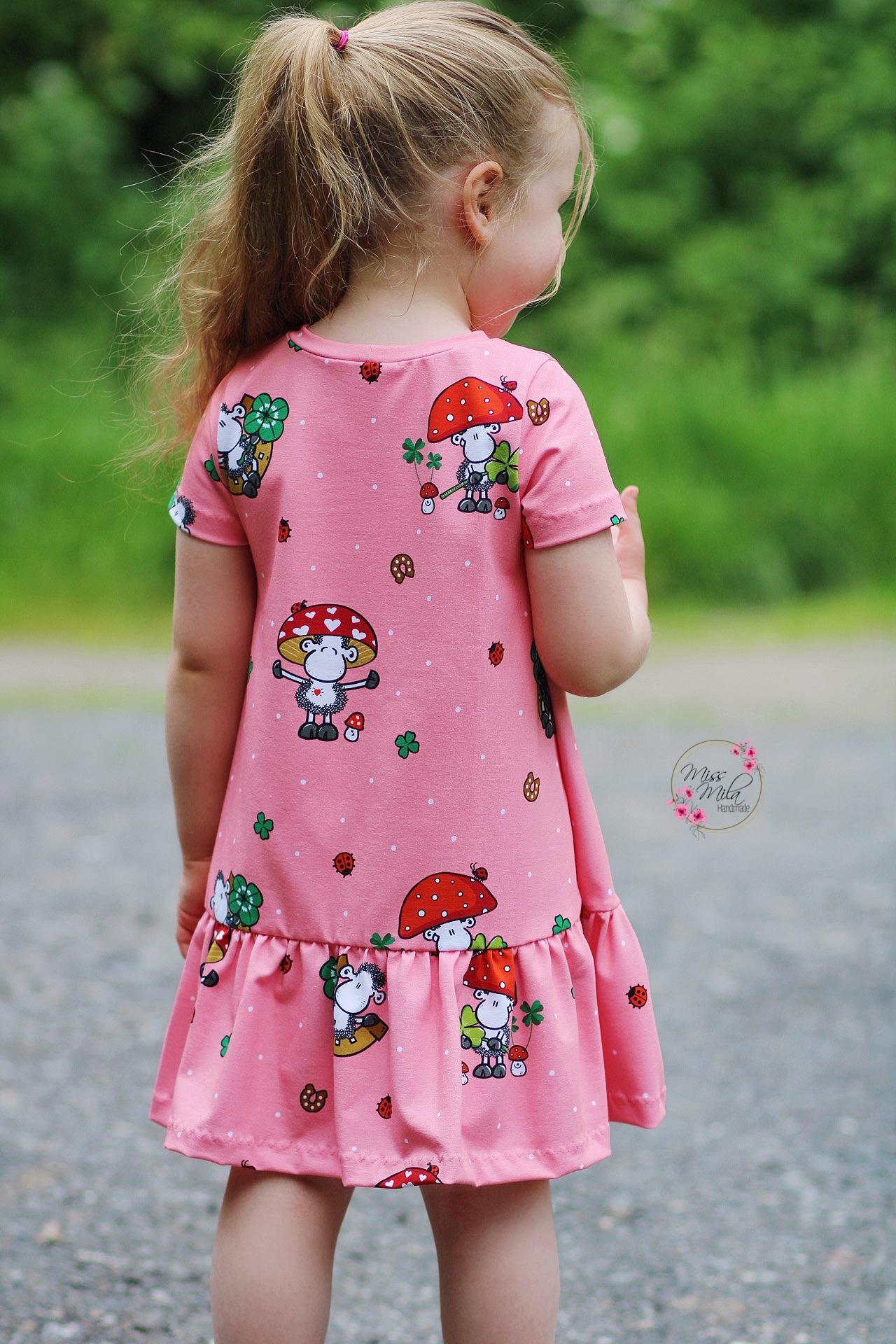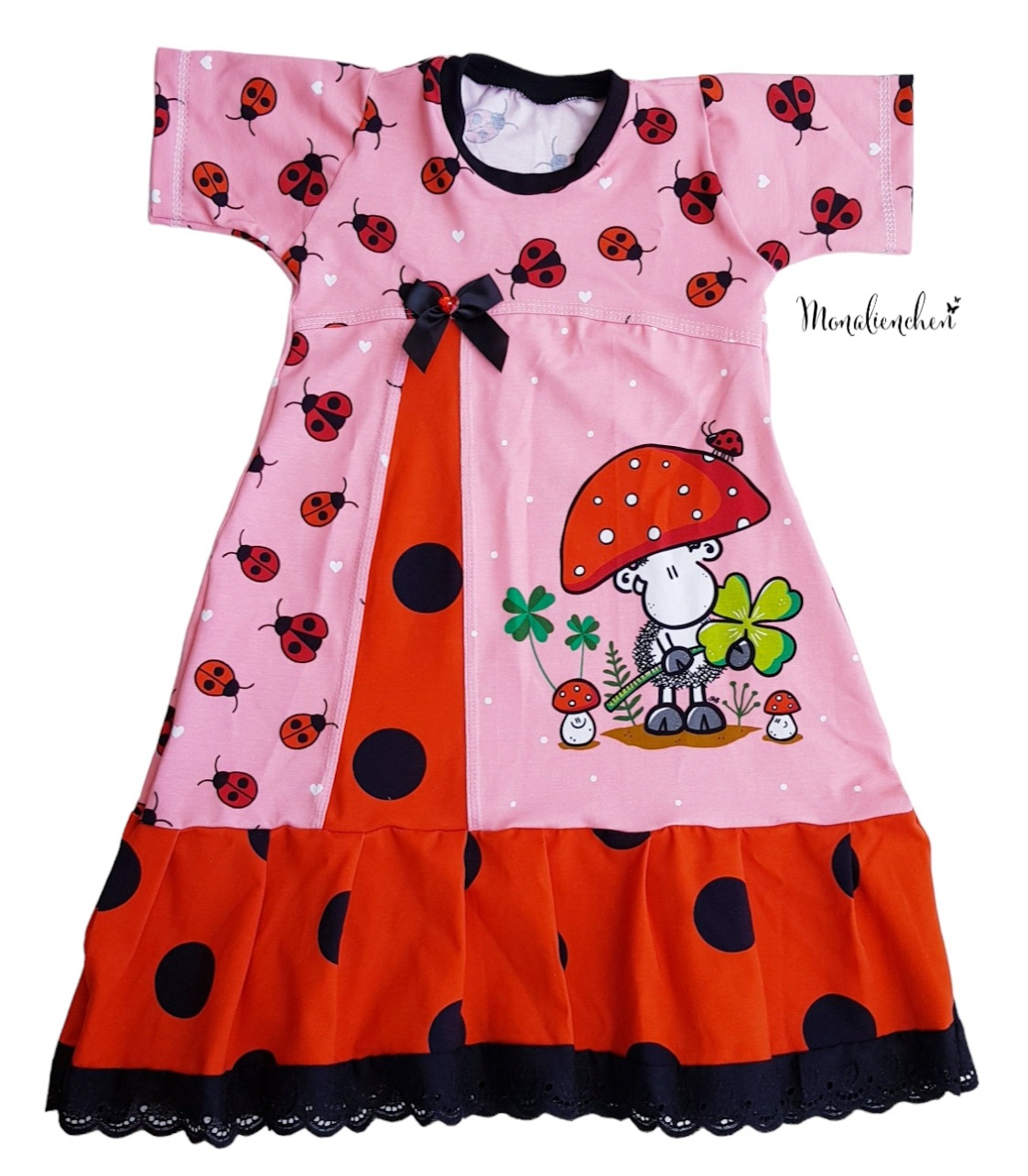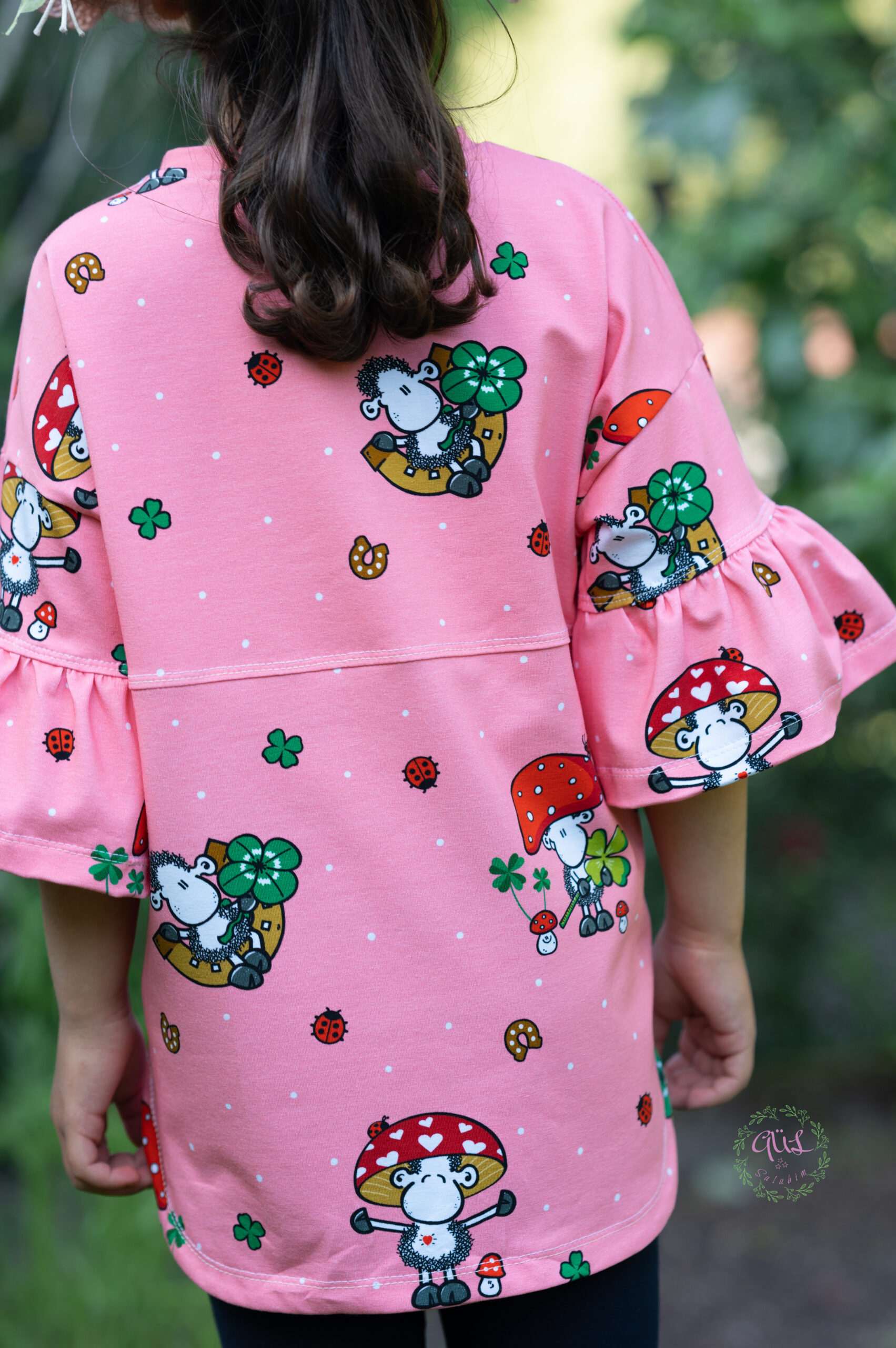 Den Hauptstoff „Glückspilz“ bekommt Ihr in zwei Farben: Rosa und Grün. Hier findet Ihr die Motive vom Panel in einer Größe von ca. 8 cm bis 9 cm (Schäfchen). Die weiteren über den Stoff verstreuten Motive wie Kleeblätter und Marienkäfer haben eine Höhe von ca. 2 cm.