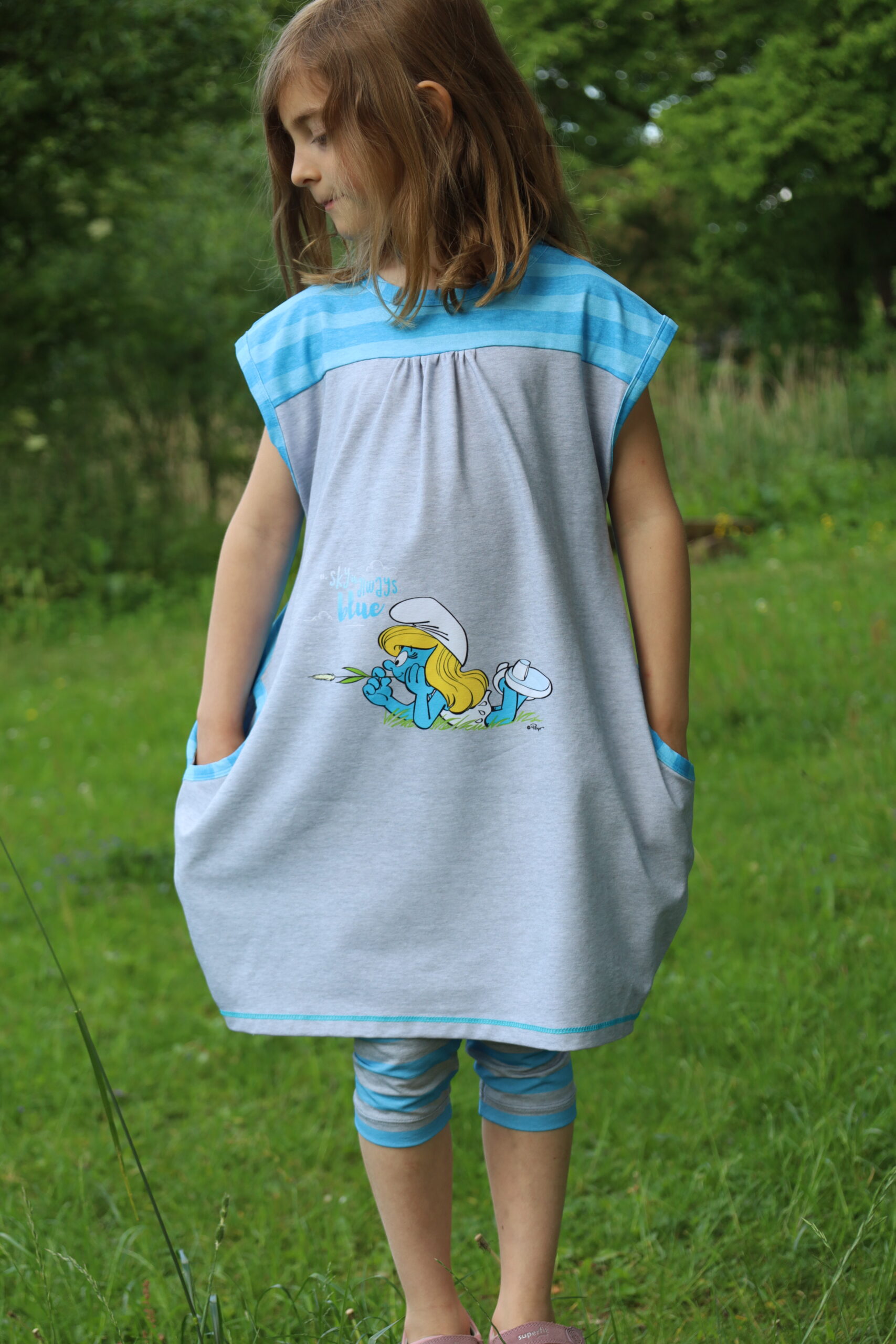 Die Panels haben keine Unterteilung und einen melierten Untergrund. Somit könnt Ihr Eure Schnittteile frei positionieren und einteilen. Das Panel mit Schlumpfine hat eine Höhe von. ca. 75 und das zweite Panel mit dem Schlumpf ist ca. 100 cm hoch. Dadurch ist es in vielen Größen vernähbar.