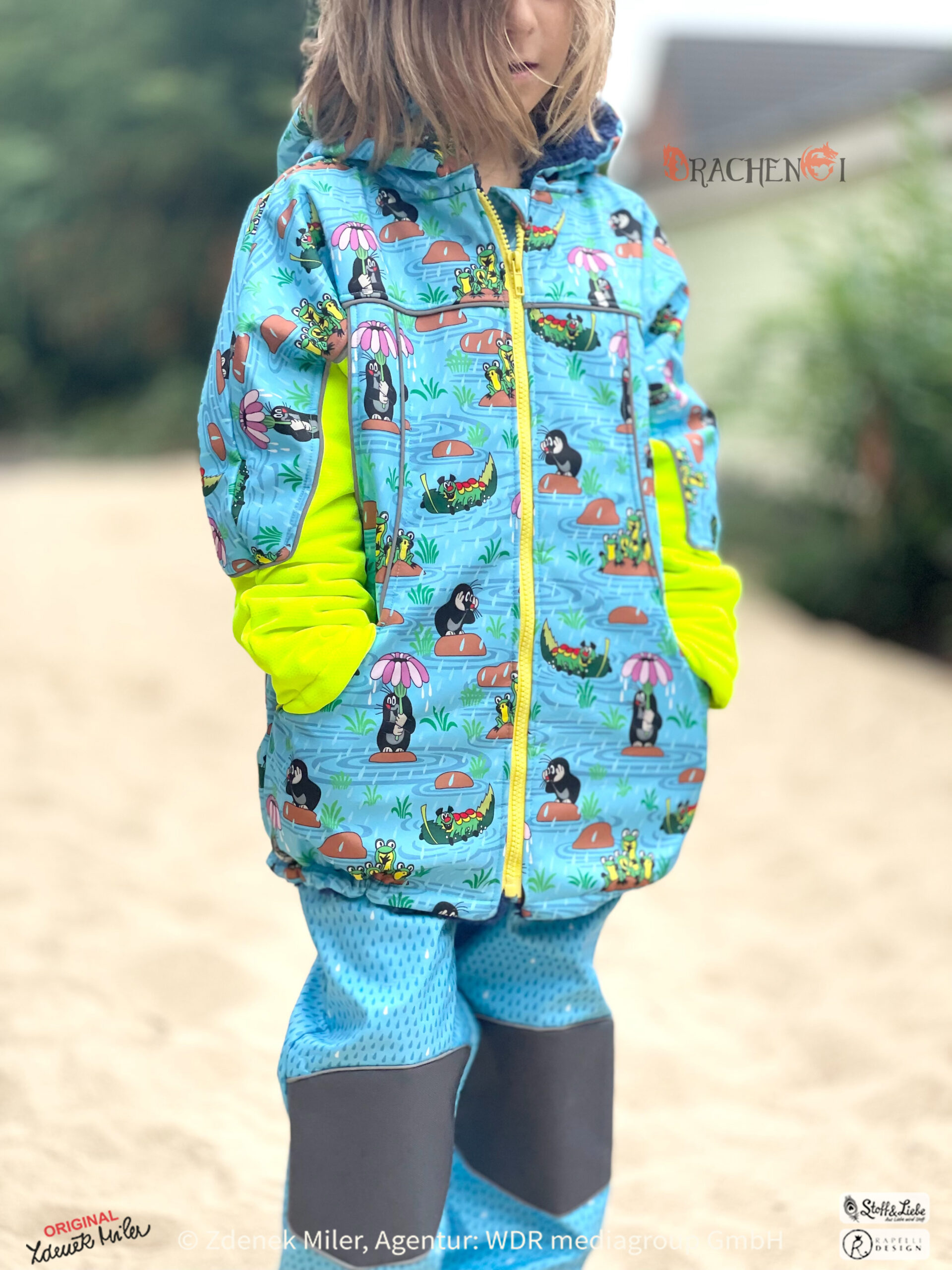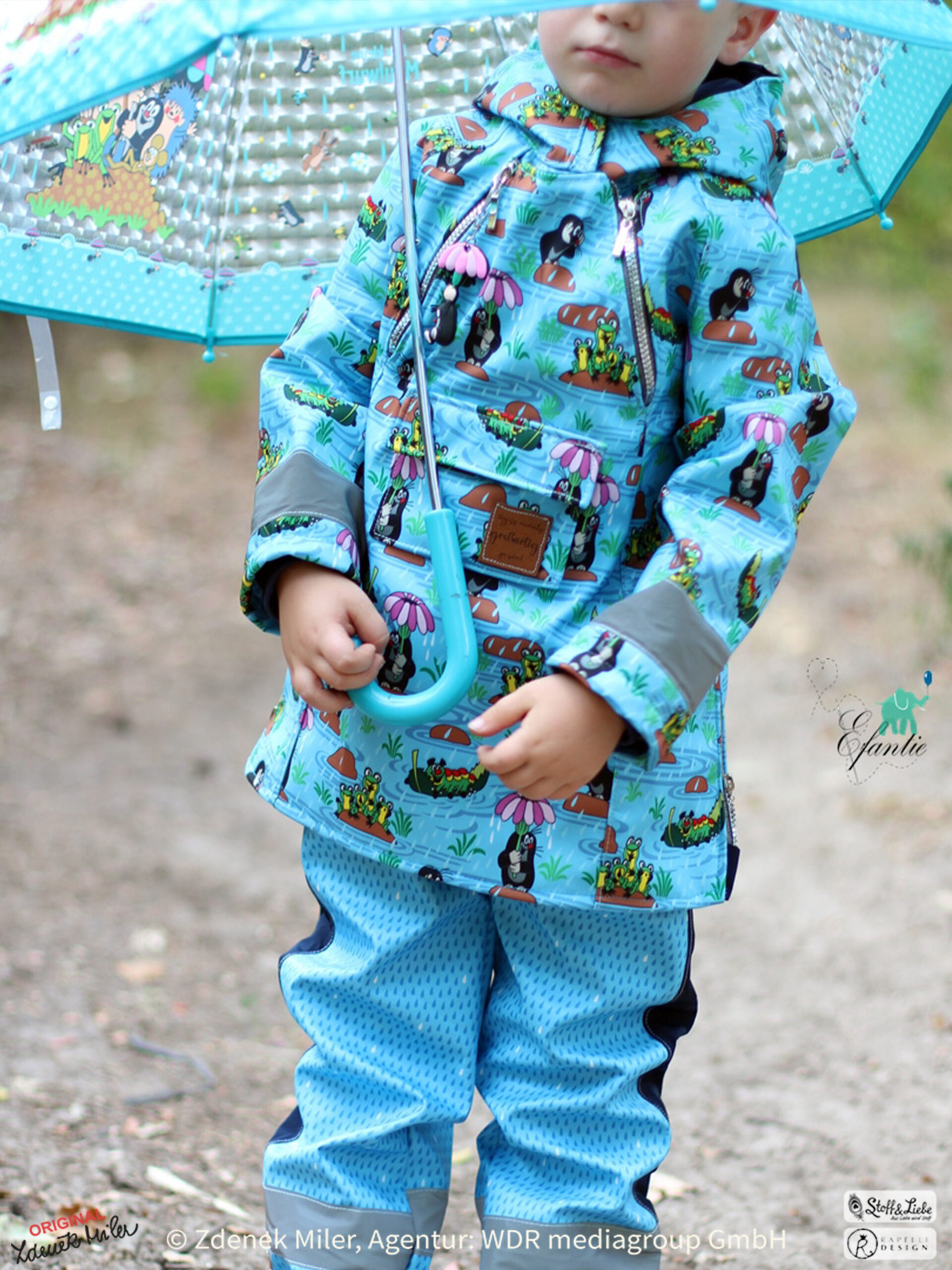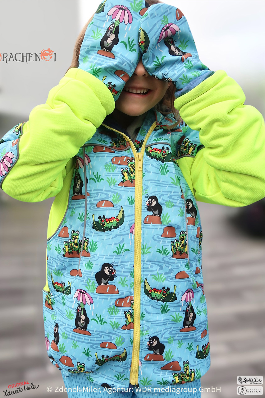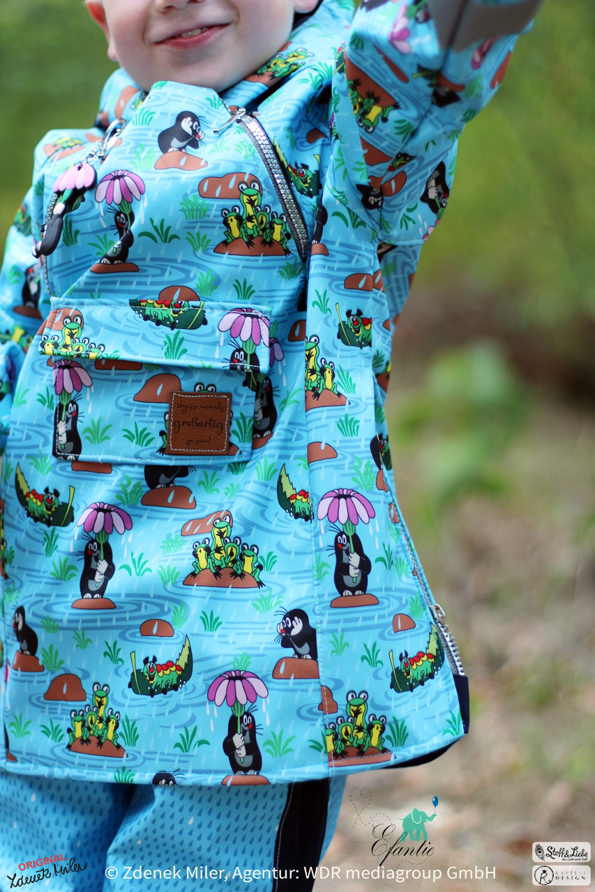 So langsam ist es Zeit schon mal an Herbstkleidung zu denken. Vor allem an Outdoorkleidung um Wind und Wetter zu trotzen, oder? Was wäre da besser geeignet als Softshell. Wir haben für diese Saison wunderschöne und vielfältige Designs auf Softshell für Euch vorbereitet. Den Anfang macht heute der kleine Maulwurf im bereits bekannten und von Euch geliebten Design „Regentag“ in einem frischen Hellblau.