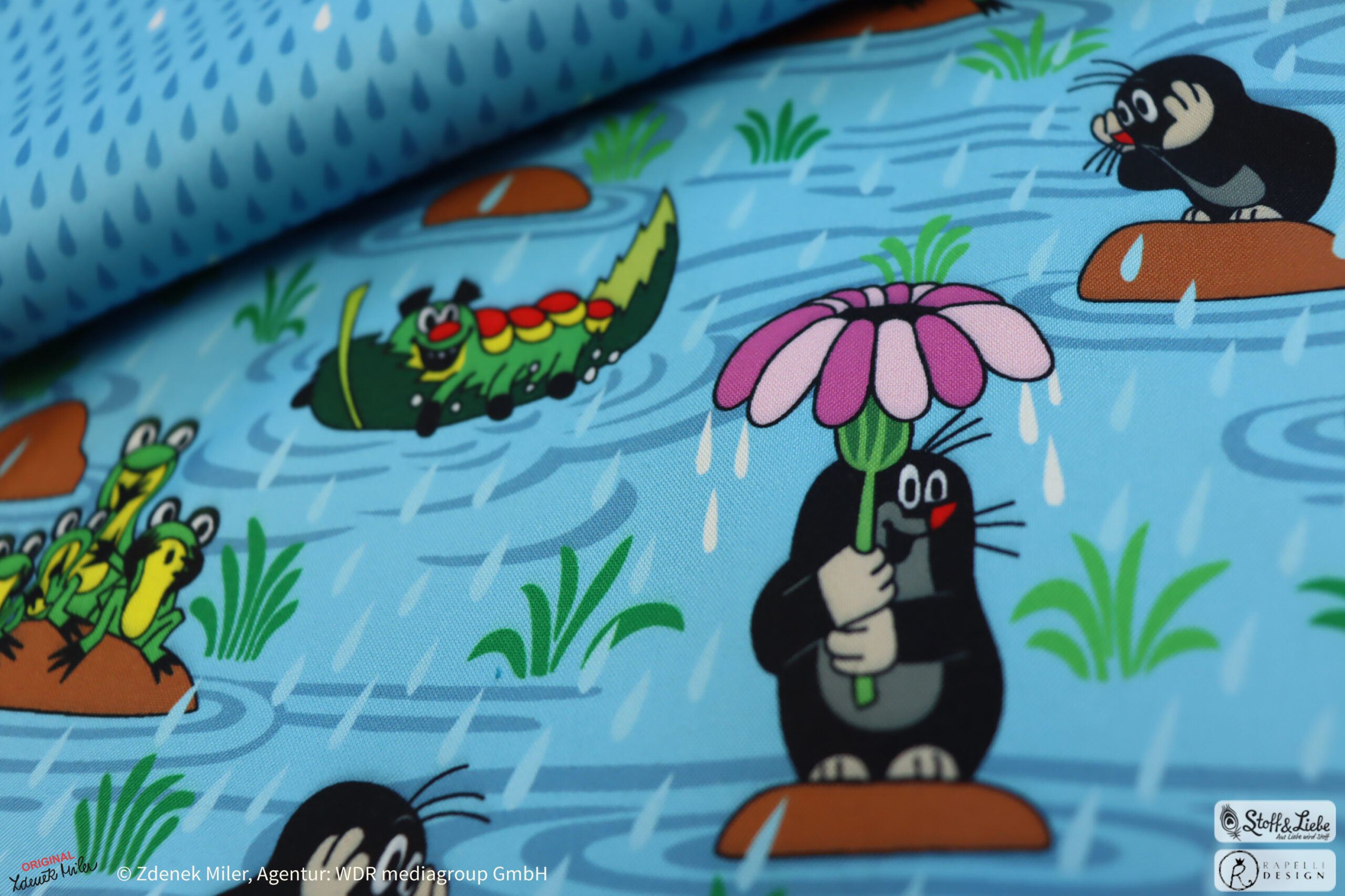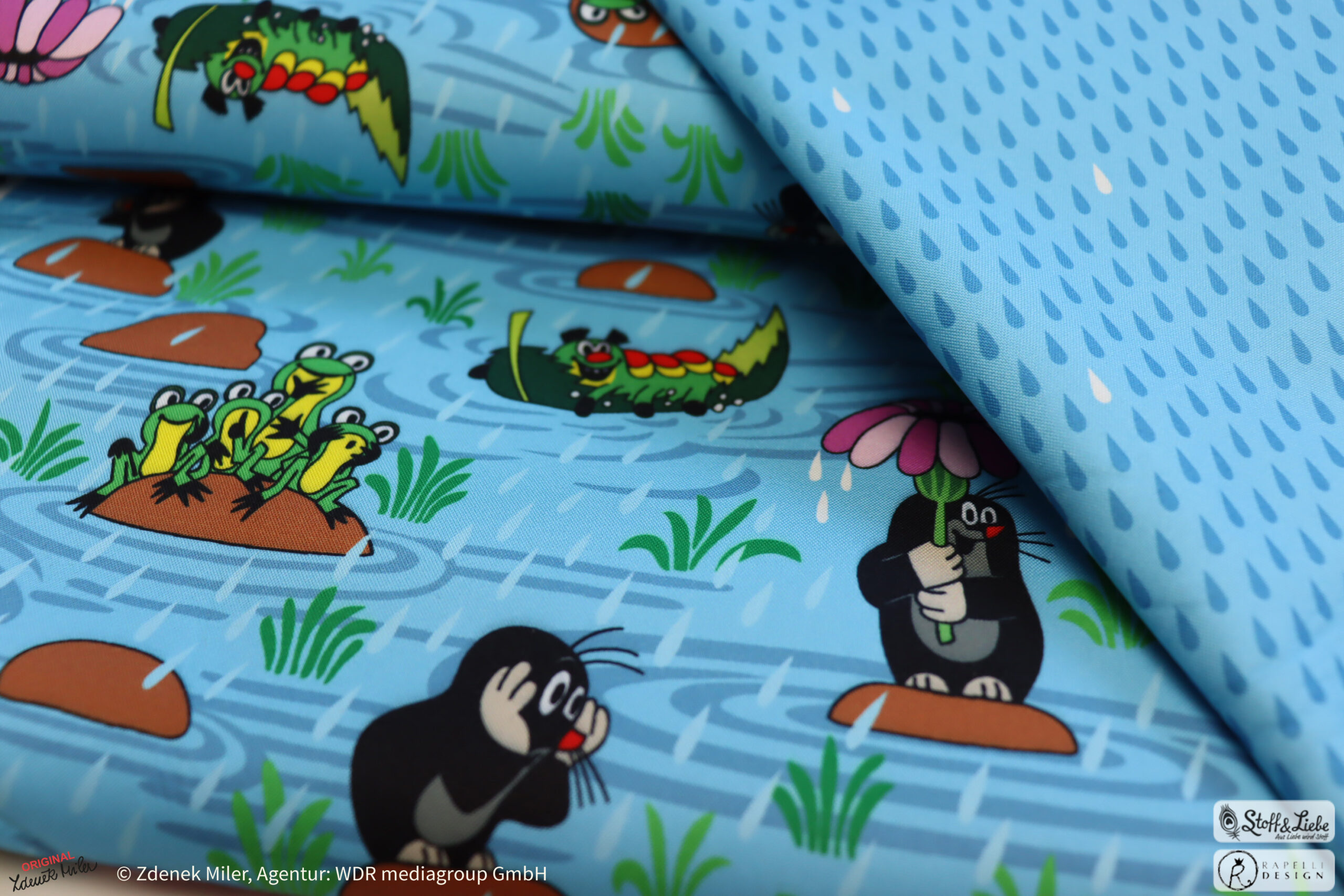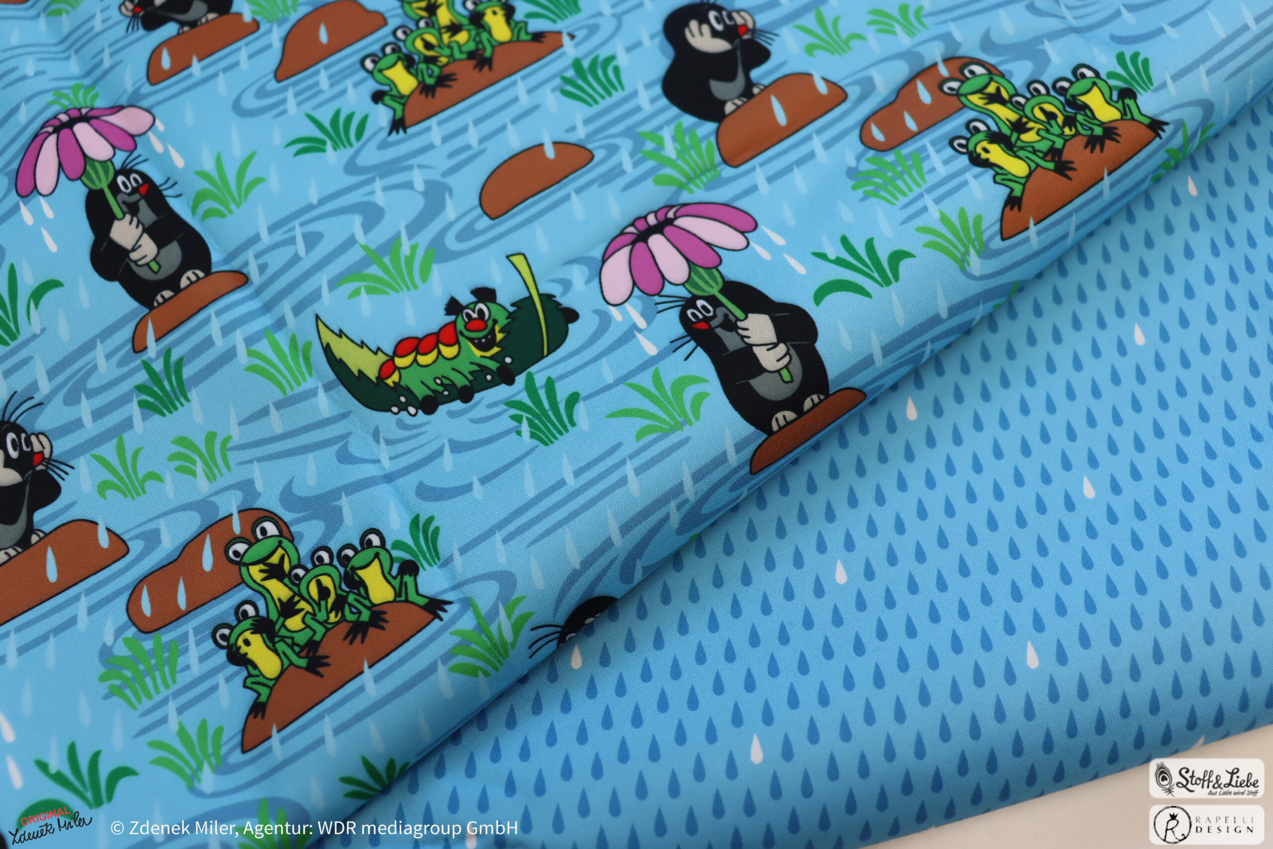Unsere „Der kleine Maulwurf – Regentag“ Kollektion wurde natürlich umgesetzt von Rapelli Design und hält das bekannte Allover-Motiv „Regentag“ samt Kombistoff, den Regentropfen für Euch bereit.