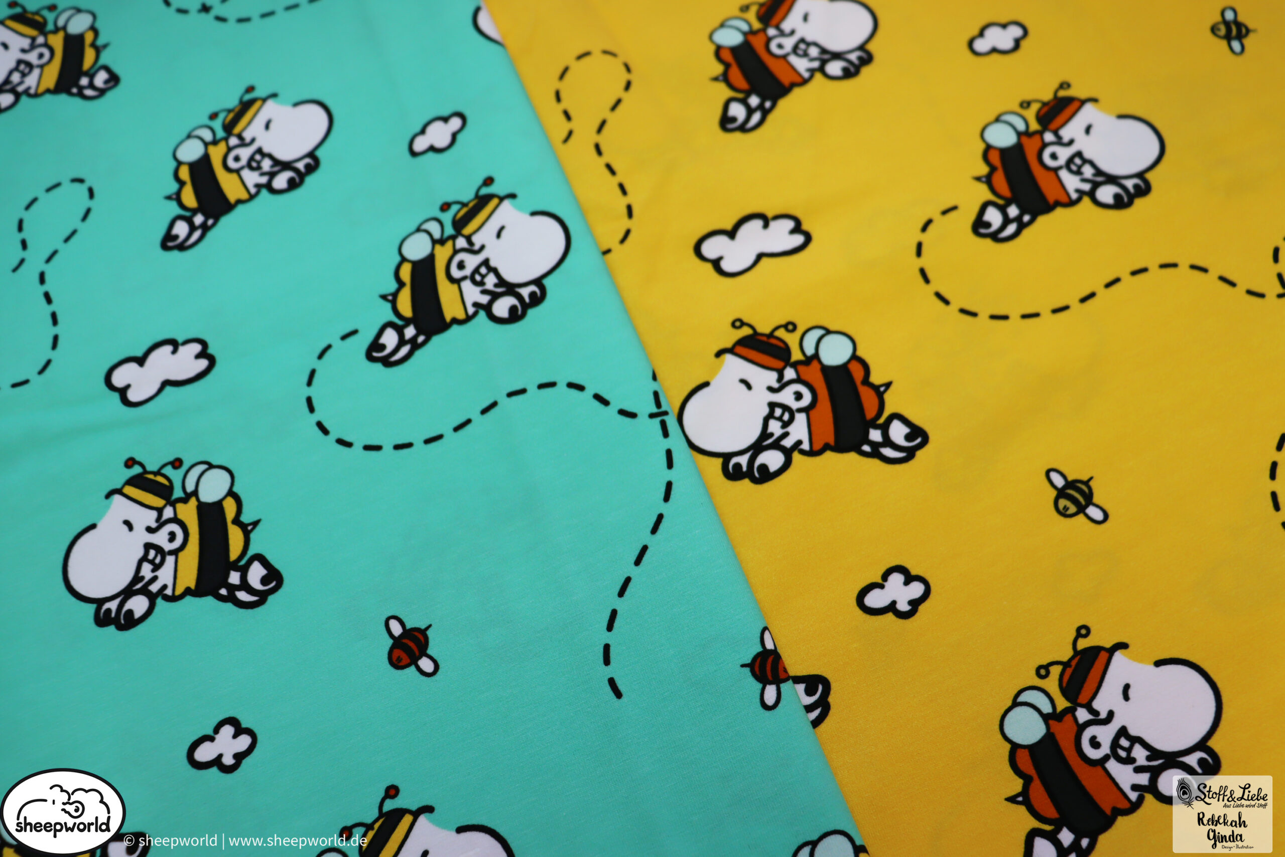 Unsere „sheepworld – Honigsüß“ Kollektion wurde umgesetzt von Rebekah Ginda Design. Wir haben für Euch ein Panel, einen Hauptstoff in zwei Farben und passend dazu zwei Kombistoffe, einer davon in drei Farbvarianten. Die Stoffe dieser Kollektionen erscheinen auf Jersey und haben eine Materialzusammensetzung von 95% Baumwolle und 5% Elasthan.