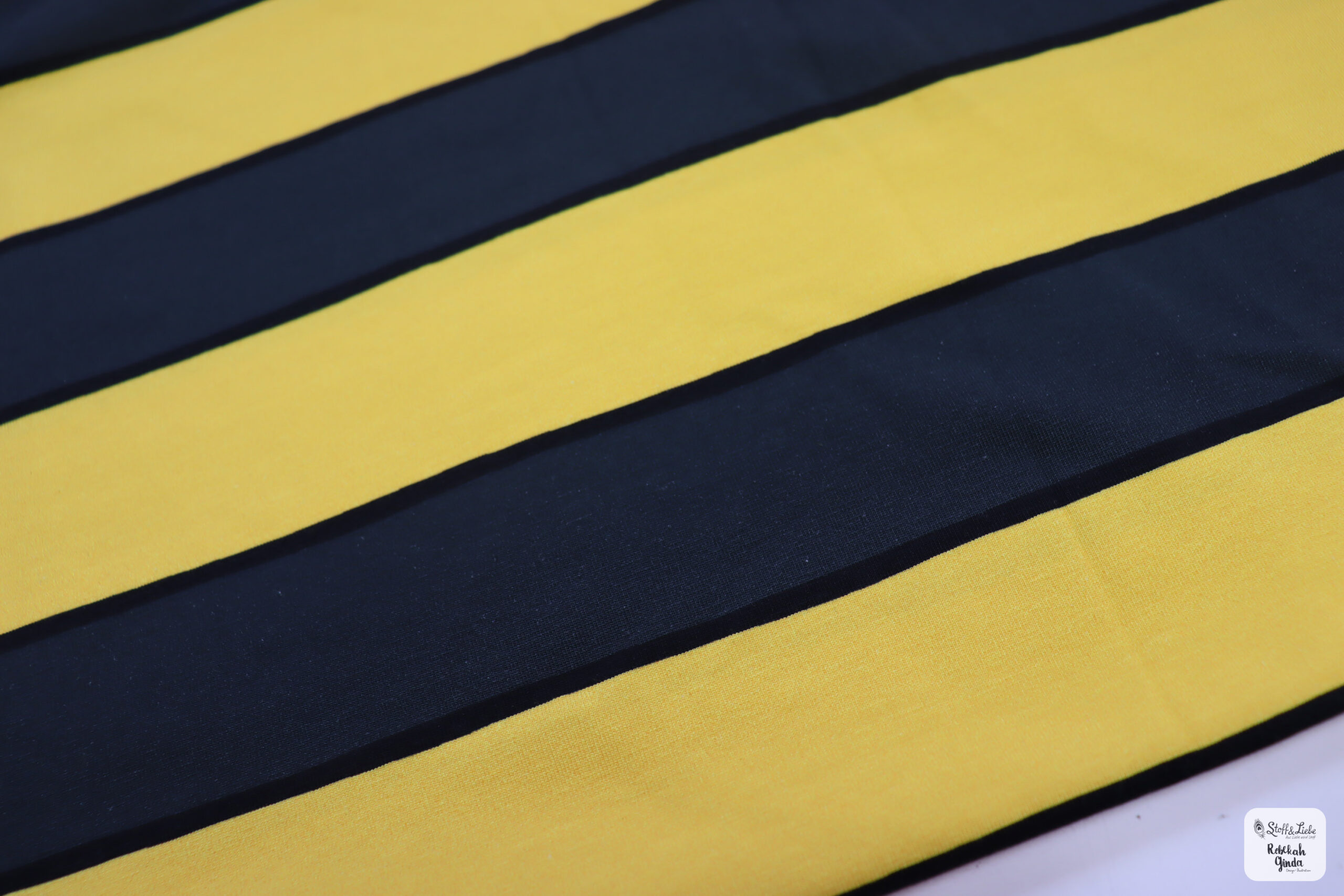 Hier treffen Gelb (ca. 4,5 cm) und Dunkelgrau (ca. 3,7) aufeinander, unterbrochen von schmalen schwarzen Streifen (ca. 0,5 cm). Die Unregelmäßigkeit der Streifen verleiht diesem Stoff das gewisse Etwas und macht ihn vielfältig einsetzbar.