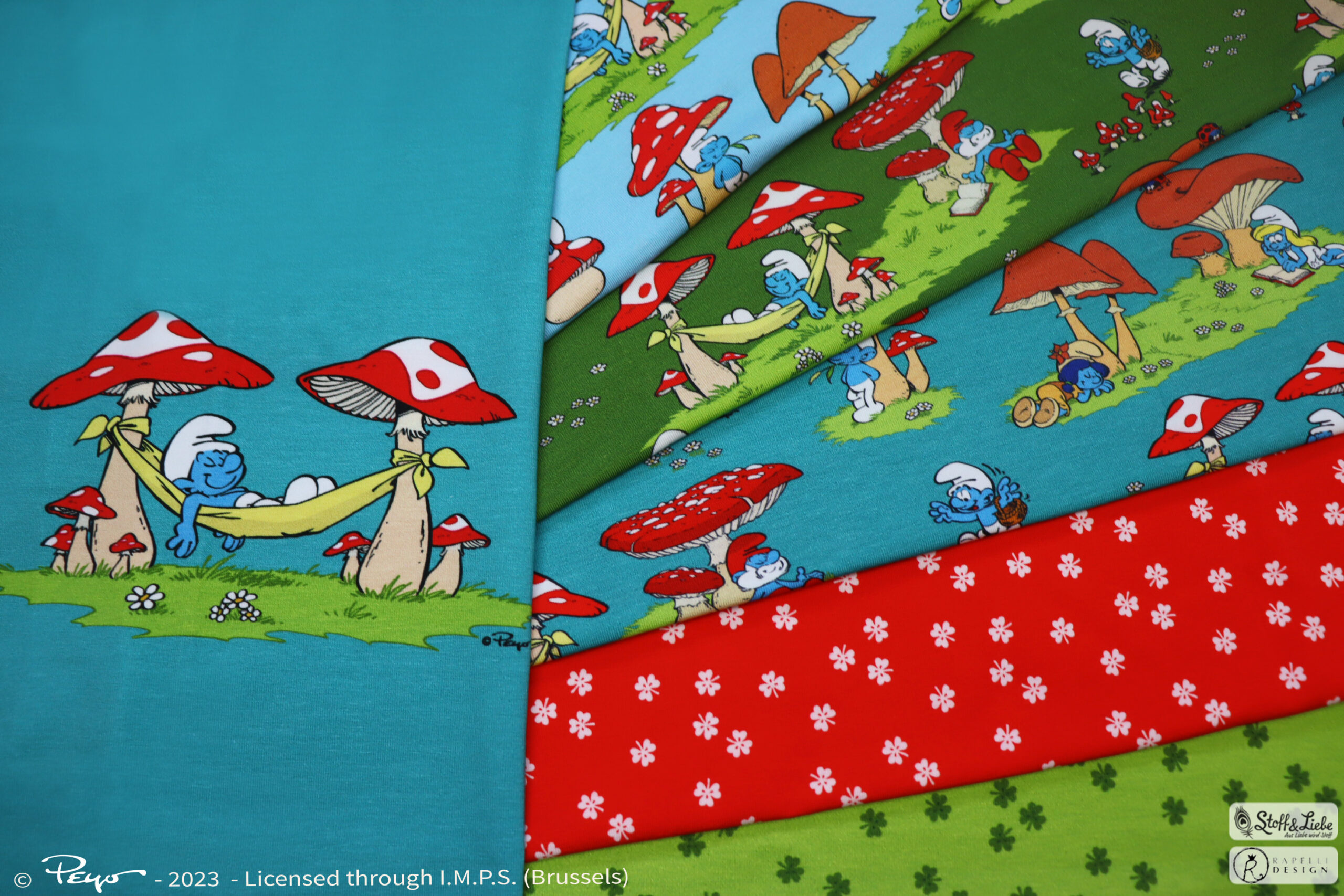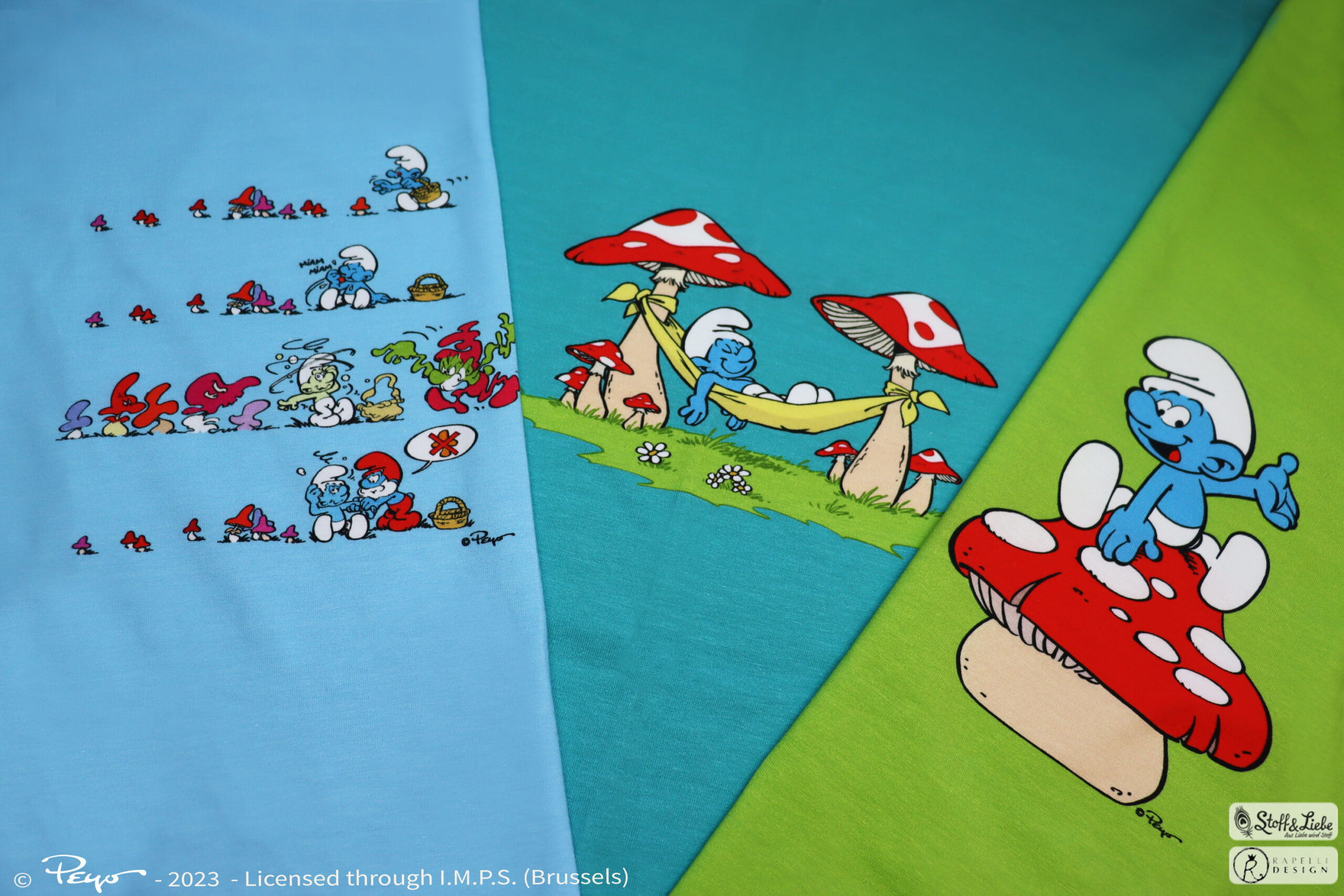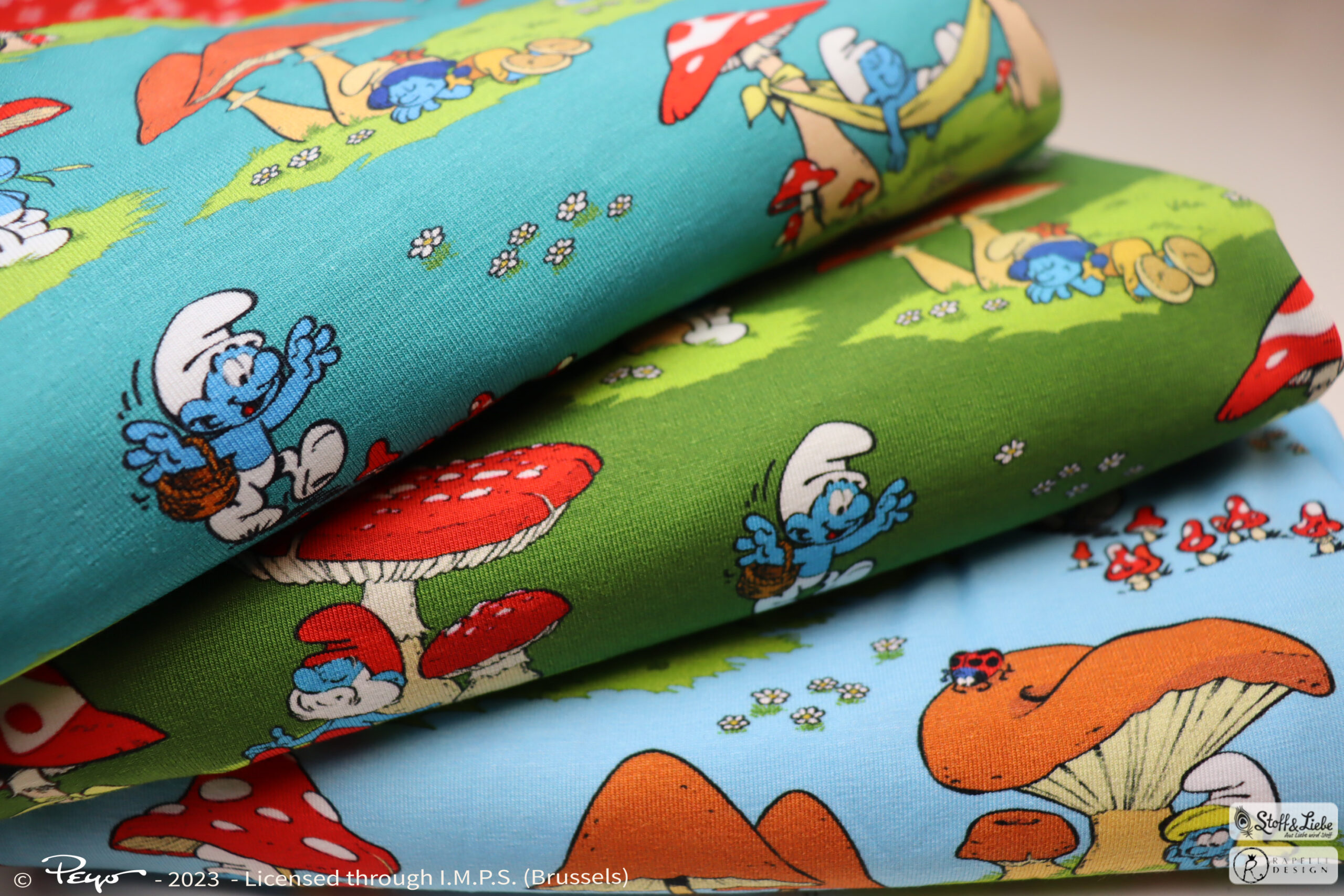 Als Hauptstoff haben wir den Allover „Glücksschlümpfe“ für Euch. Hier könnt Ihr zwischen Petrol, Olivgrün und Hellblau wählen. Was heißt wählen, könnt Ihr Euch überhaupt für eine Farbe entscheiden?