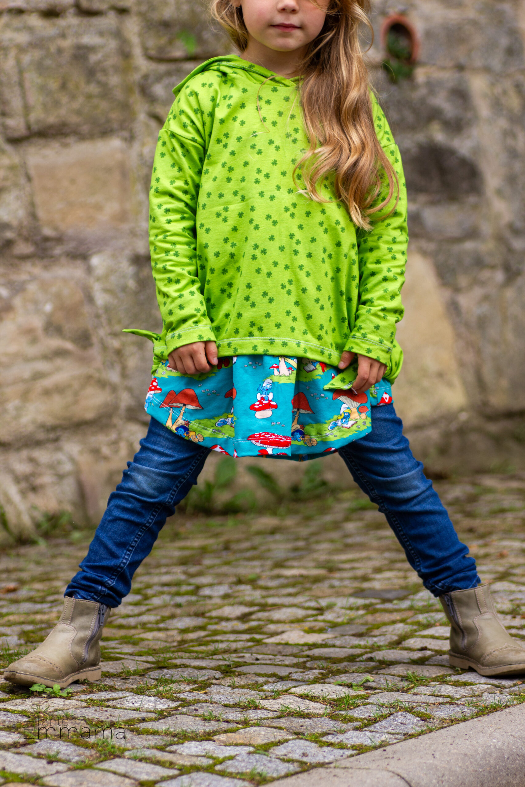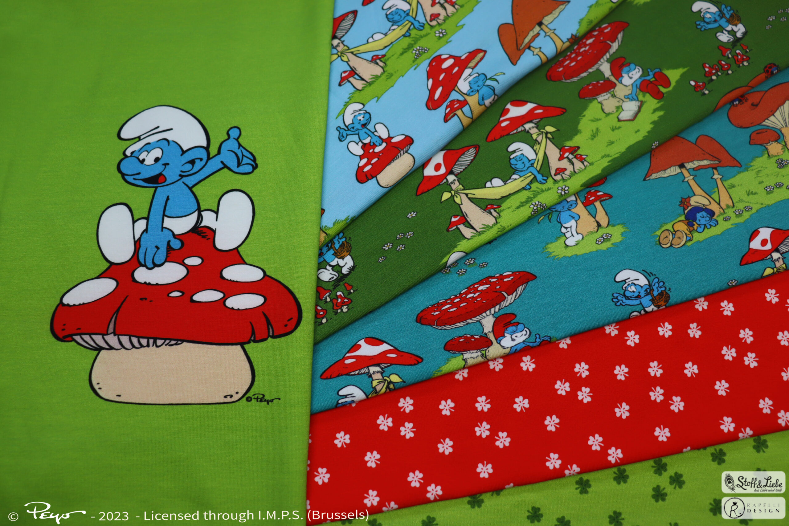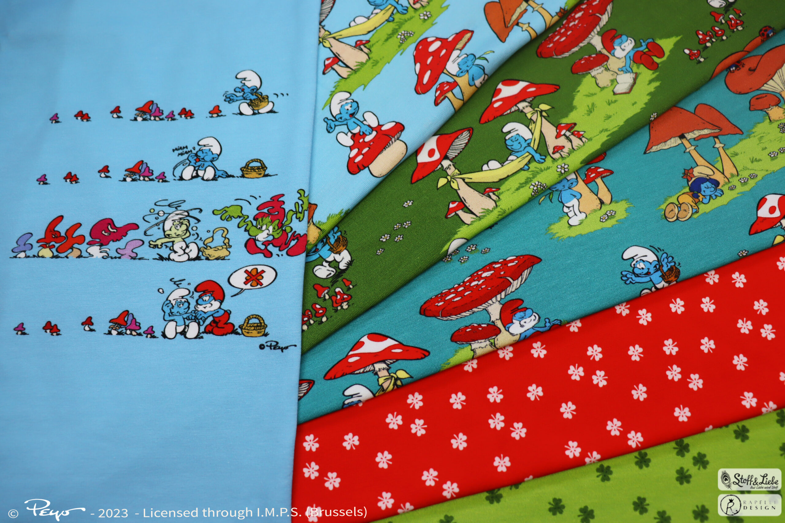 Als Hauptstoff haben wir den Allover „Glücksschlümpfe“ für Euch. Hier könnt Ihr zwischen Petrol, Olivgrün und Hellblau wählen. Was heißt wählen, könnt Ihr Euch überhaupt für eine Farbe entscheiden?