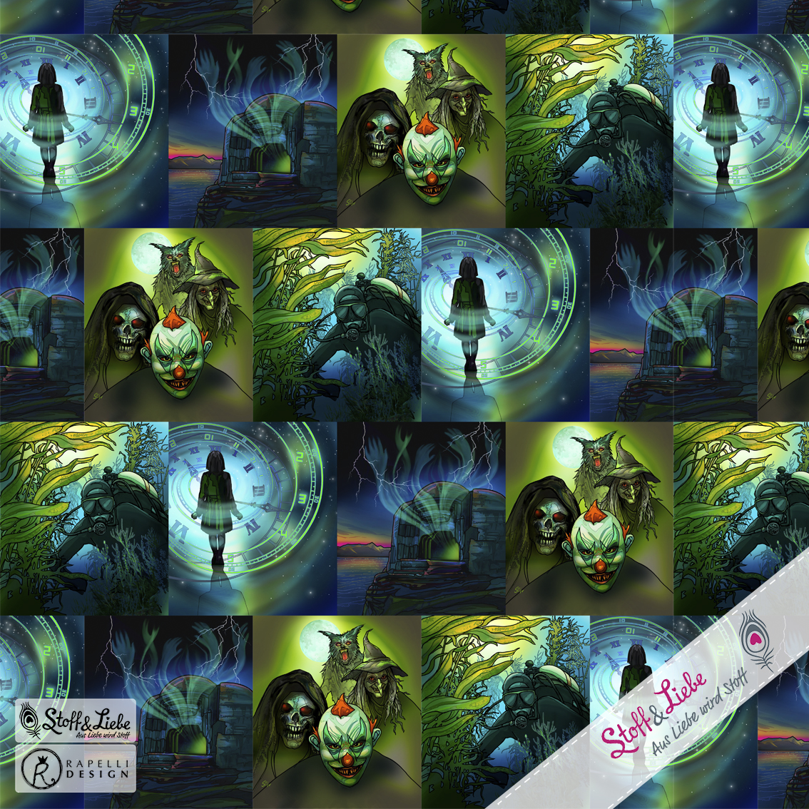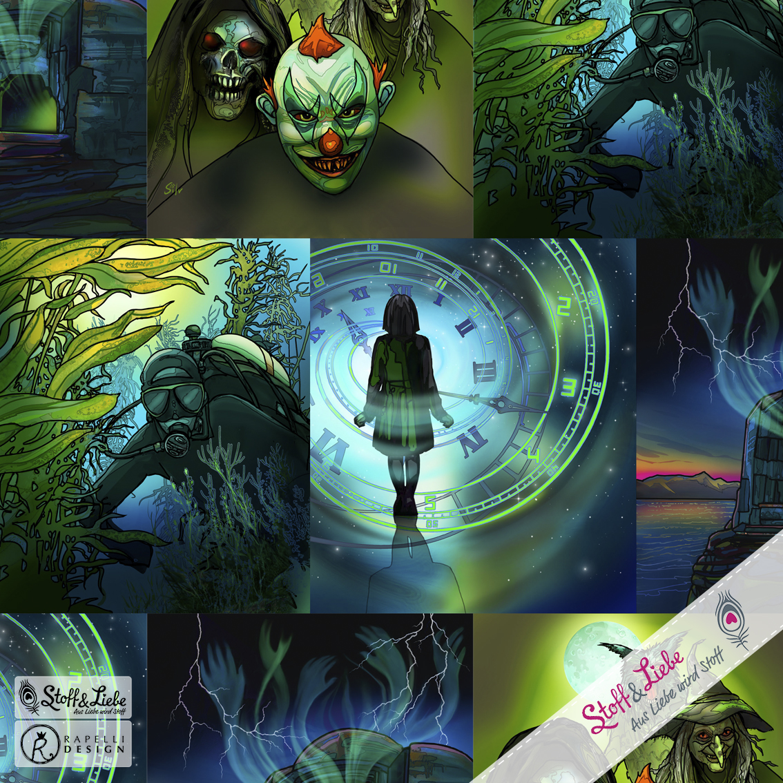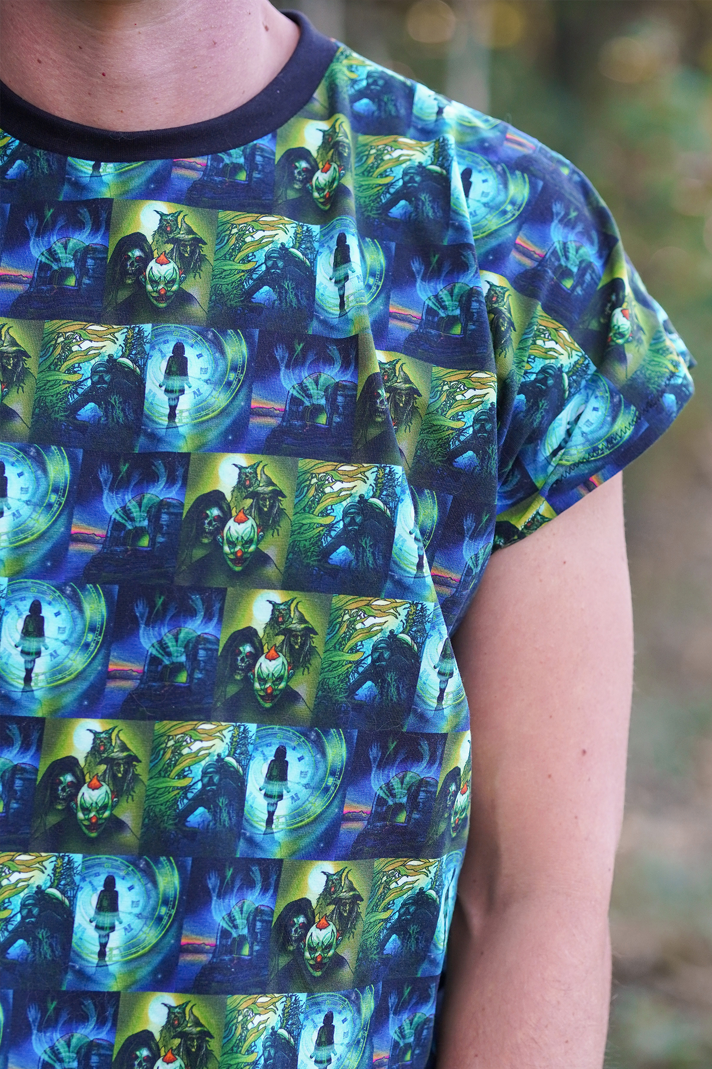 Als Allover haben wir diesmal diesen absolut coolen Stoff für Euch. Die Klassiker „Kreaturen der Nacht, Tauchgang ins Ungewisse, der Geisterbunker und Die Zeitreisende“ vereint auf einem Stoff. Die Kästchen haben eine Höhe von ca. 6,5 cm. Dadurch eignet sich dieser Stoff für Nähstücke in vielen Größen, ohne überladen zu wirken. Ob Ihr ihn solo vernäht oder mit Unistoffen kombiniert, er wird alle Blicke auf sich ziehen. Sicher wird nicht jeder sofort erkennen, was für Motive Ihr tragt, es sei denn, Ihr arbeitet noch einen Hinweis ein. Habt Ihr schon Ideen für diesen Stoff? Wie wäre es mit einer Jacke, vielleicht im College Stil? Oder ein lässiges Shirt? Jede Menge Möglichkeiten warten wieder auf Euch.