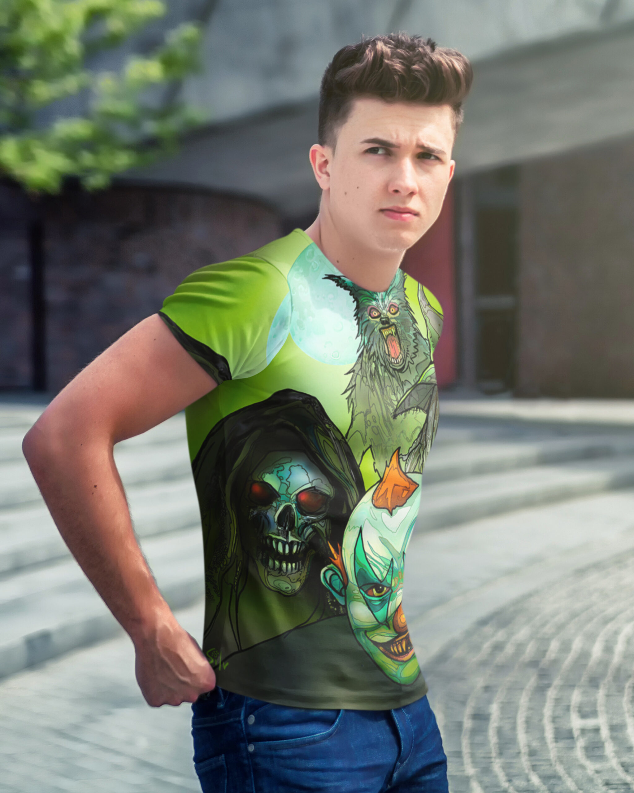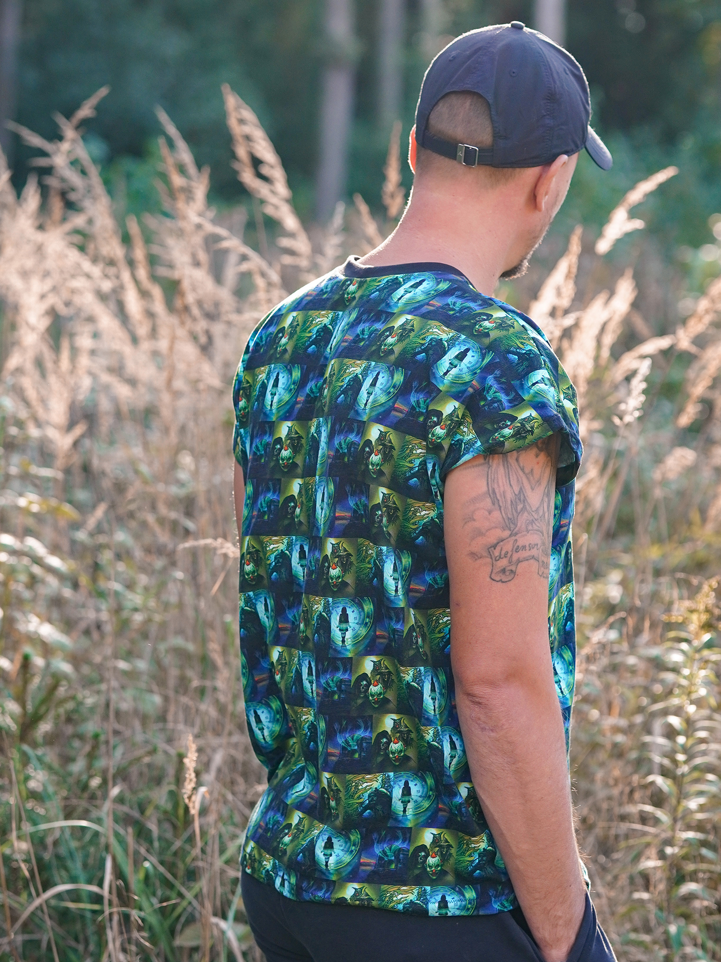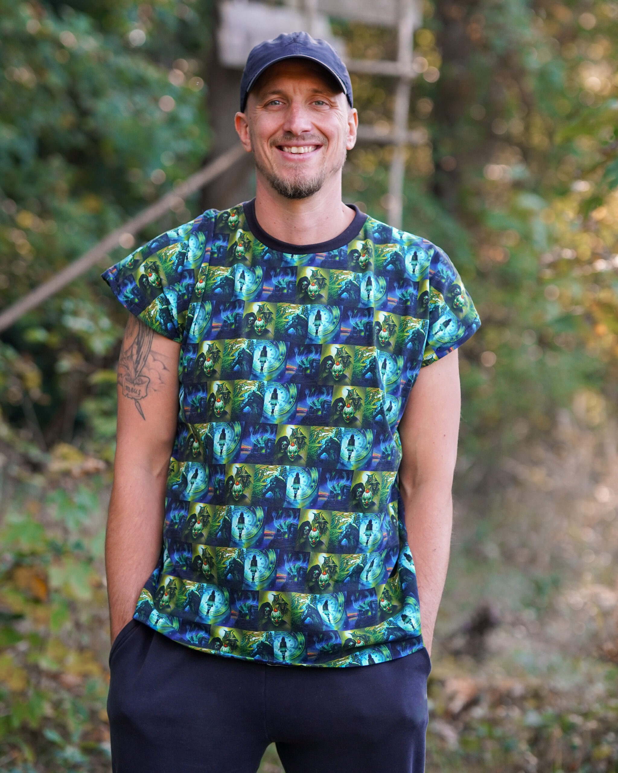 Als Allover haben wir diesmal diesen absolut coolen Stoff für Euch. Die Klassiker „Kreaturen der Nacht, Tauchgang ins Ungewisse, der Geisterbunker und Die Zeitreisende“ vereint auf einem Stoff. Die Kästchen haben eine Höhe von ca. 6,5 cm. Dadurch eignet sich dieser Stoff für Nähstücke in vielen Größen, ohne überladen zu wirken. Ob Ihr ihn solo vernäht oder mit Unistoffen kombiniert, er wird alle Blicke auf sich ziehen. Sicher wird nicht jeder sofort erkennen, was für Motive Ihr tragt, es sei denn, Ihr arbeitet noch einen Hinweis ein. Habt Ihr schon Ideen für diesen Stoff? Wie wäre es mit einer Jacke, vielleicht im College Stil? Oder ein lässiges Shirt? Jede Menge Möglichkeiten warten wieder auf Euch.