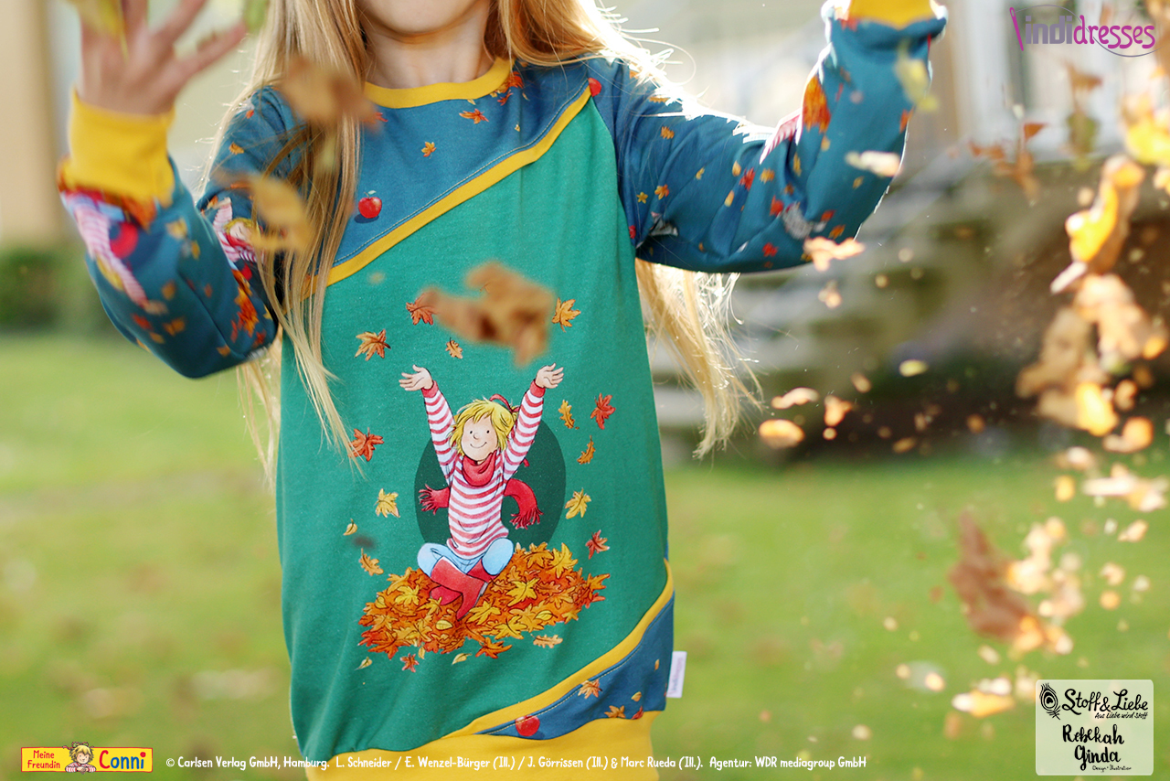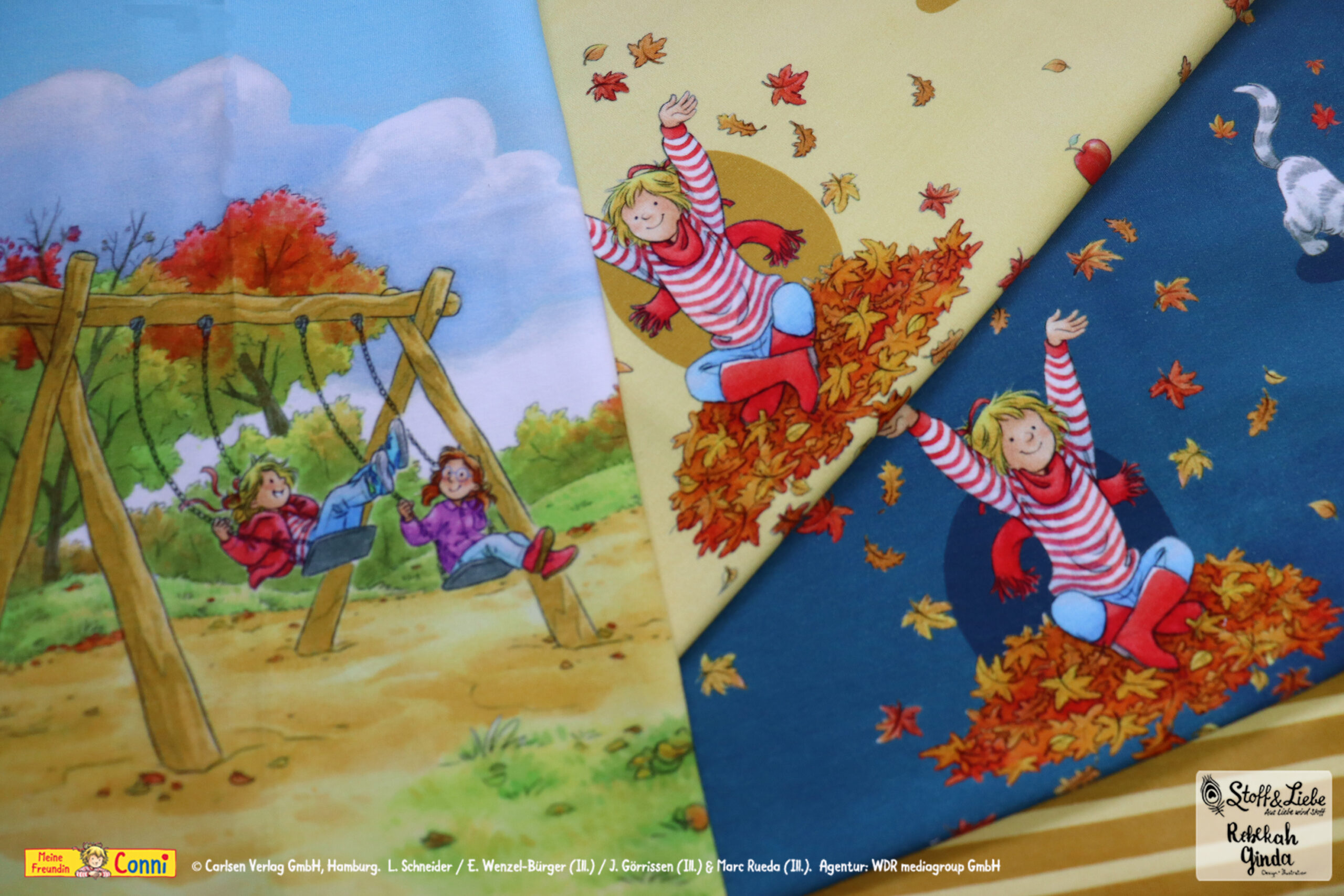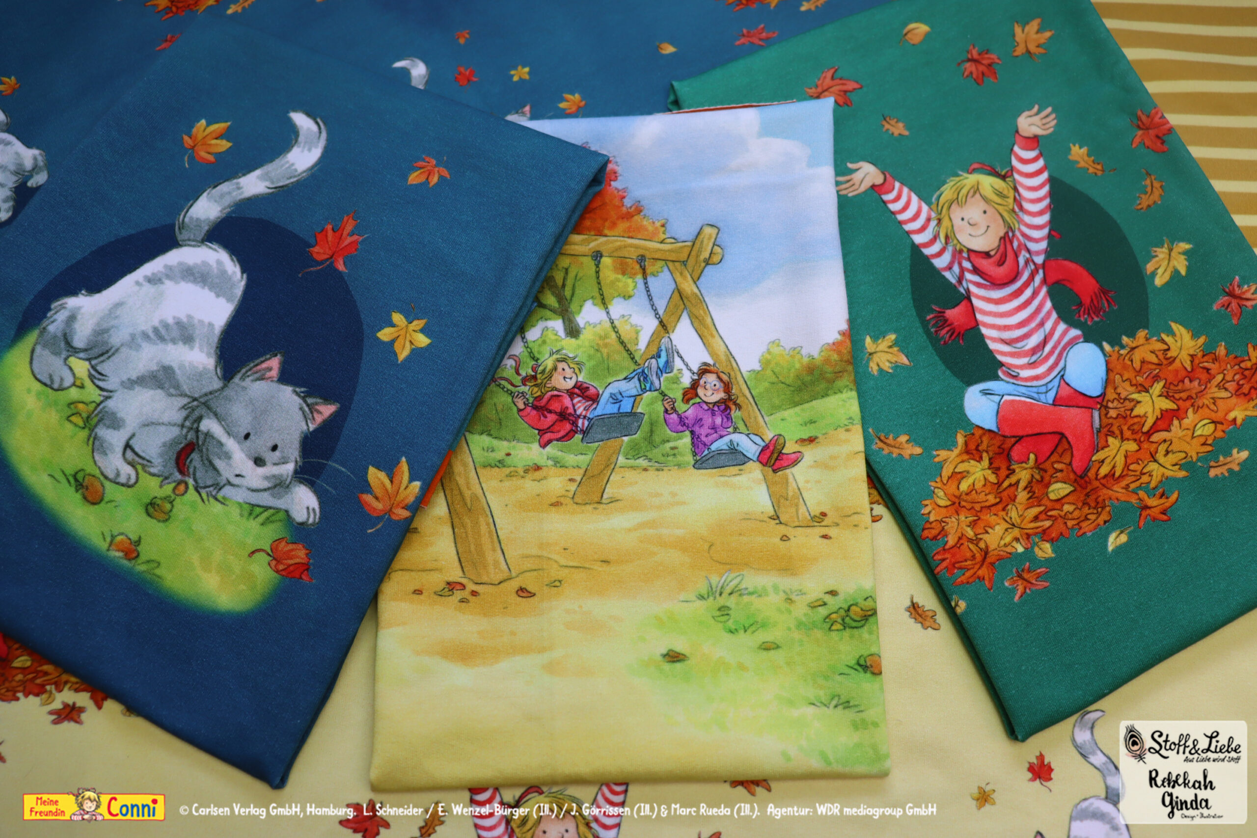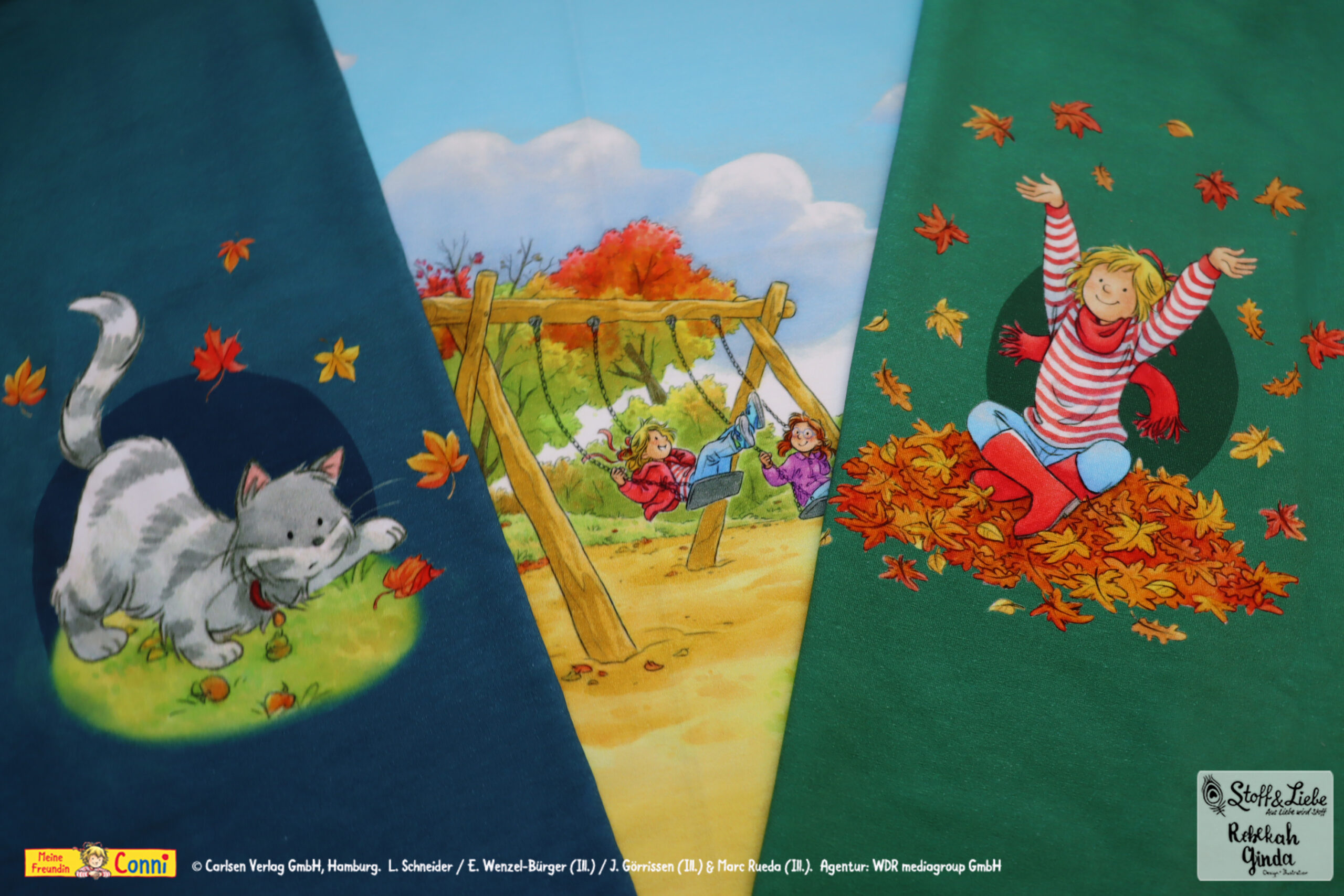 Auf dem Panel, mit einer Höhe von ca. 65 cm, findet Ihr drei Motivabschnitte. Motive, die Lust auf den kommenden Herbst machen. Zwei der Panelmotive haben einen Hintergrund mit leichtem Farbverlauf: Mau auf Petrol und Conni auf Grün, jeweils umgeben von bunten Herbstblättern. Das dritte Motiv ist ein vollflächiges Motiv mit einer zauberhaften Spielplatzszene. Hier gibt es so viele Details zu entdecken, die es zulassen, eine eigene Geschichte zu erzählen.