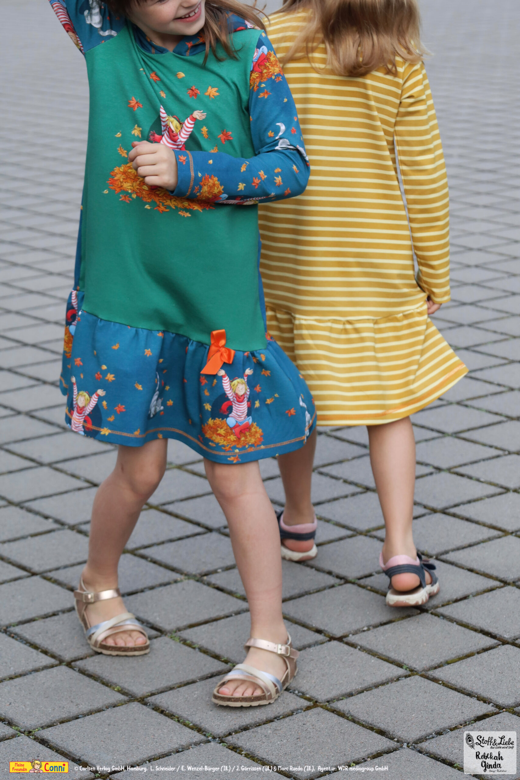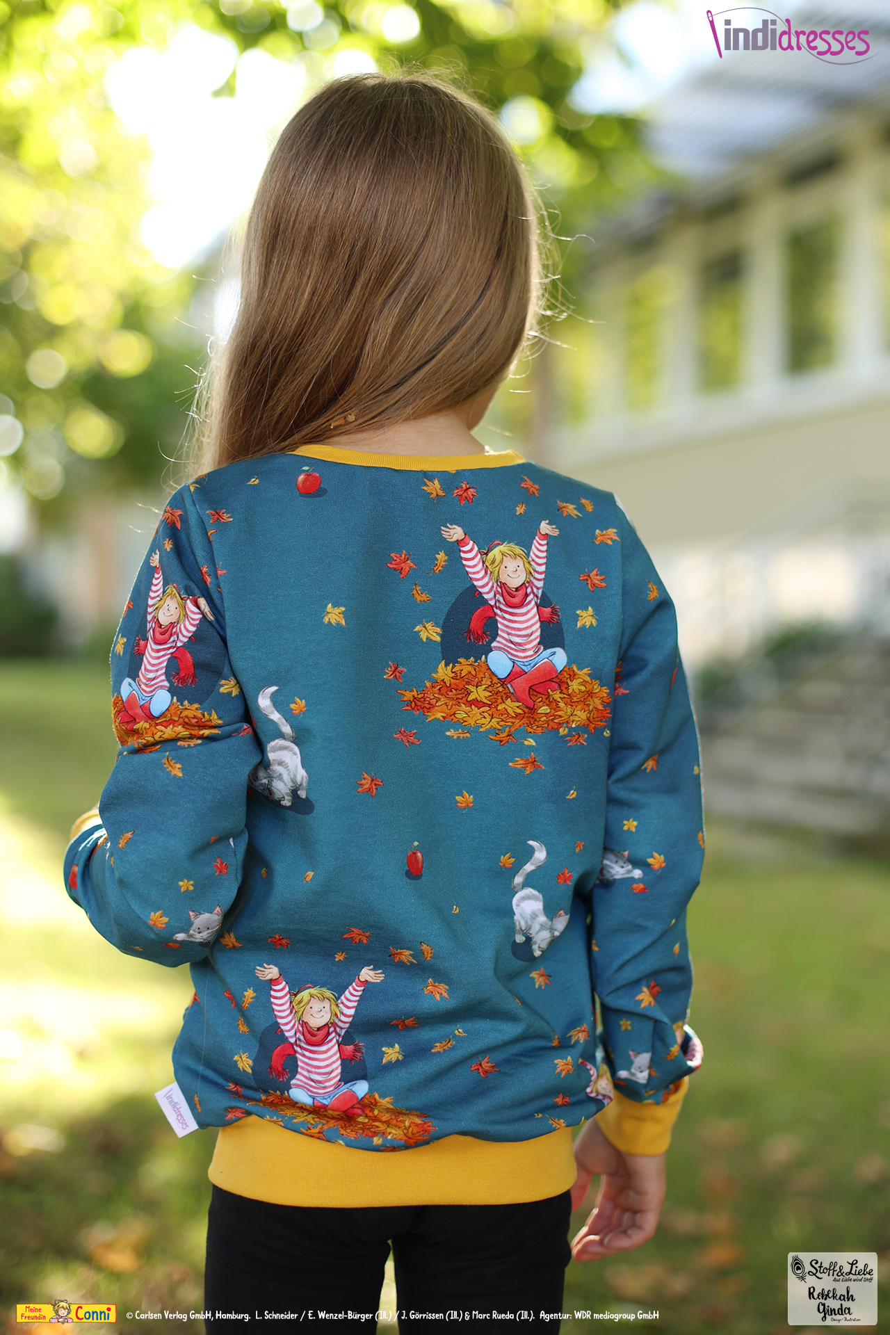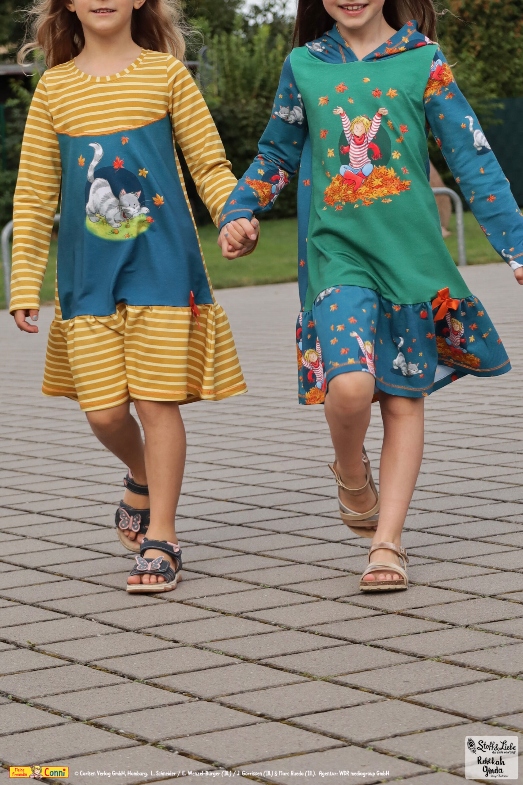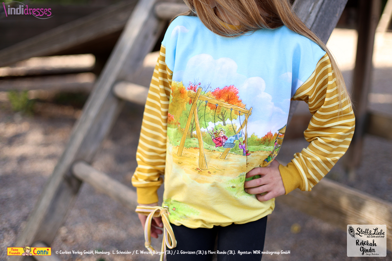 Auf dem Panel, mit einer Höhe von ca. 65 cm, findet Ihr drei Motivabschnitte. Motive, die Lust auf den kommenden Herbst machen. Zwei der Panelmotive haben einen Hintergrund mit leichtem Farbverlauf: Mau auf Petrol und Conni auf Grün, jeweils umgeben von bunten Herbstblättern. Das dritte Motiv ist ein vollflächiges Motiv mit einer zauberhaften Spielplatzszene. Hier gibt es so viele Details zu entdecken, die es zulassen, eine eigene Geschichte zu erzählen.