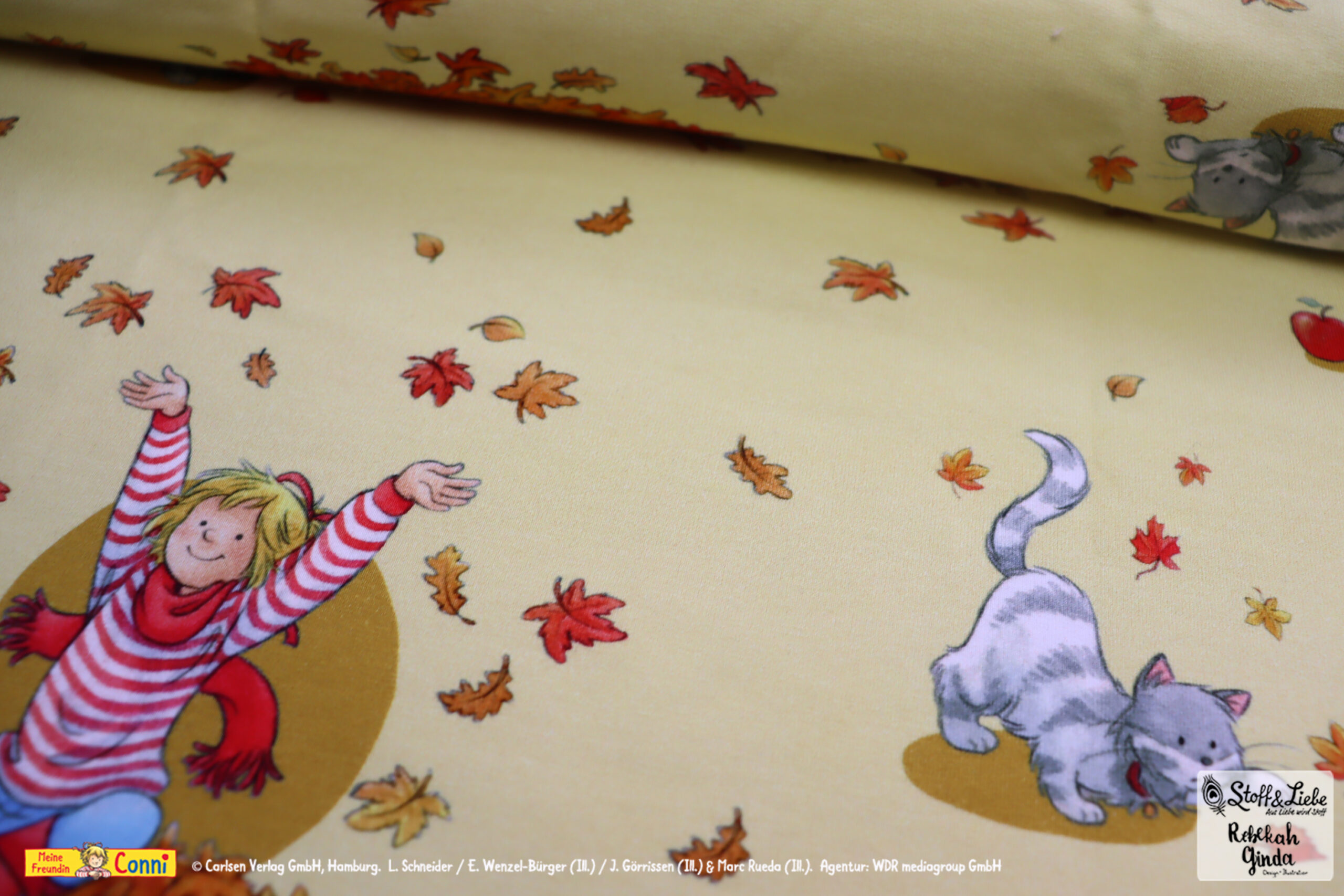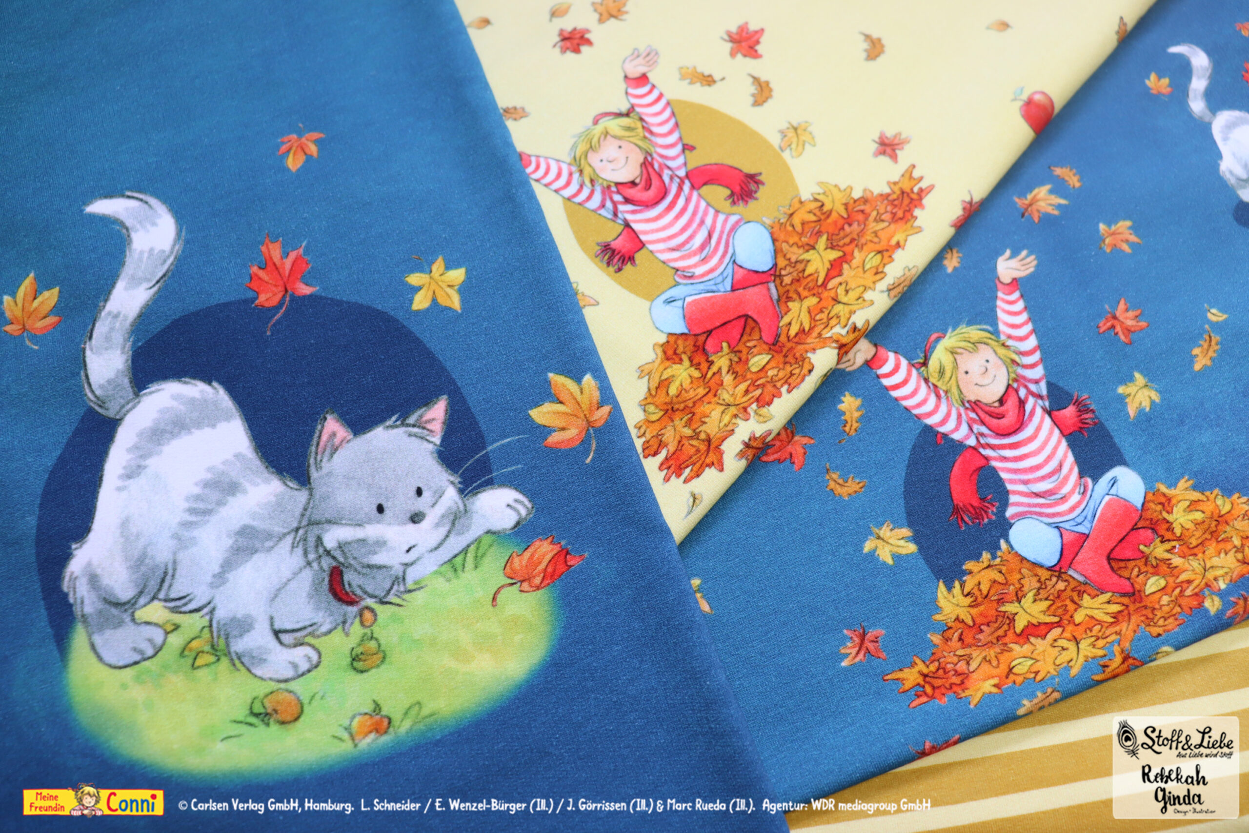 Den Allover dieser Serie „Goldener Herbst“ haben wir für Euch in zwei Farbvarianten: Gelb und Petrol. Passend zu den Panelmotiven findet Ihr hier Conni im Mau spielend im Laub. Aufgelockert wird der Allover durch Äpfel und weiteres Laub. Die Motive haben eine Größe von ca. 7,5 cm (Mau) und ca. 11 cm (Conni).