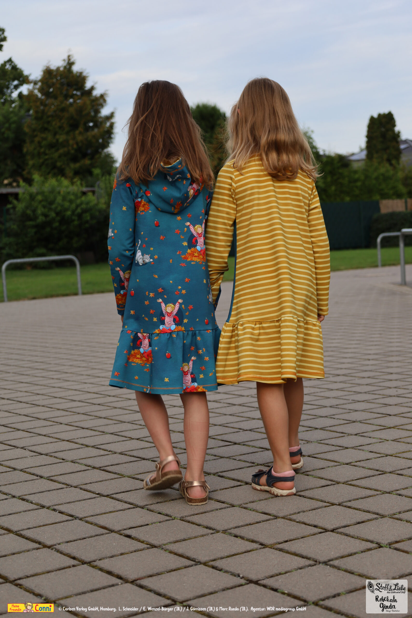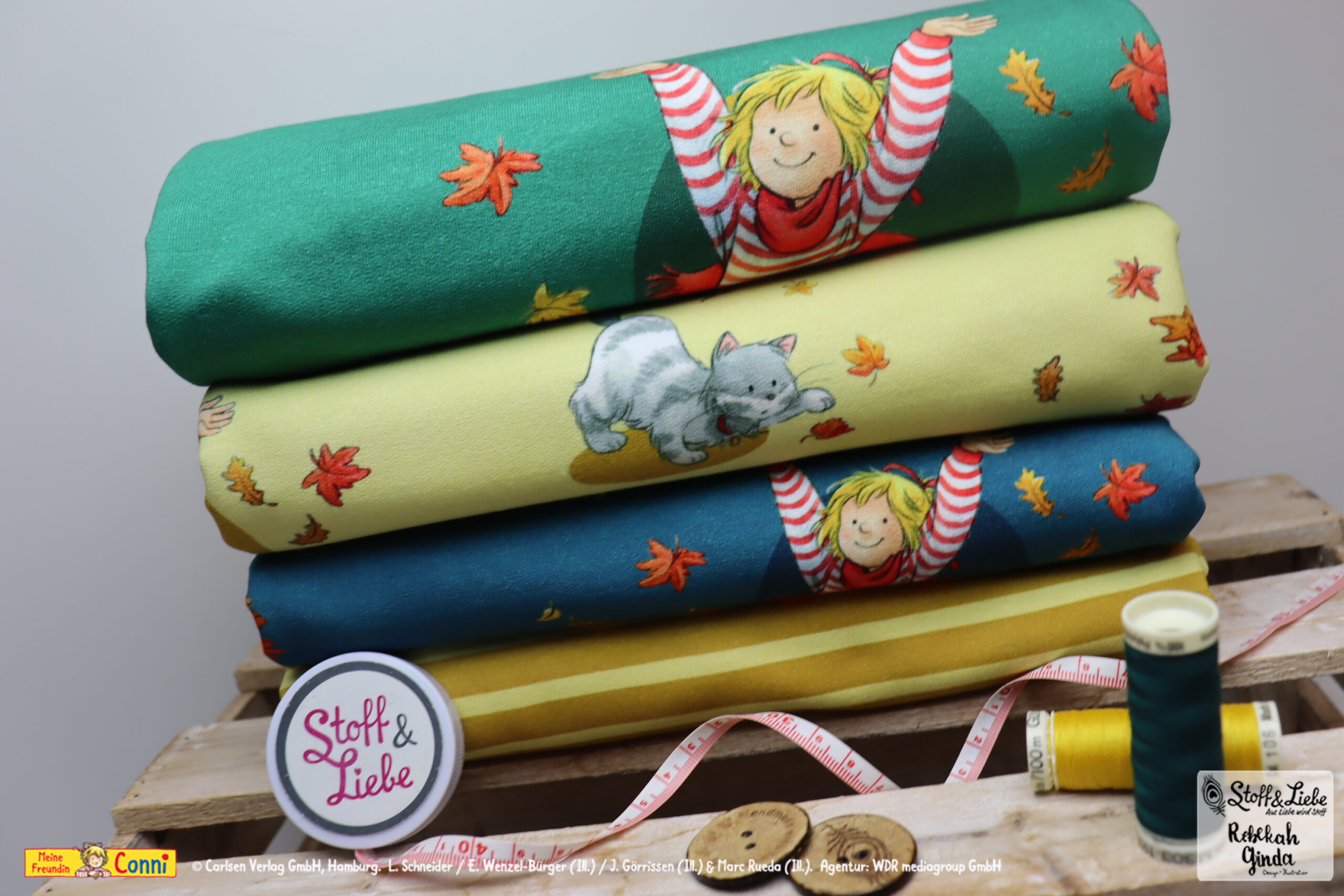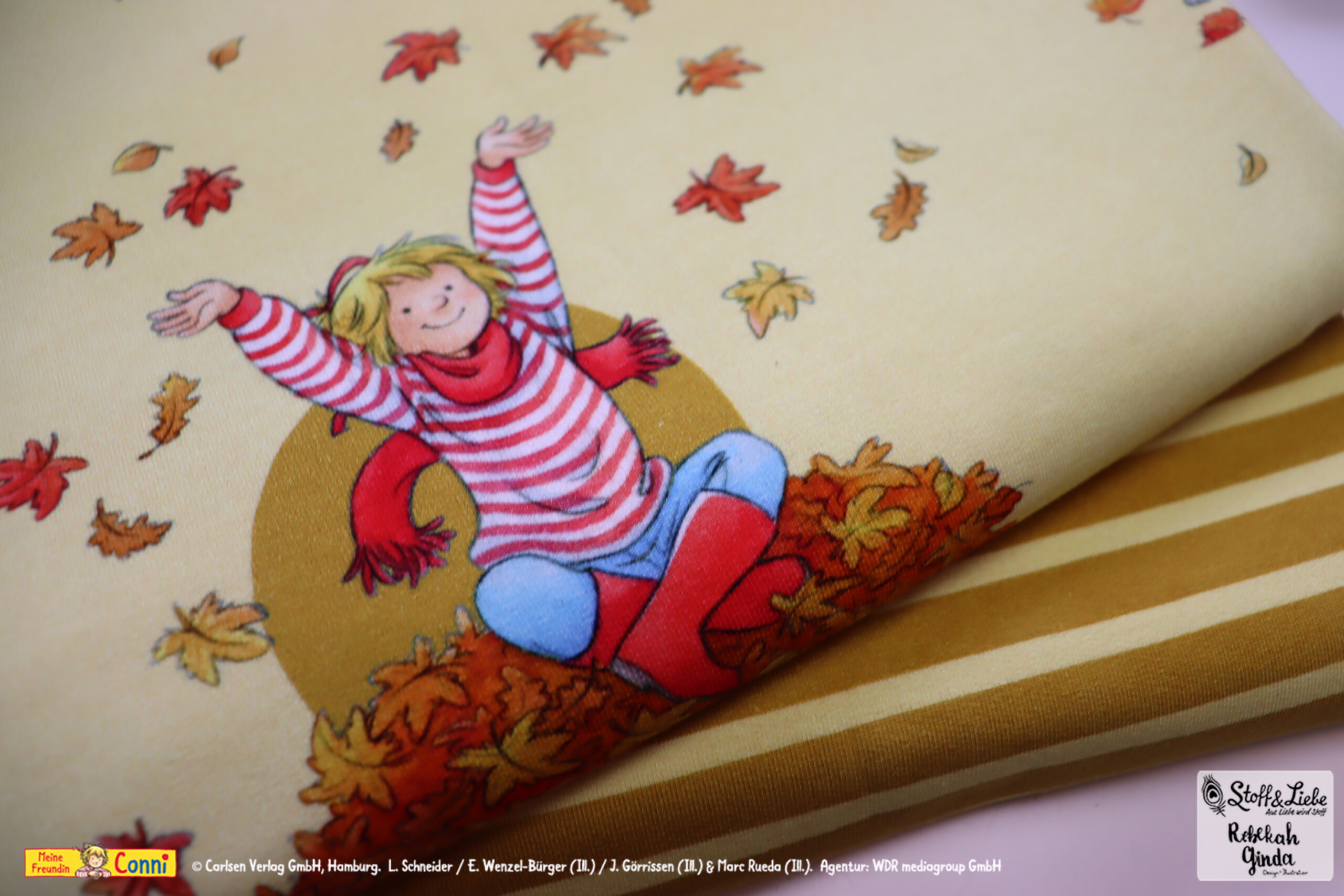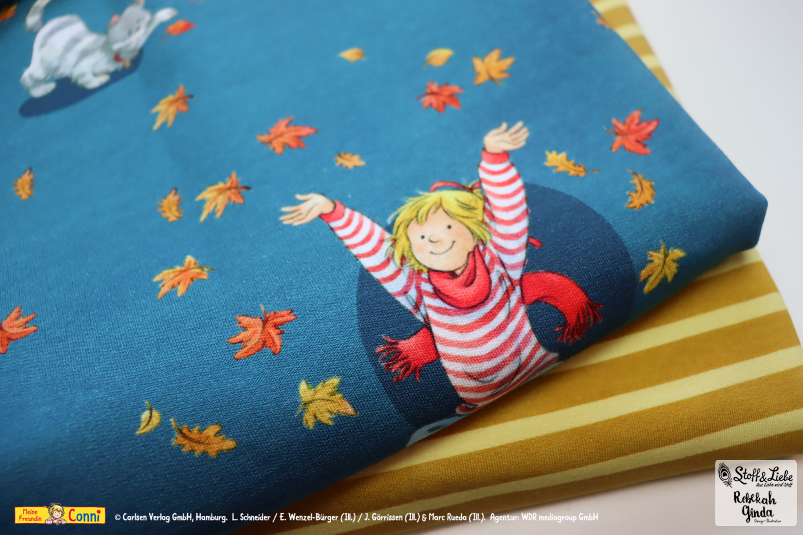 Unser Design „Conni – Goldener Herbst“ stammt aus der Feder von Rebekah Ginda und bringt Euch neben einem Panel, einen Allover in zwei Farbvarianten und einen Kombistoff mit. Die Materialzusammensetzung liegt bei 95 % Baumwolle und 5% Elasthan.