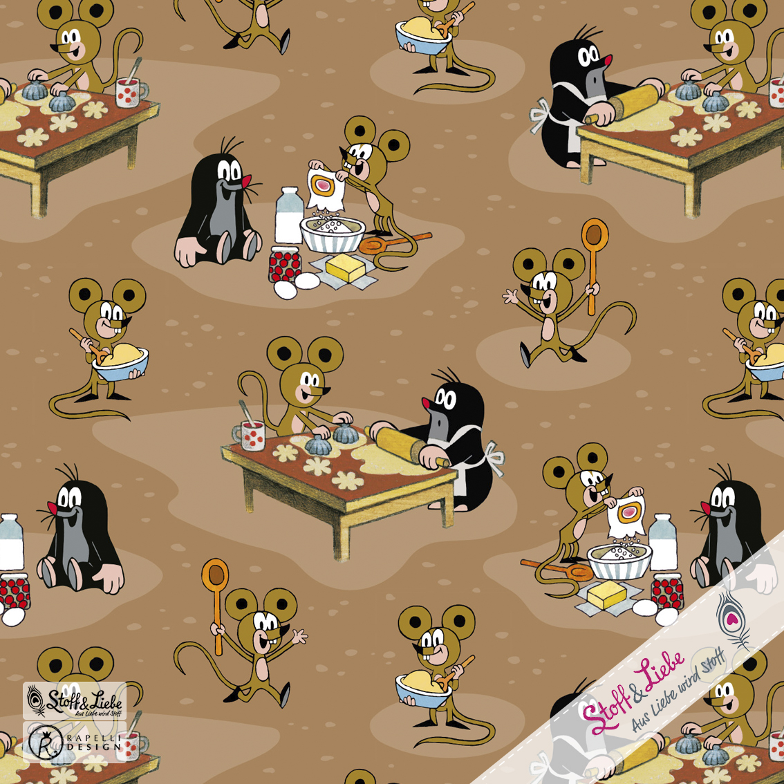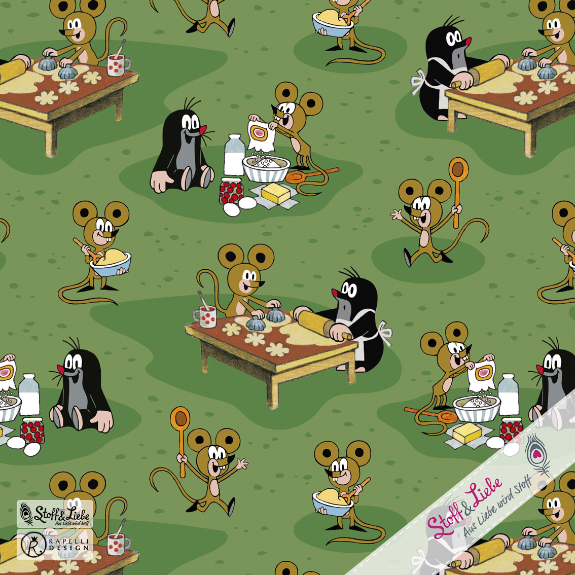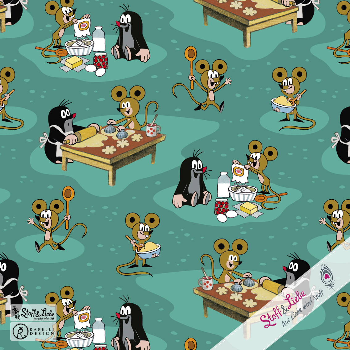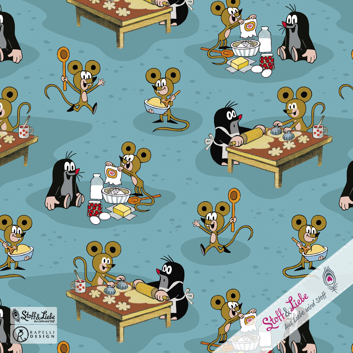Der Allover ist einfach so goldig, das sofort die Ideen sprudeln, oder? Wir sind uns ziemlich sicher, dass es Euch genauso gehen wird wie uns. Wie niedlich ist es bitte, wie der Maulwurf gemeinsam mit der Maus den Teig vorbereitet und die Plätzchen aussticht. Wir gehen sogar soweit, dass dies einer der schönsten Maulwurf Stoffe ist, den wir bisher hatten.
