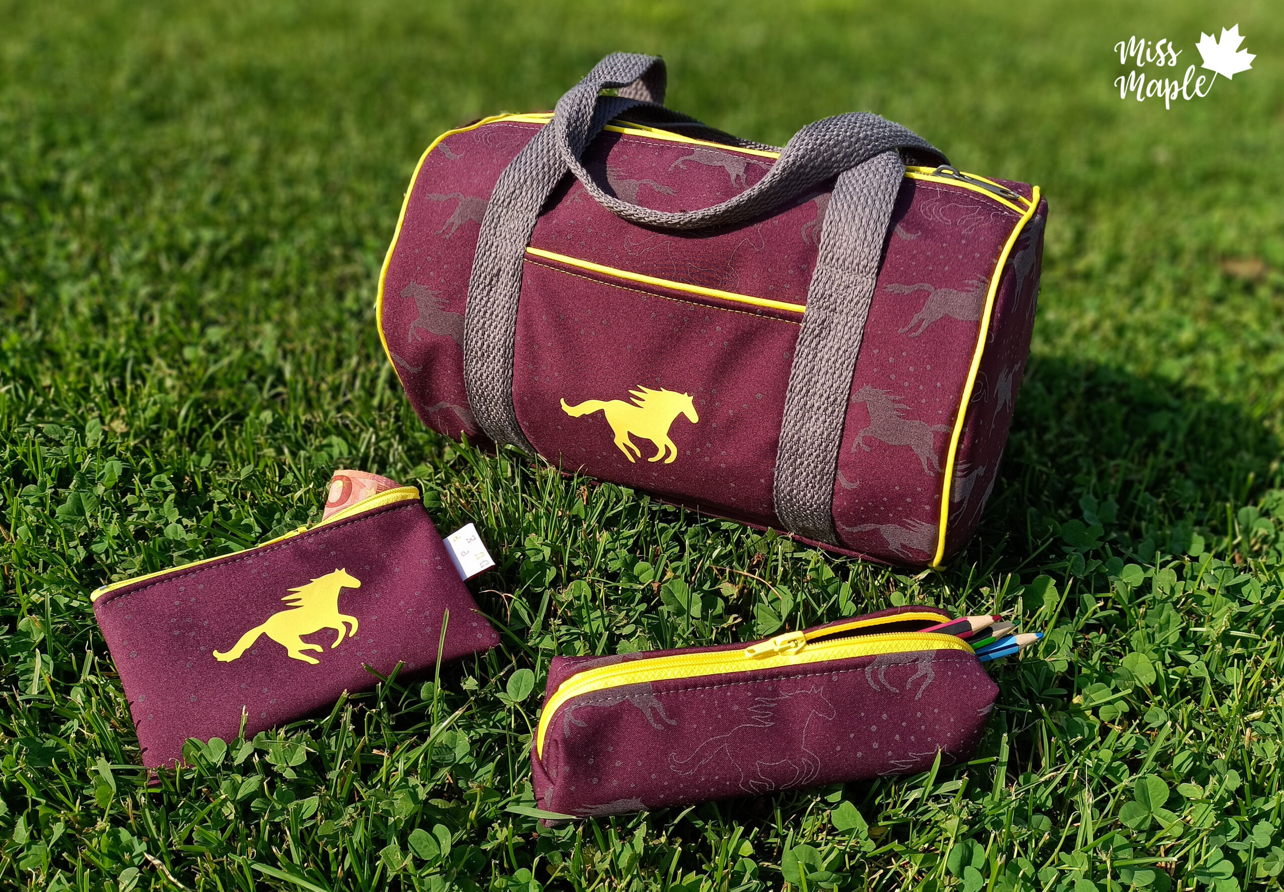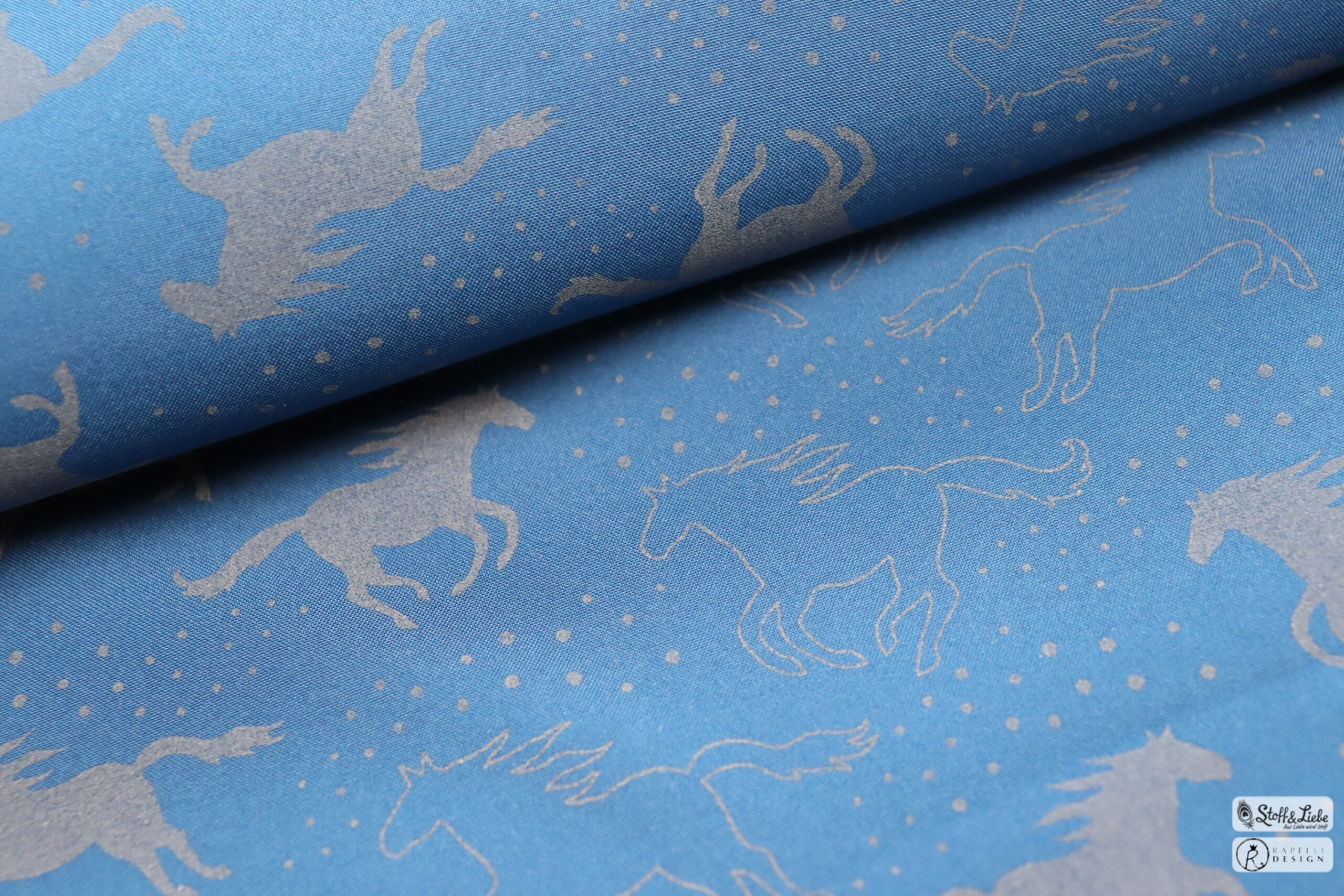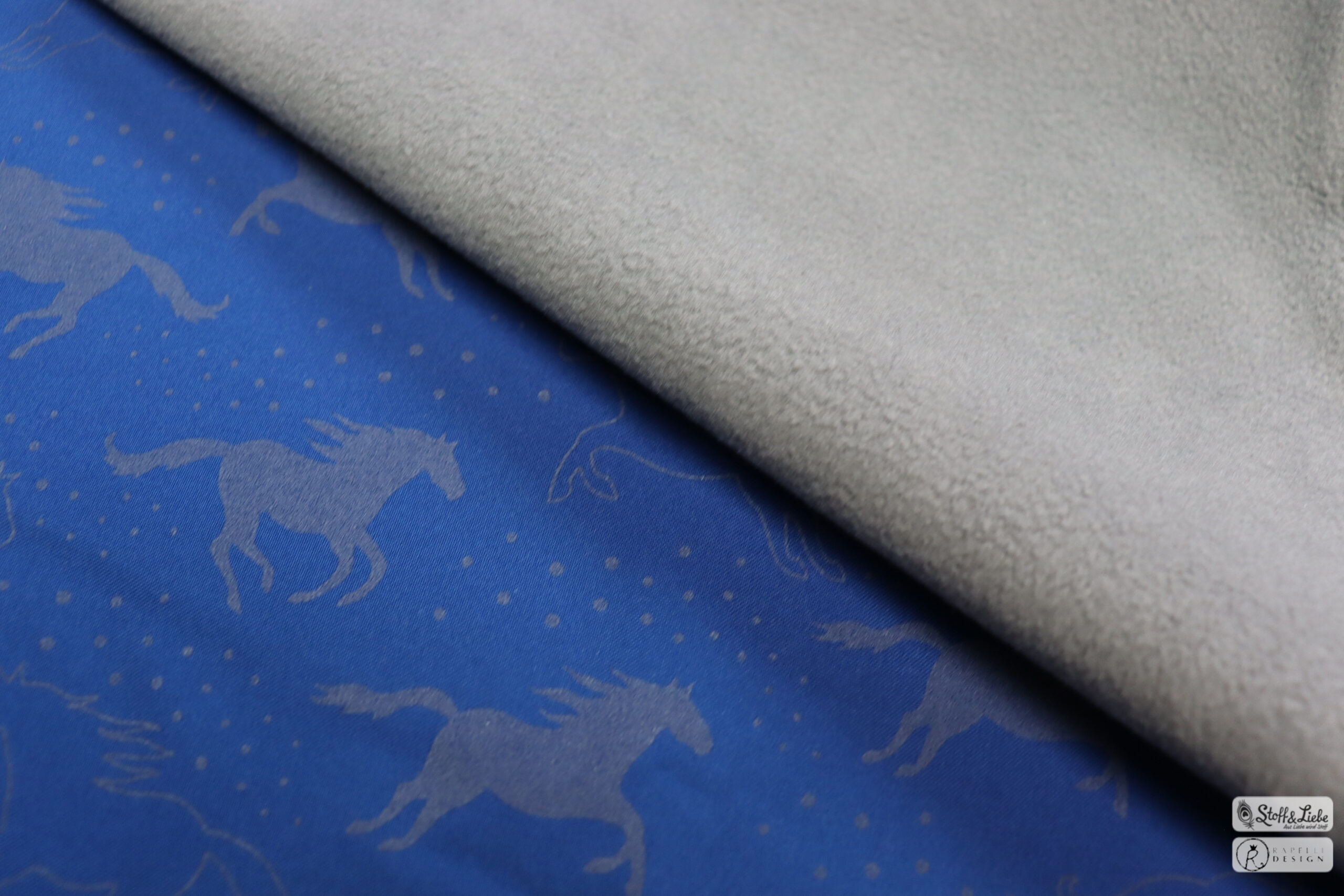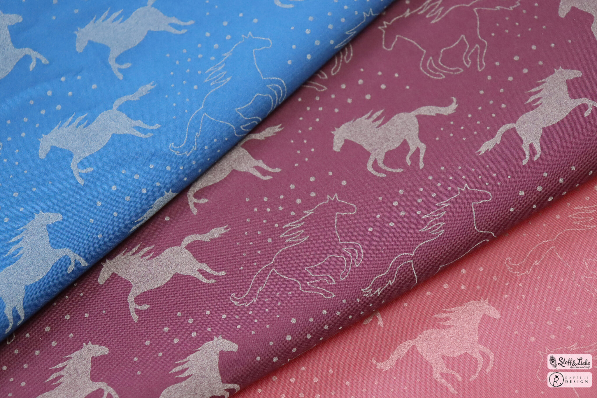 Den Hauptstoff haben wir für Euch in drei Farben: Blau, Bordeaux und Holunder. Die Motive haben eine Höhe zwischen ca. 3 und 4 cm (Pferd gefüllt und ungefüllt).