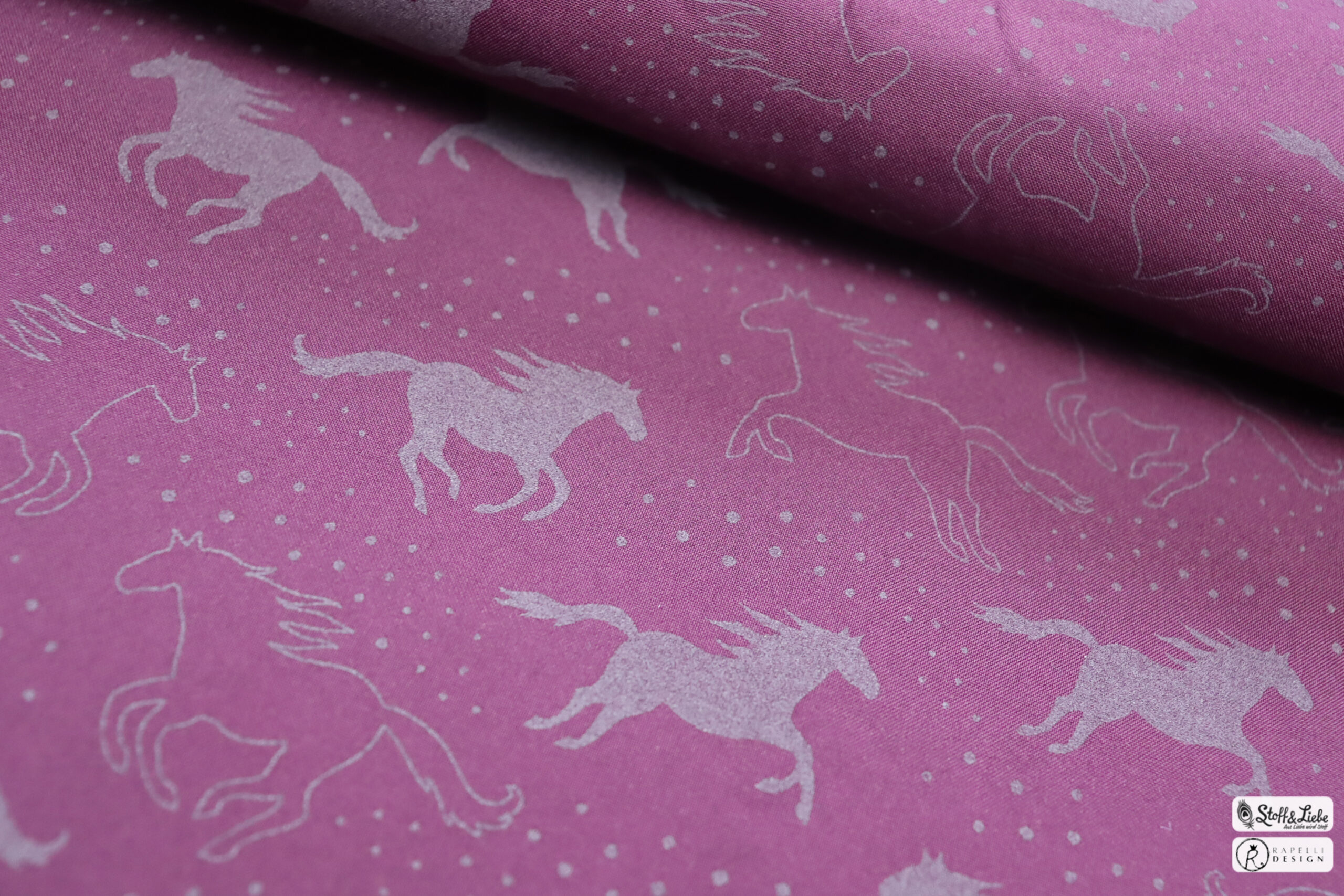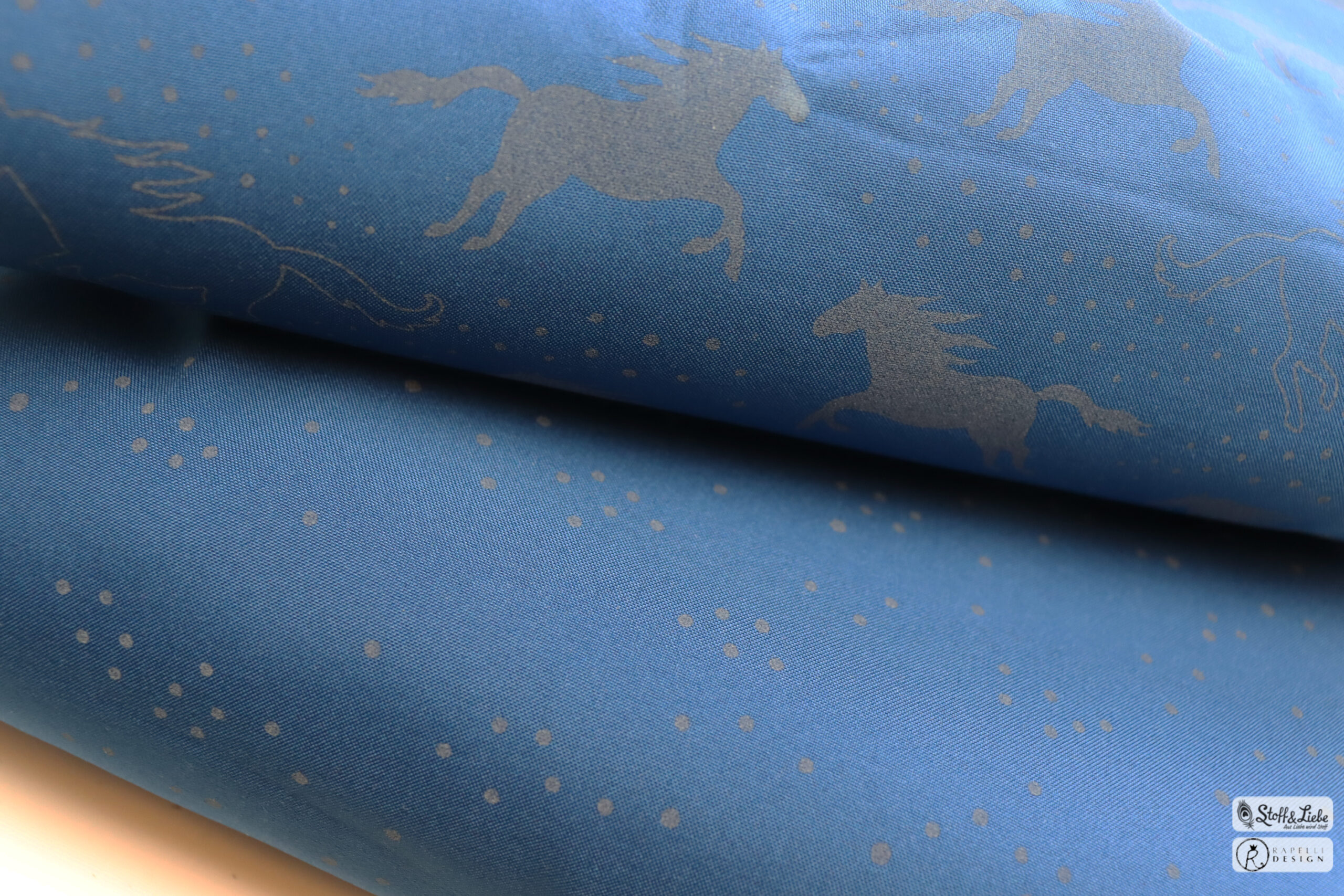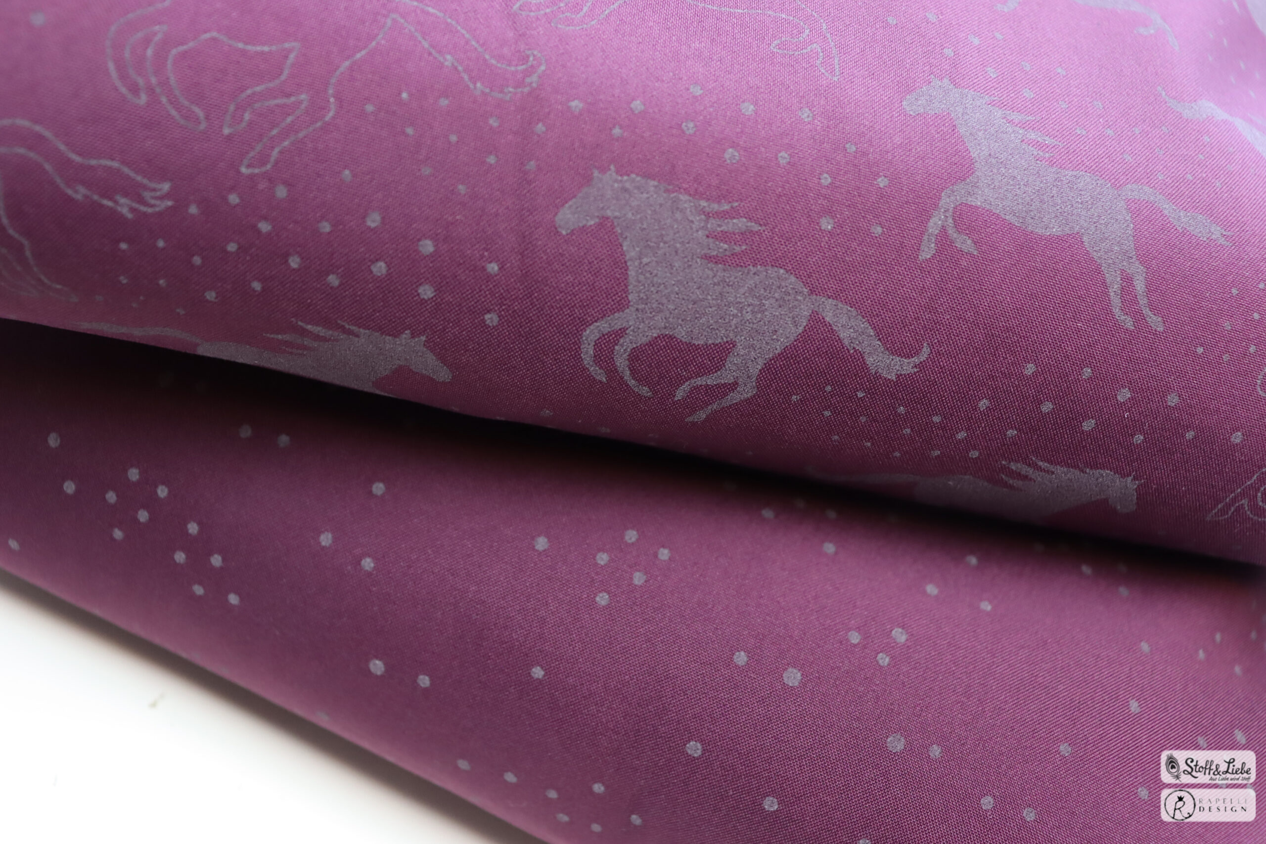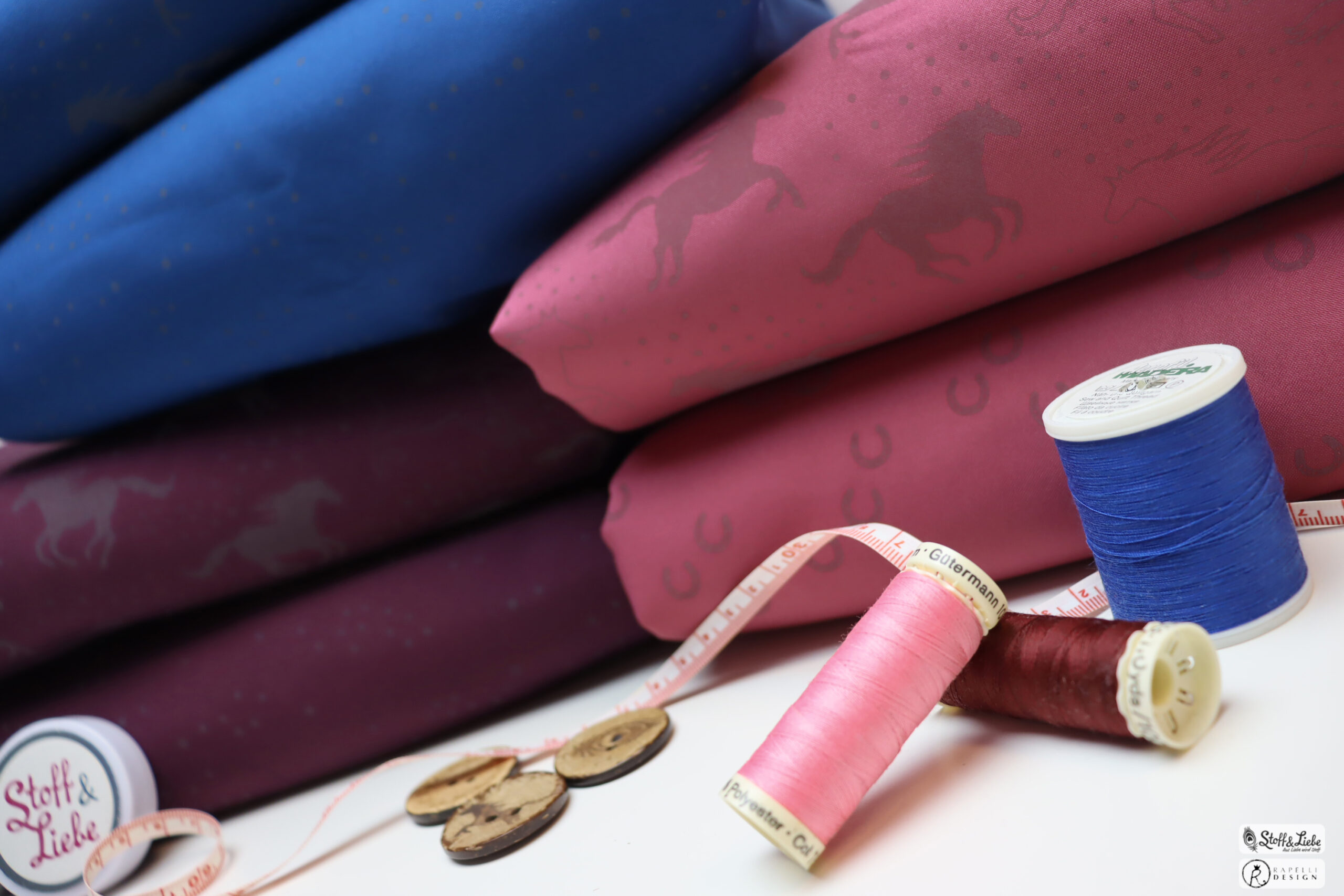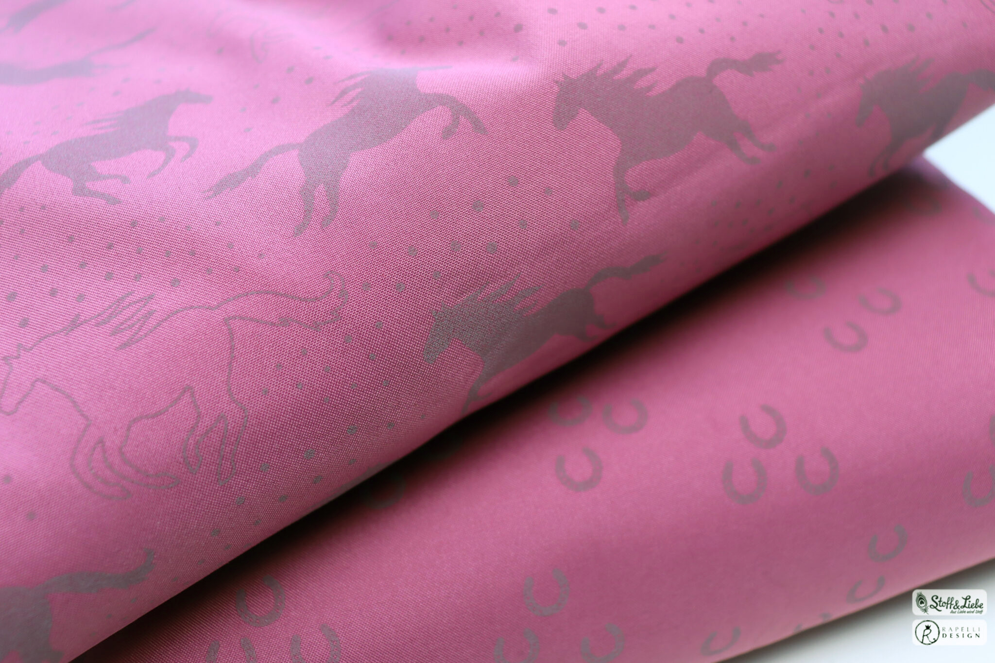 Passend zu jedem Hauptstoff haben wir einen Kombistoff für Euch. Die Farben Blau und Bordeaux bringen Euch die Freckles mit und der Hauptstoff in Holunder hat als Partner die Pferdeliebe in Form von Hufeisen dabei. Die Hufeisen sind ca. 1 cm hoch.