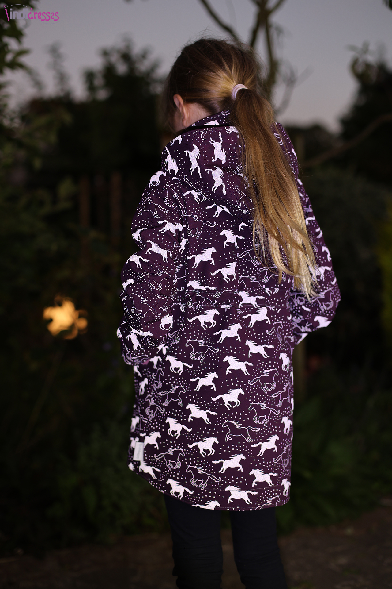 Die Stoffe habt Ihr bereits in voller Pracht gesehen. Und auch im Dunkeln verlieren sie nicht an Schönheit und sorgen dazu noch für Eure Sicherheit. Auf den folgenden Fotos seht Ihr einmal den Vergleich, wie der Reflektor mit und ohne Lichteinfall wirkt bzw. wie toll die Motive abstrahlen und dafür sorgen, dass der/die Träger/in der Nähwerke auf jeden Fall im Dunkeln gesehen werden.