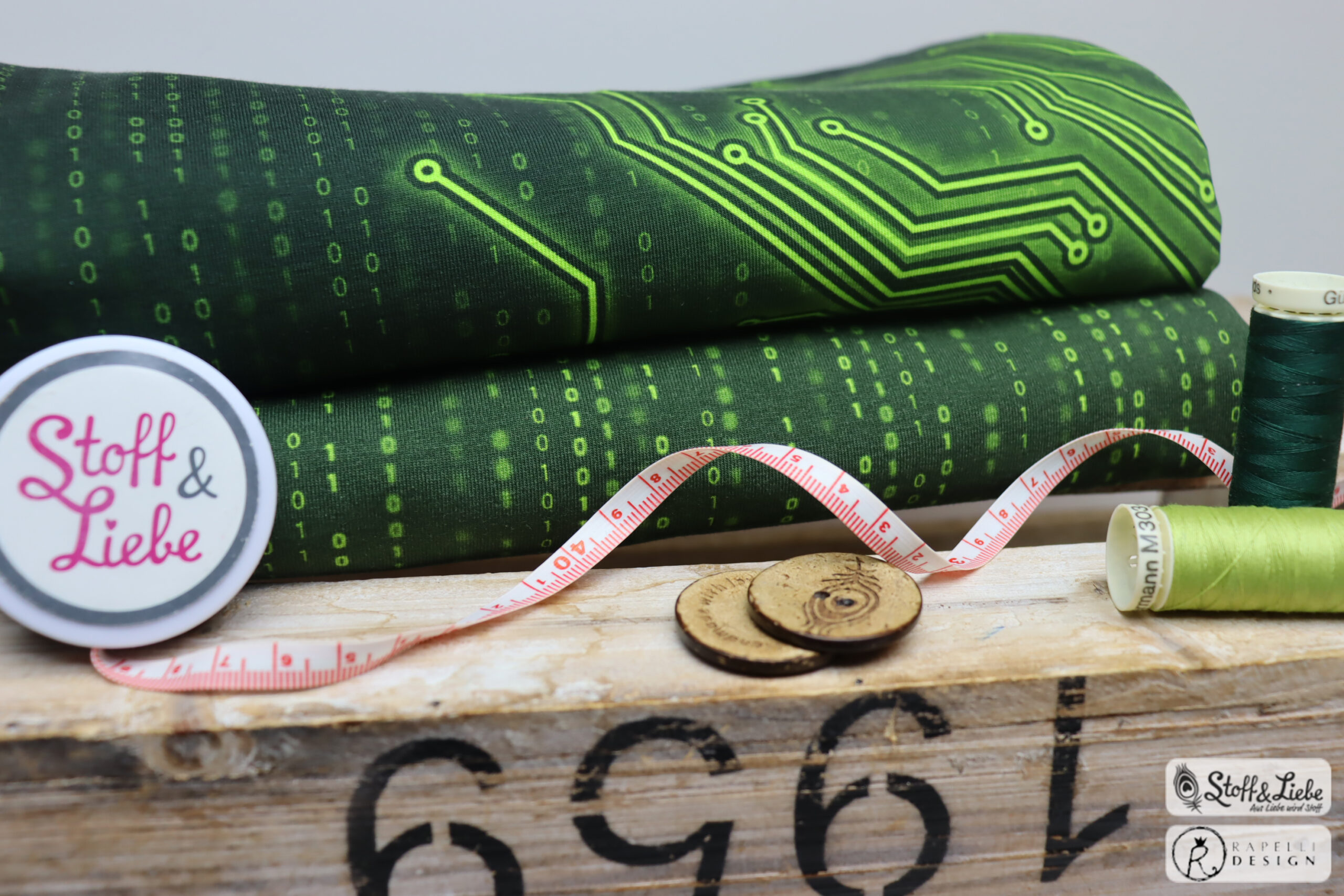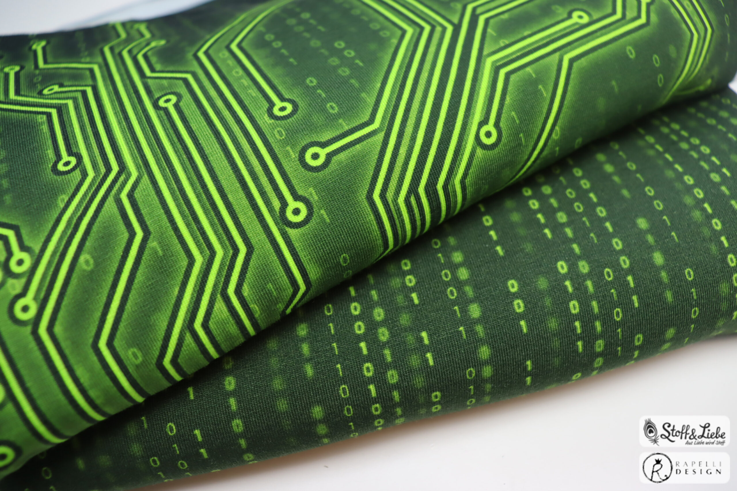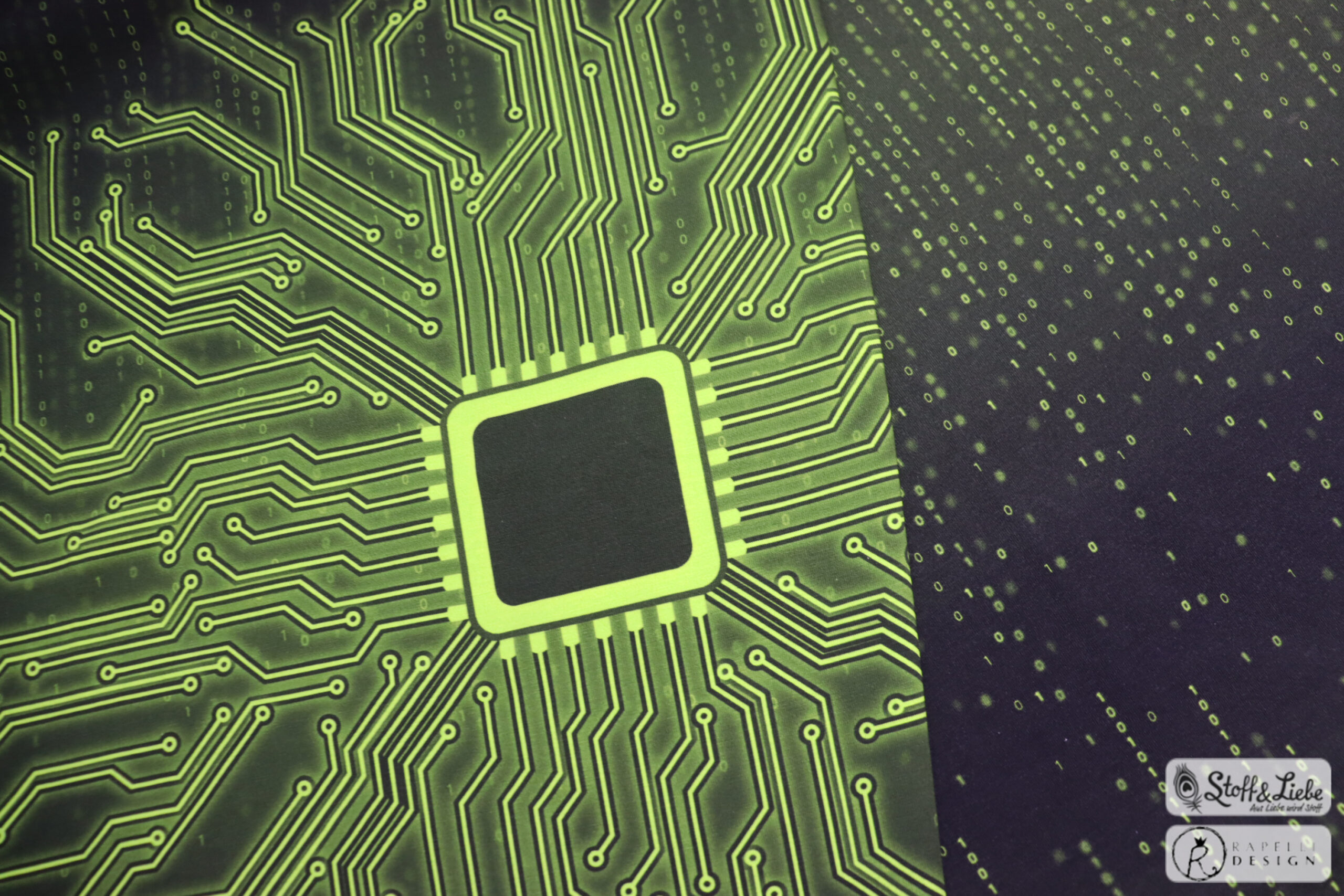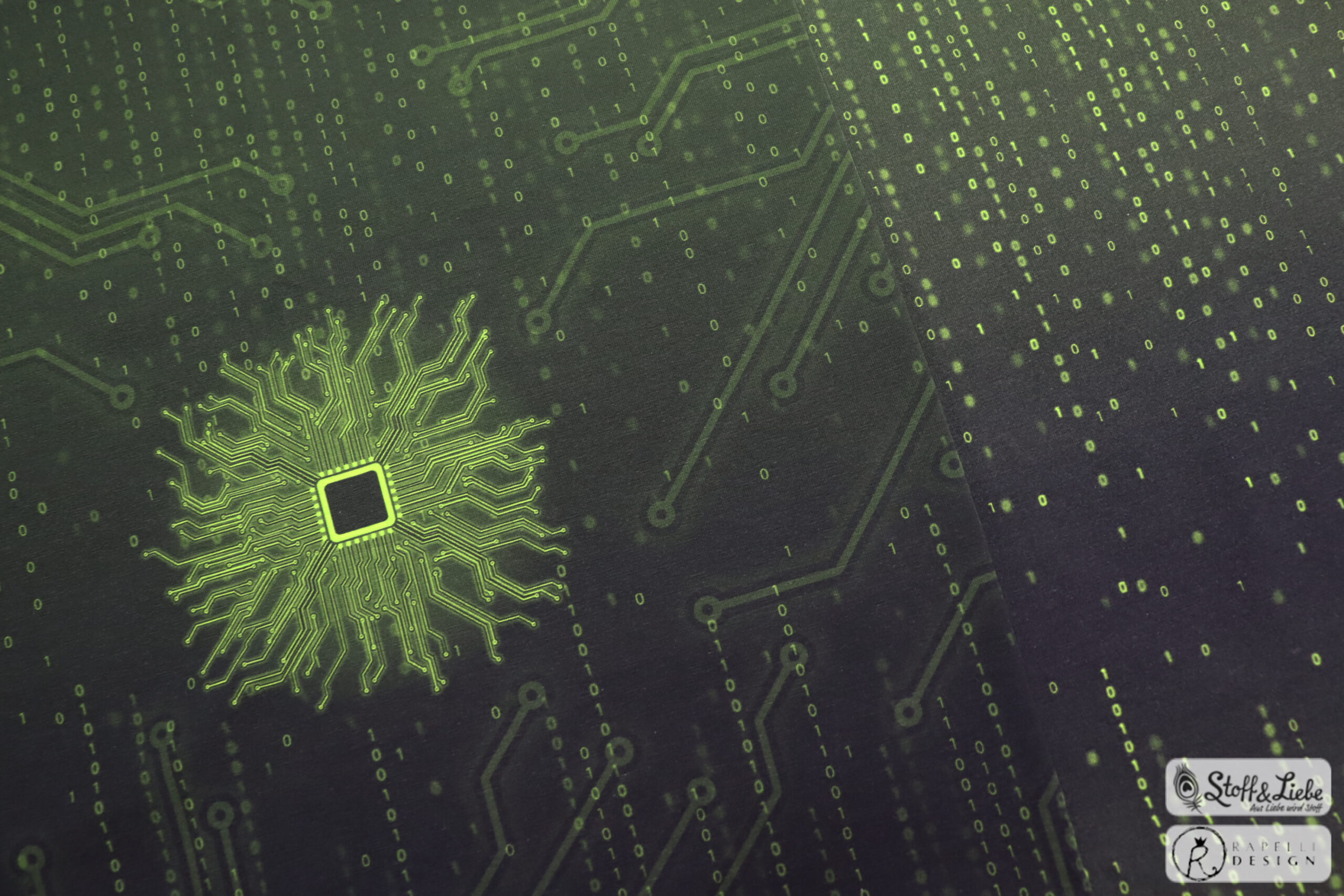 Unsere „Code X CPU“ Kollektion umfasst ein Panel und einen Hauptstoff. Beide Stoffe erhaltet ihr auf Jersey mit einer Materialzusammensetzung von 95 % Baumwolle und 5 % Elasthan. Umgesetzt wurden dieses Design von Rapelli Design.