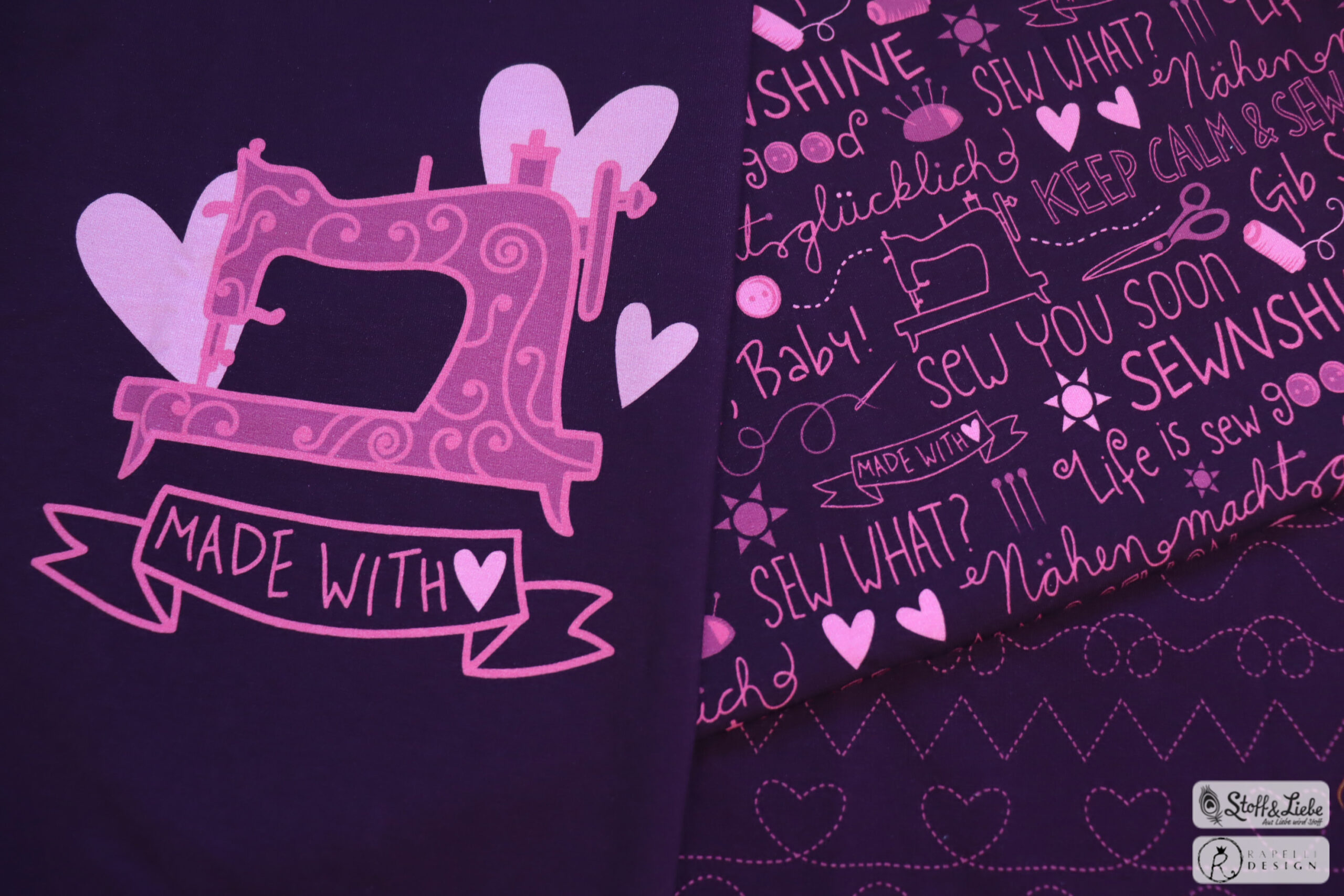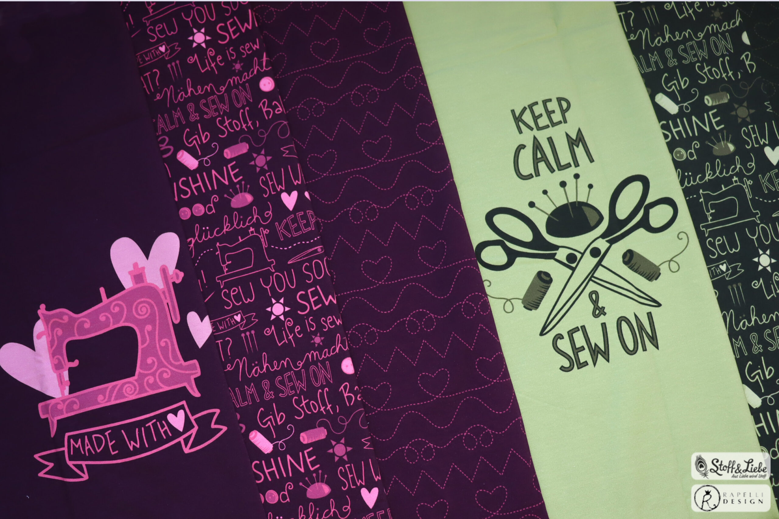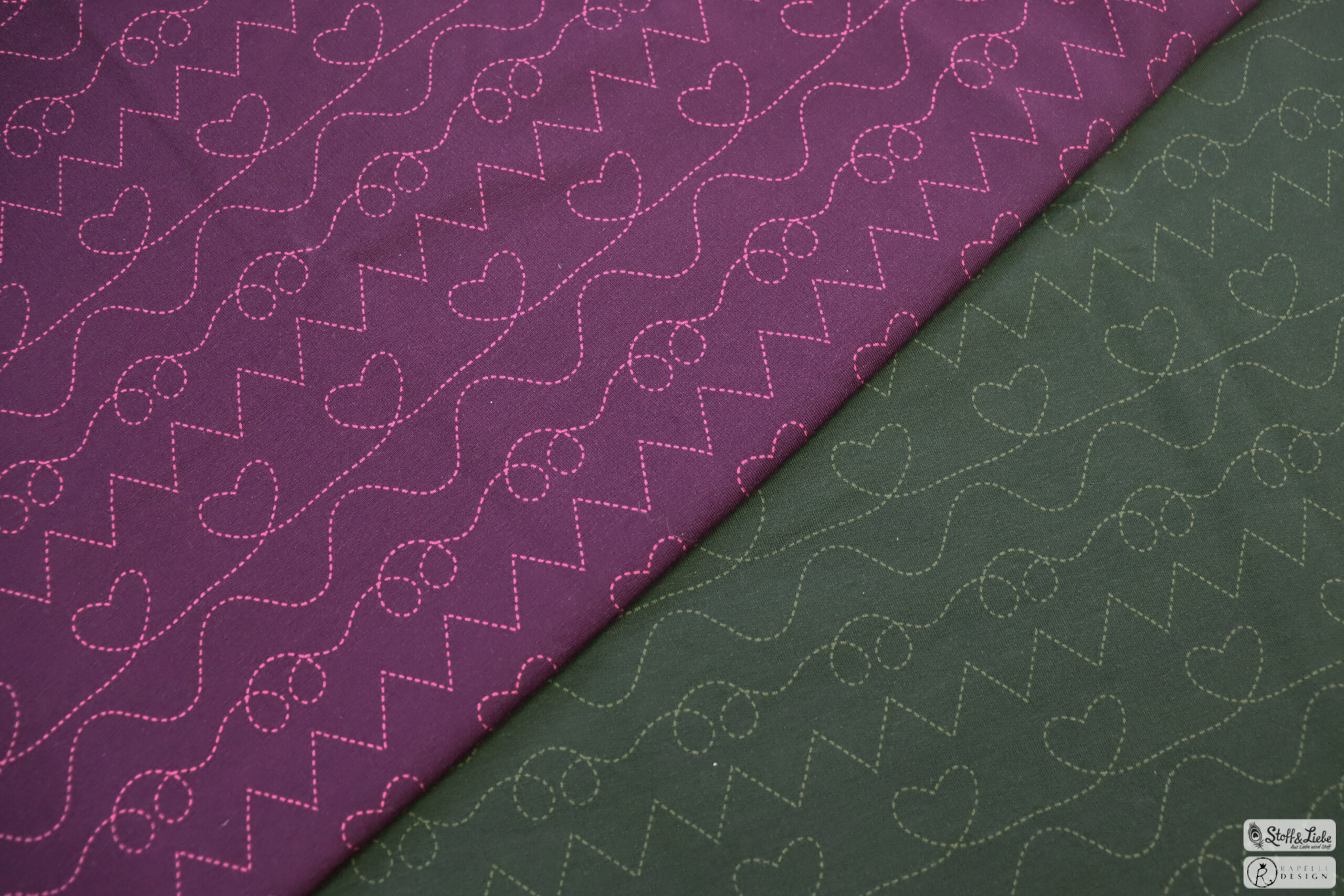 Auch beim Allover kannst Du zwischen Oliv und Beere wählen. Die Motive haben eine Höhe zwischen ca. 2 cm (Sewnshine) und 4,5 cm (Nähmaschine).