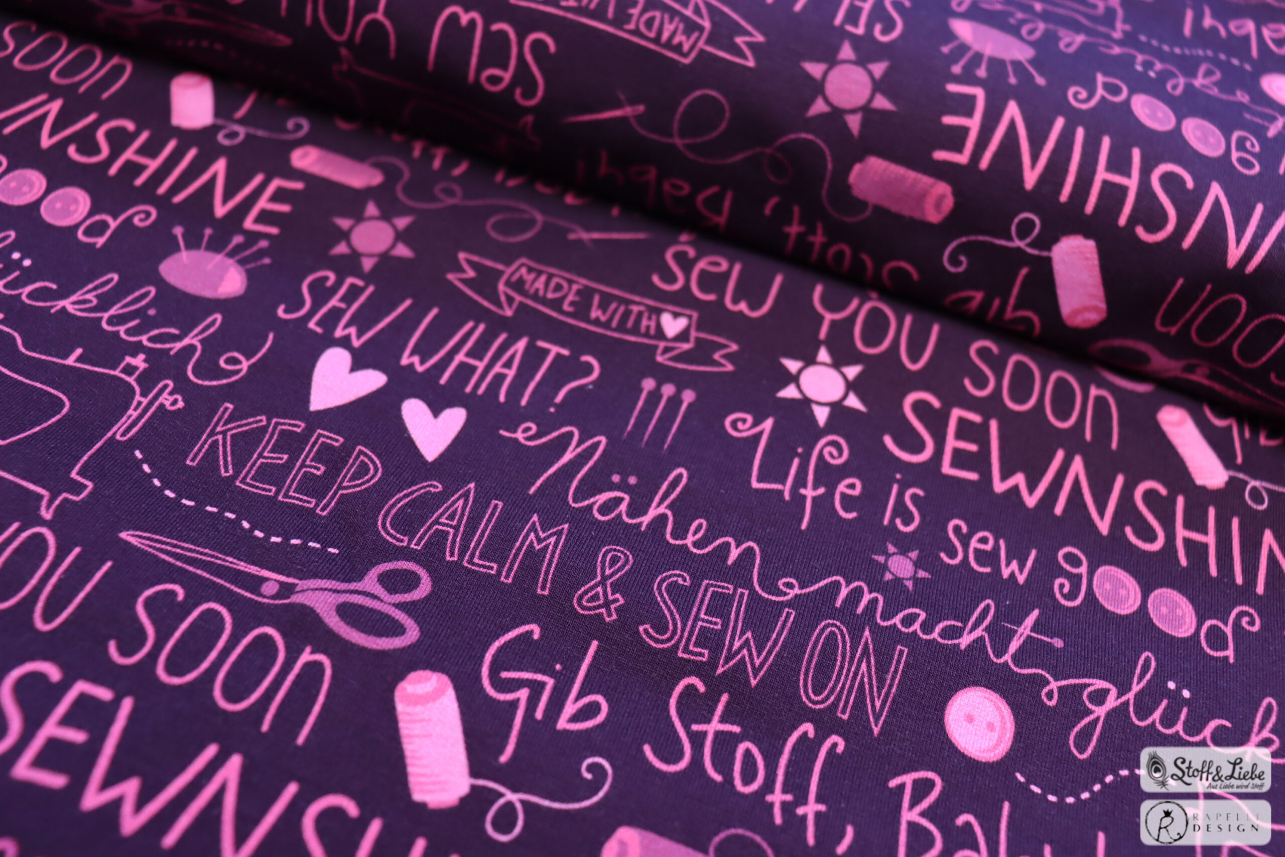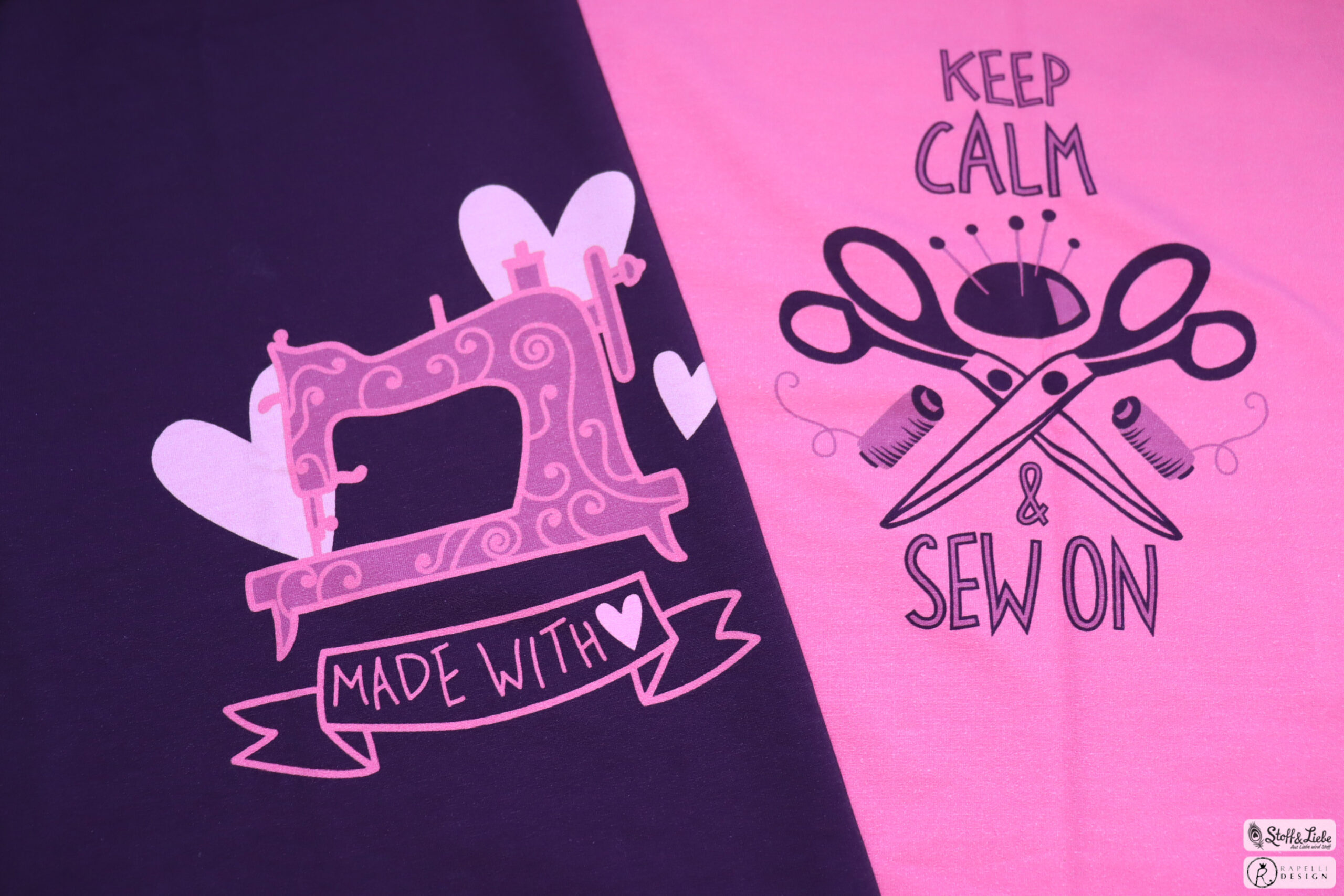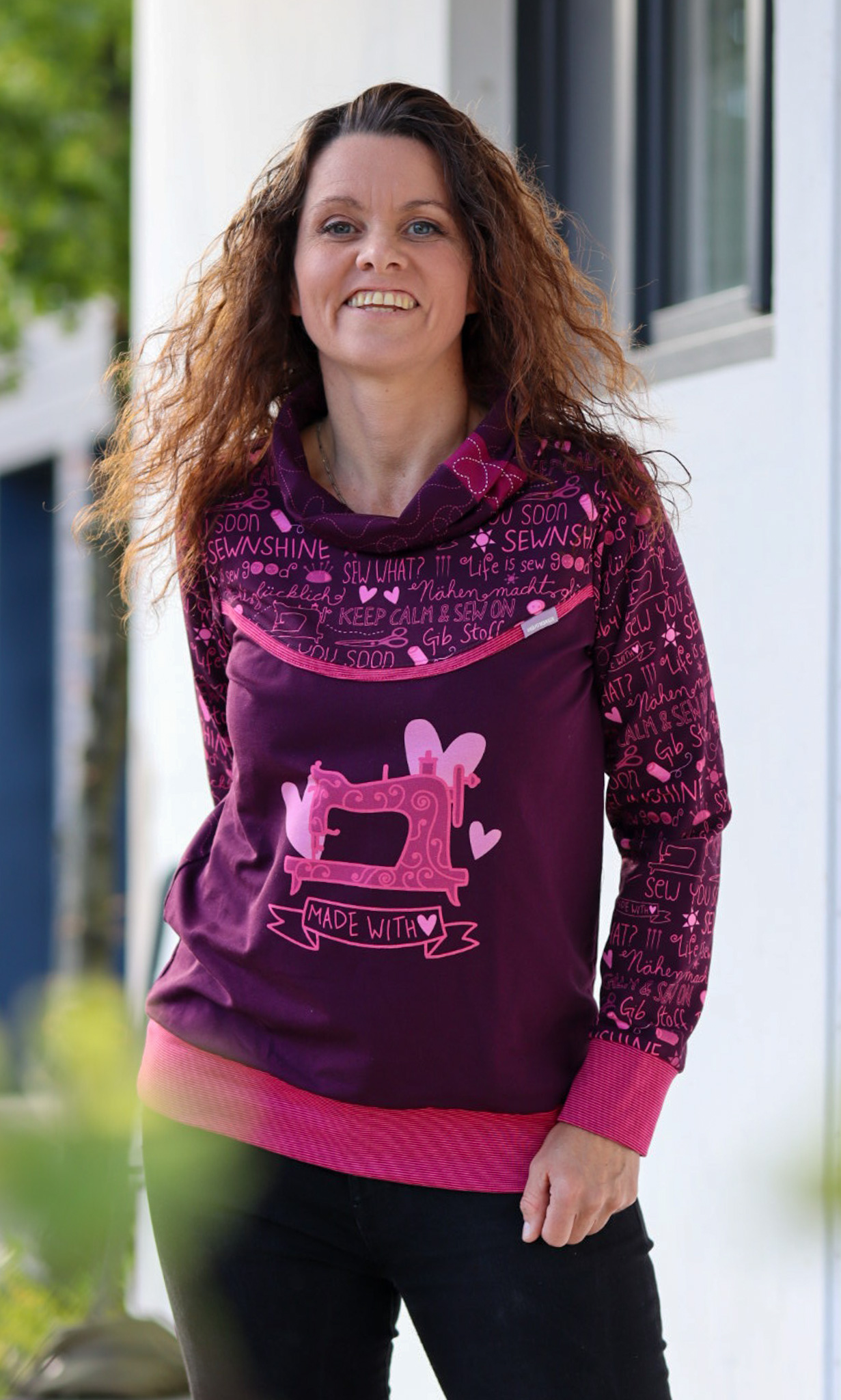 Auch beim Allover kannst Du zwischen Oliv und Beere wählen. Die Motive haben eine Höhe zwischen ca. 2 cm (Sewnshine) und 4,5 cm (Nähmaschine).