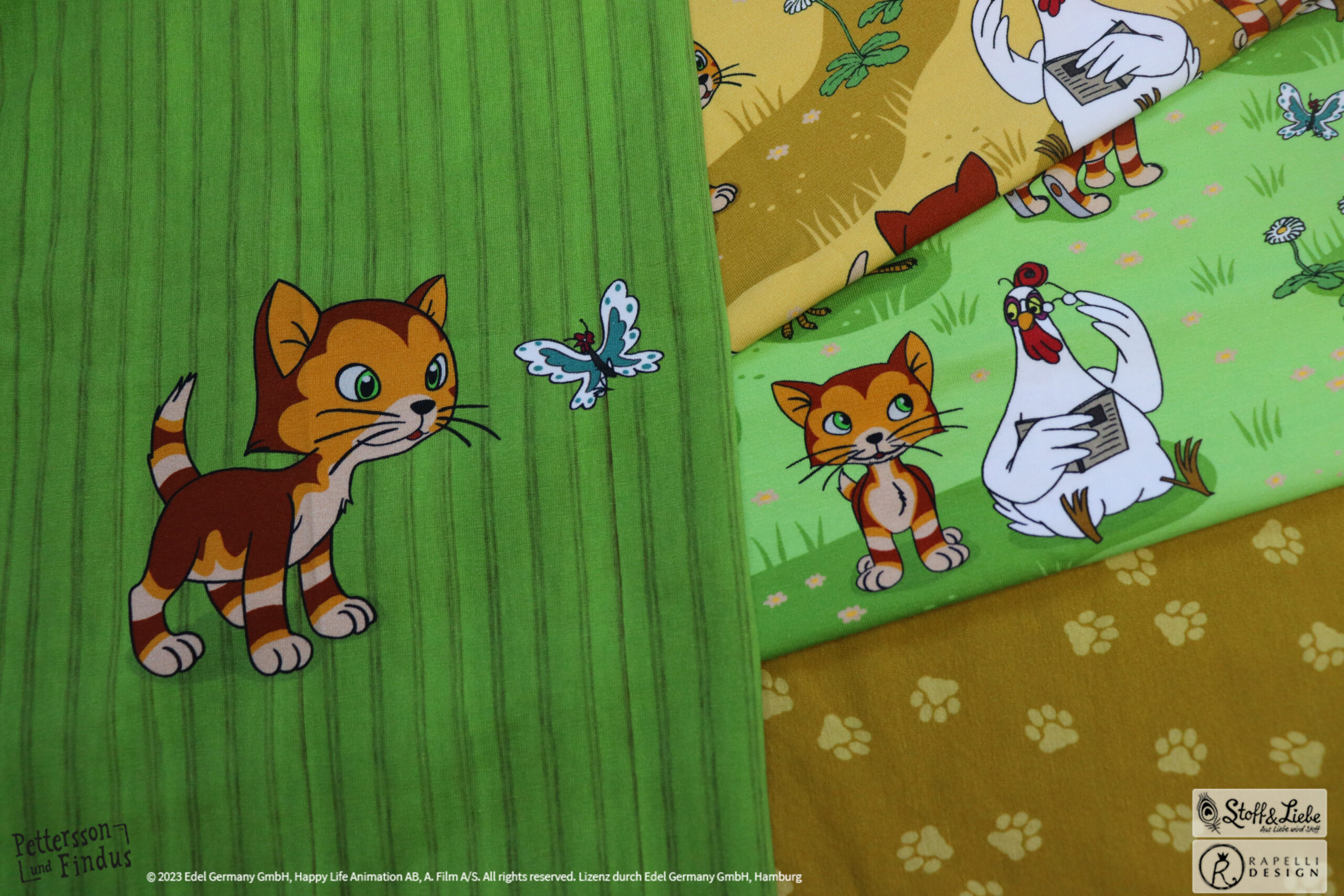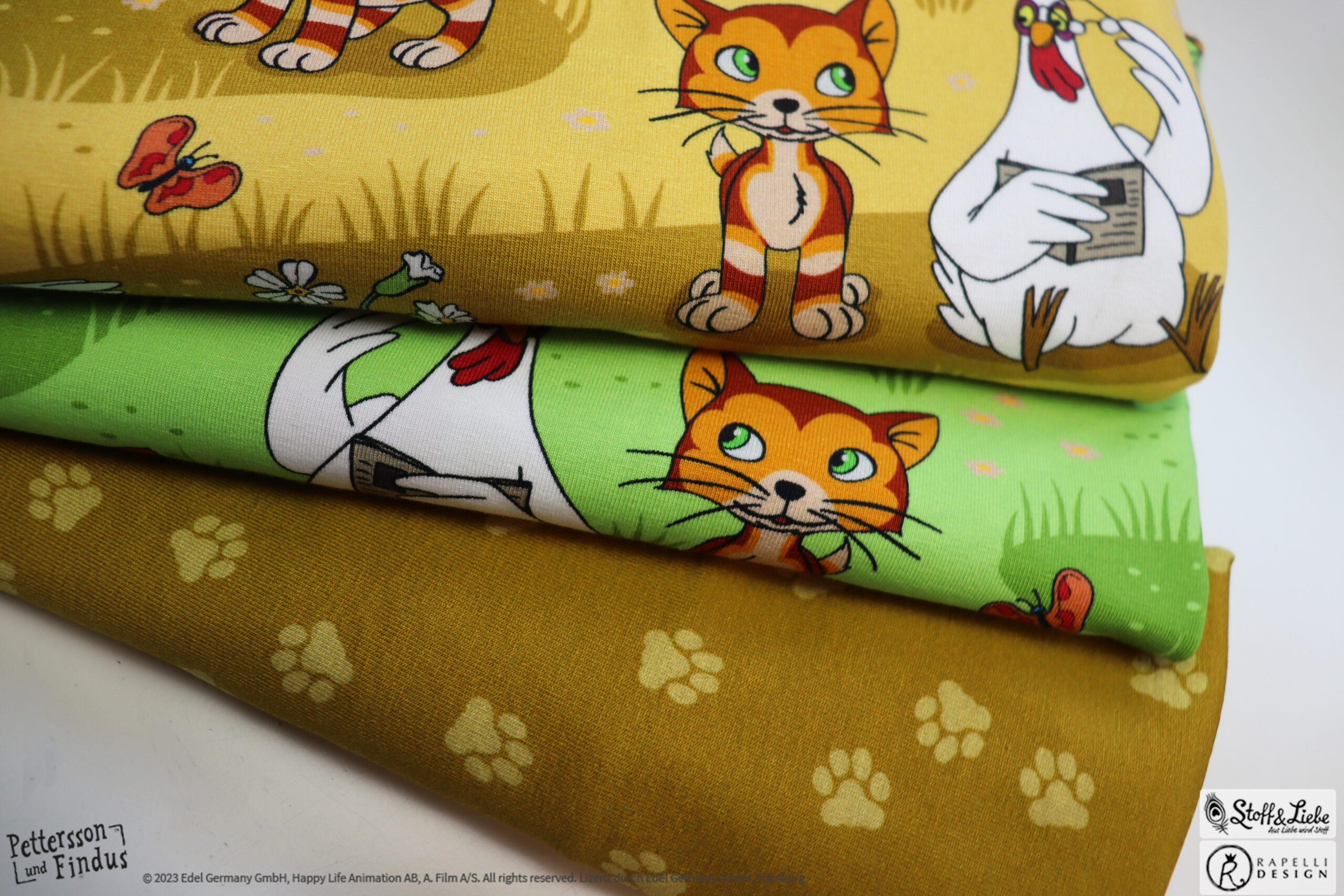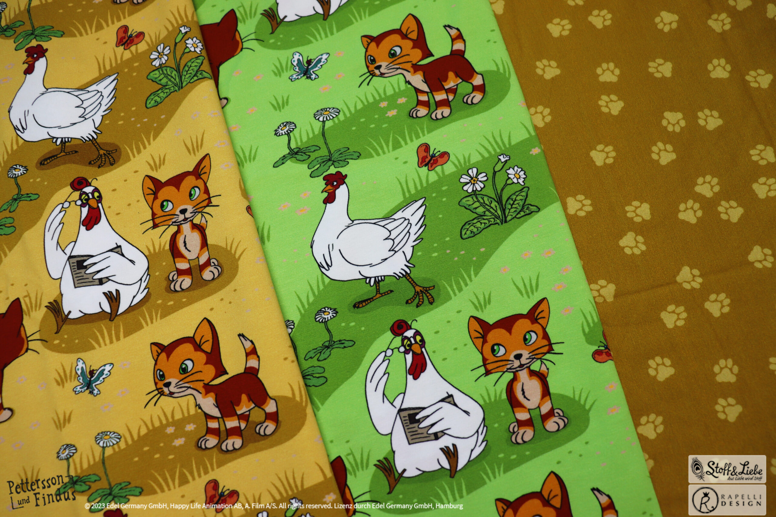 Den Allover „Findus Klein“ haben wir für Euch passend in Honig und Grün. Entdecken könnt Ihr Findus samt den Hühnern. Wisst Ihr eigentlich wie die Hühner von Pettersson heißen?