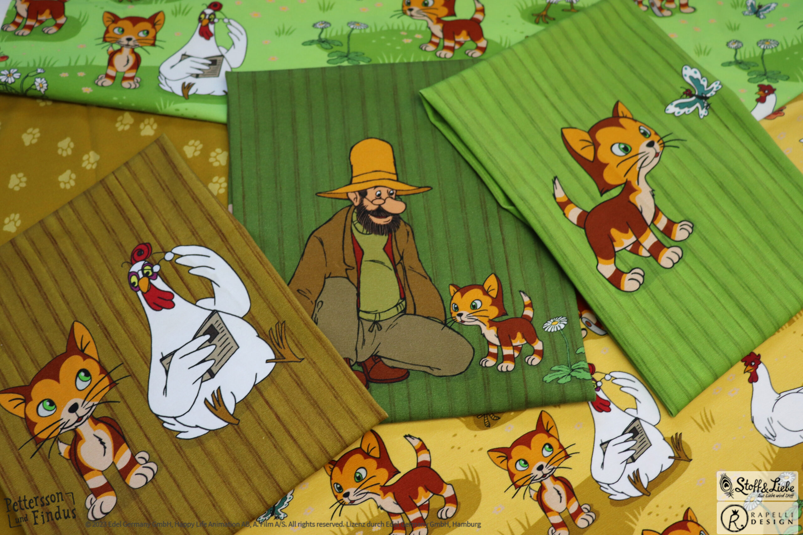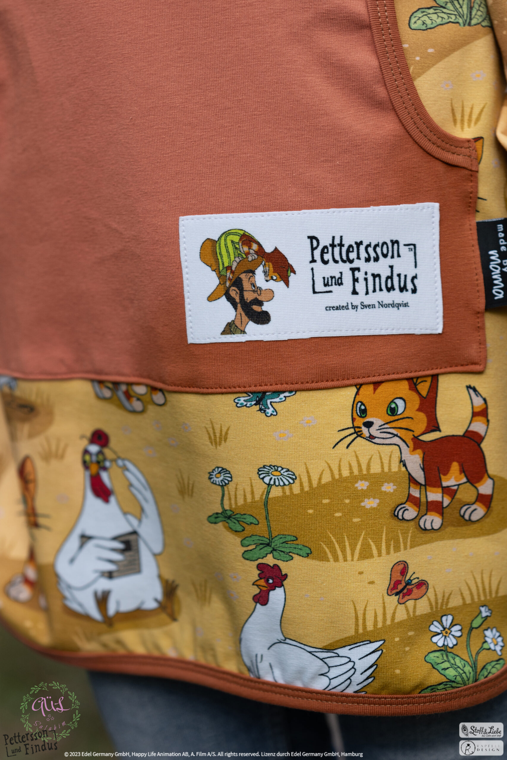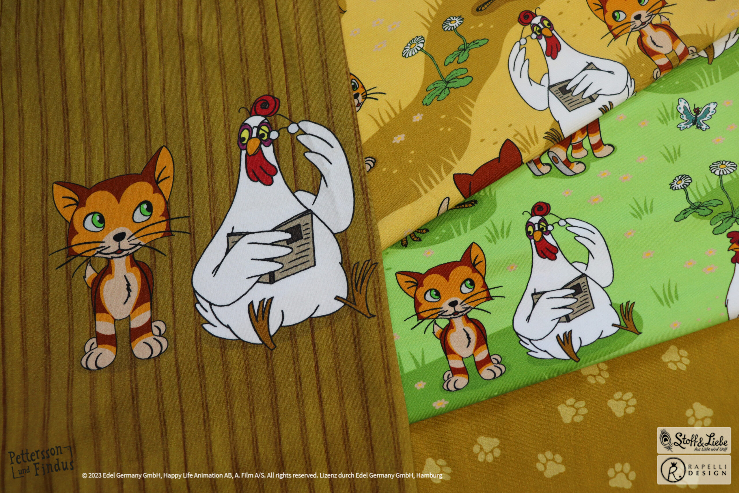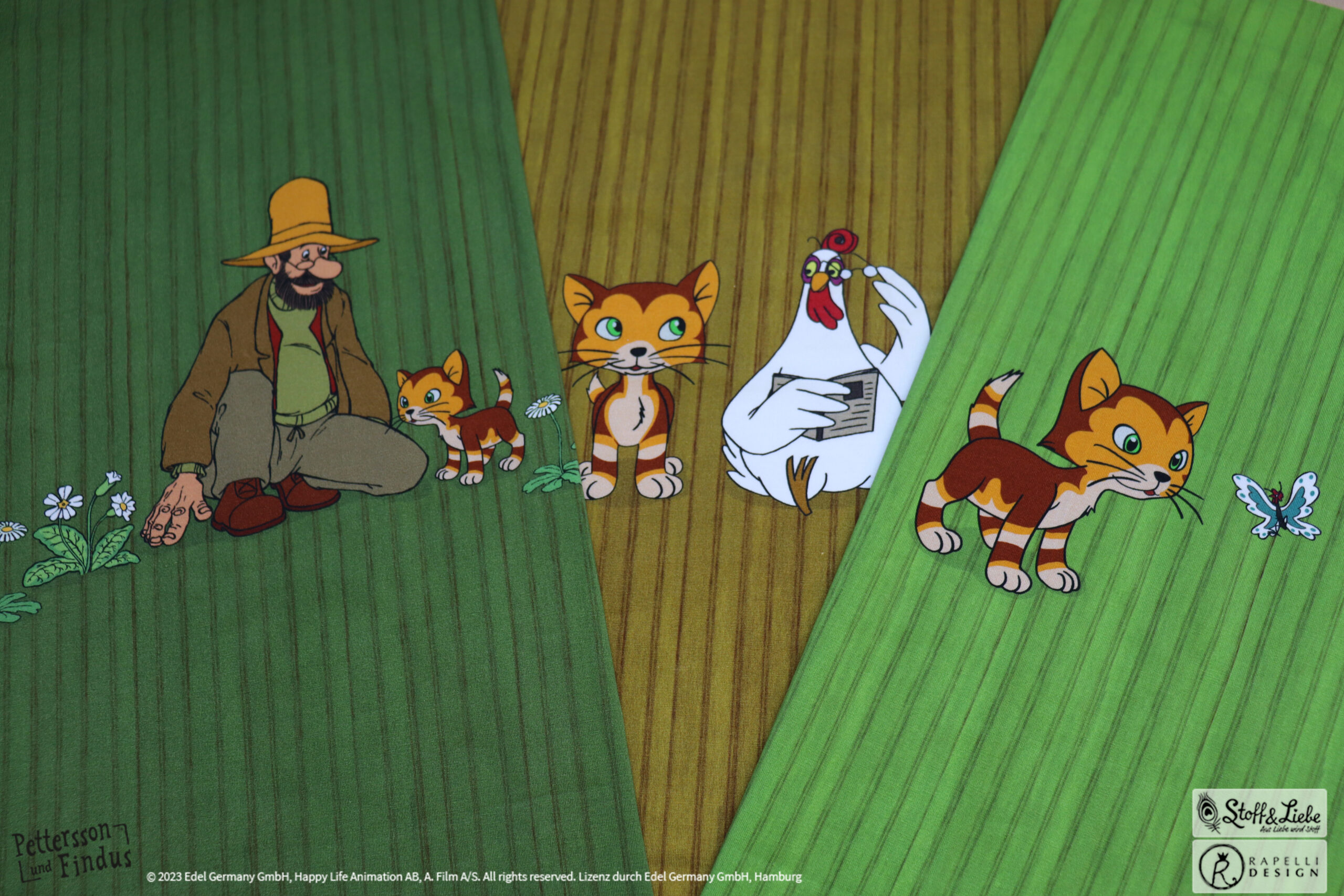 Wie schon bei den ersten zwei „Findus Klein“ Serien, ist auch hier der Hintergrund wieder in Holzoptik gehalten. Dadurch bekommt das Panel seinen ganz besonderen Look und lädt zum Kombinieren mit anderen Stoffen ein.