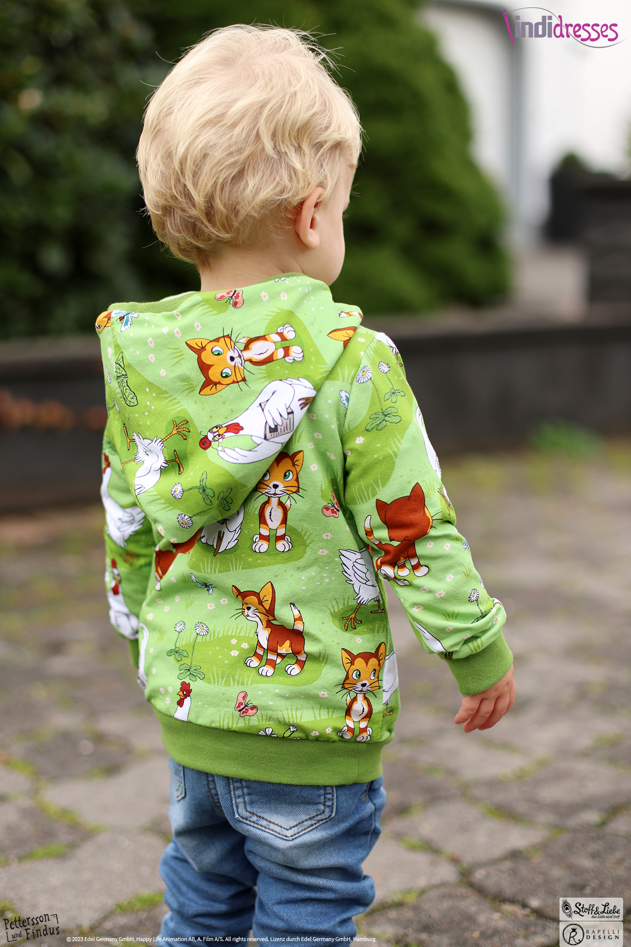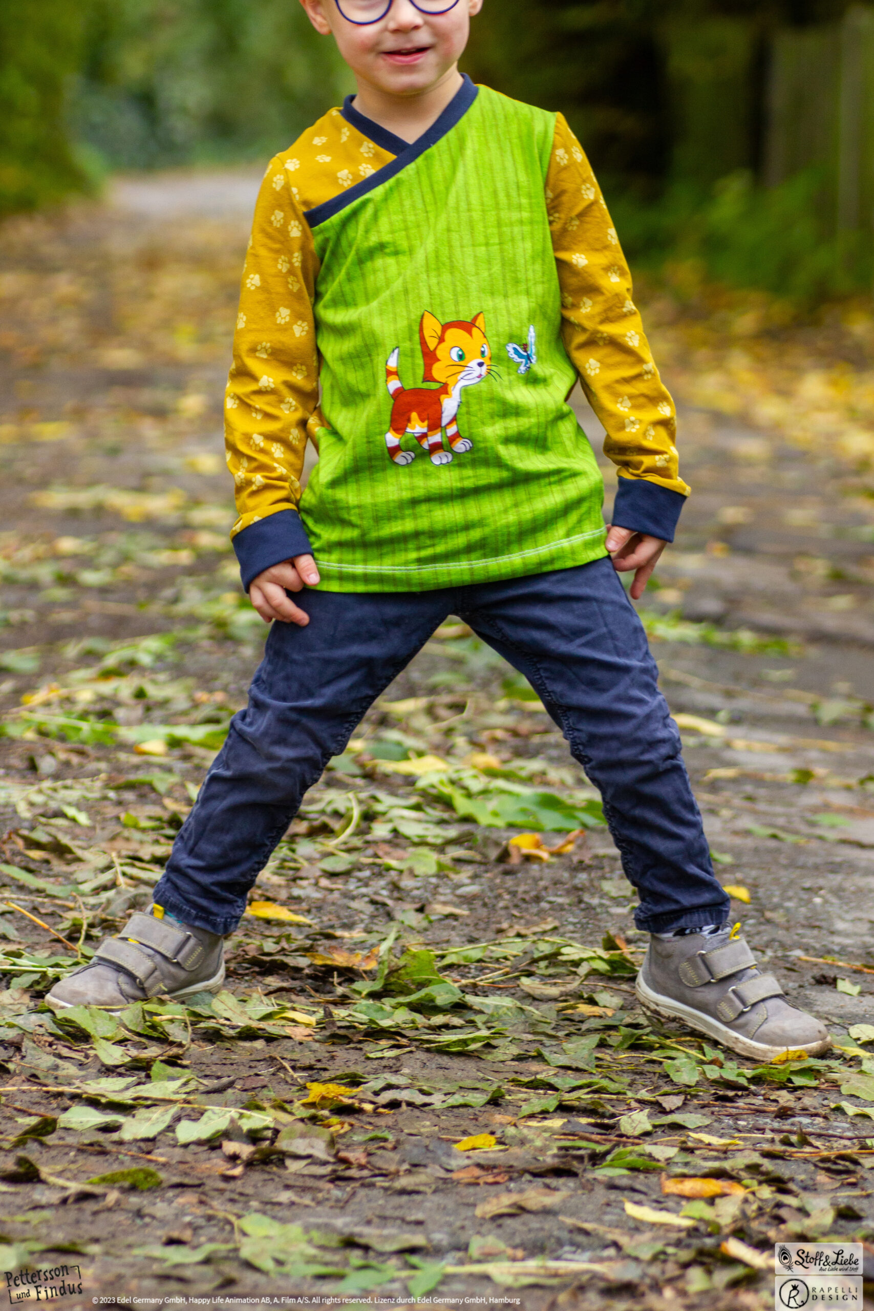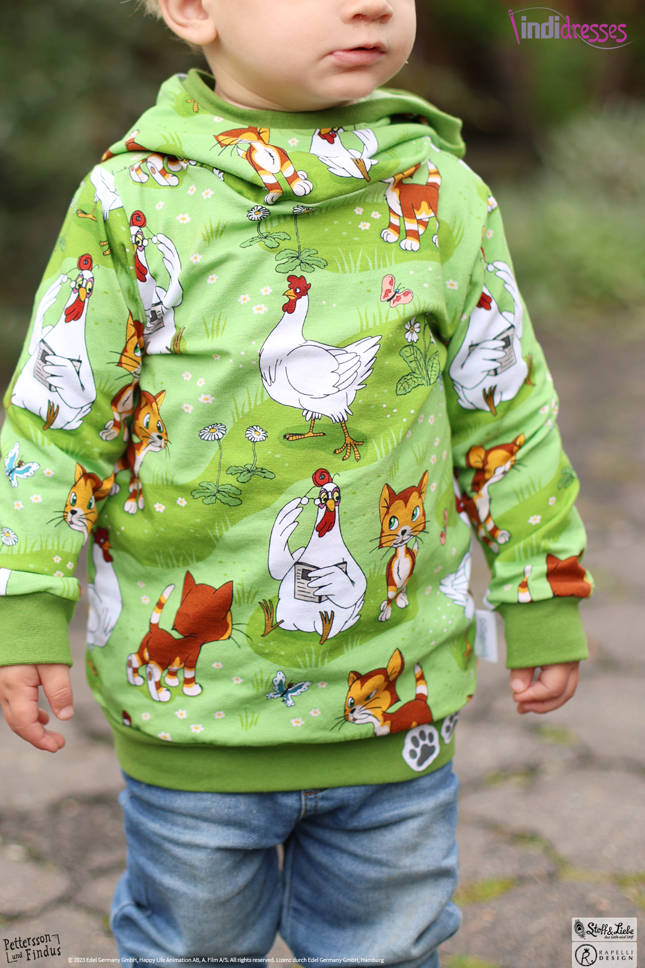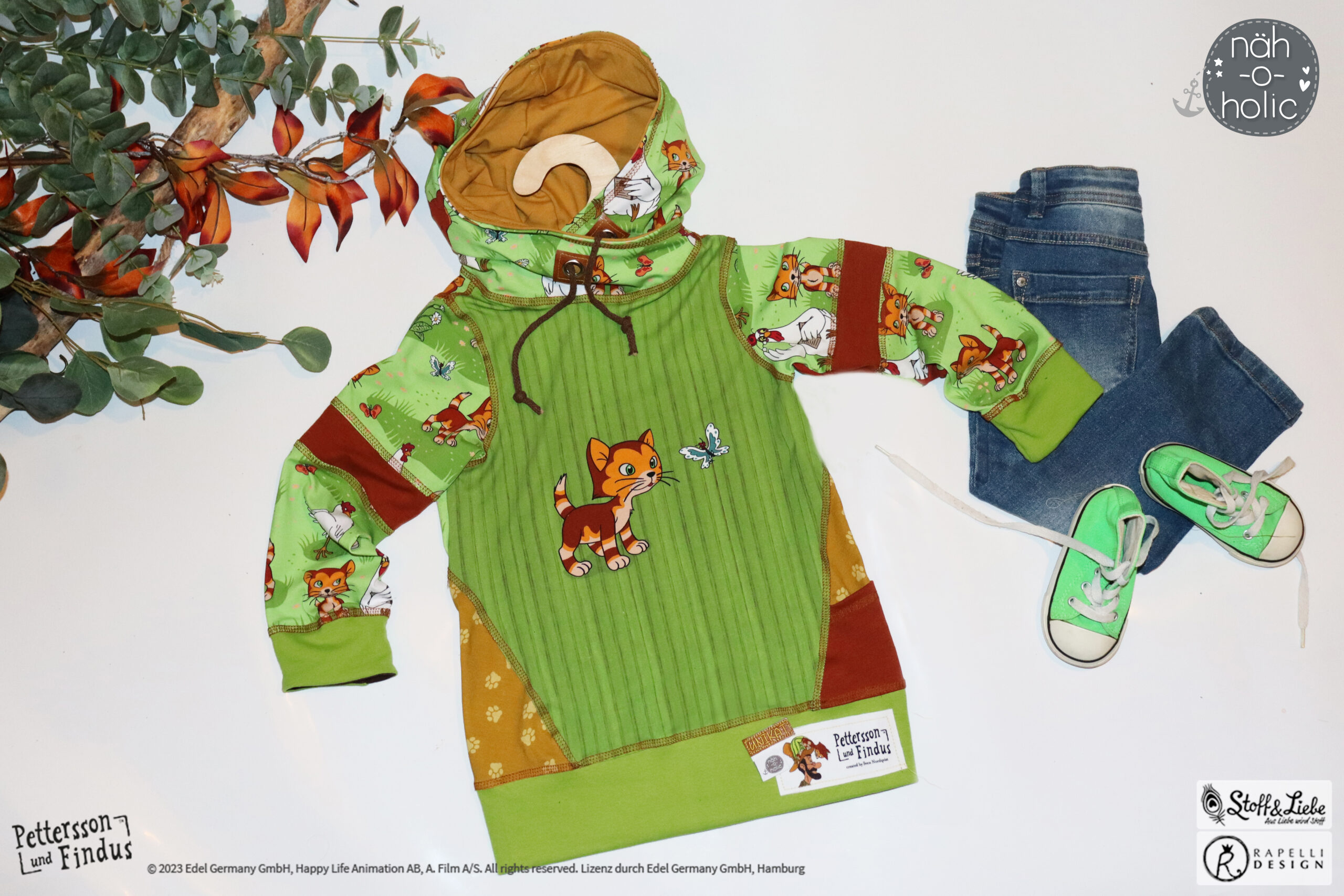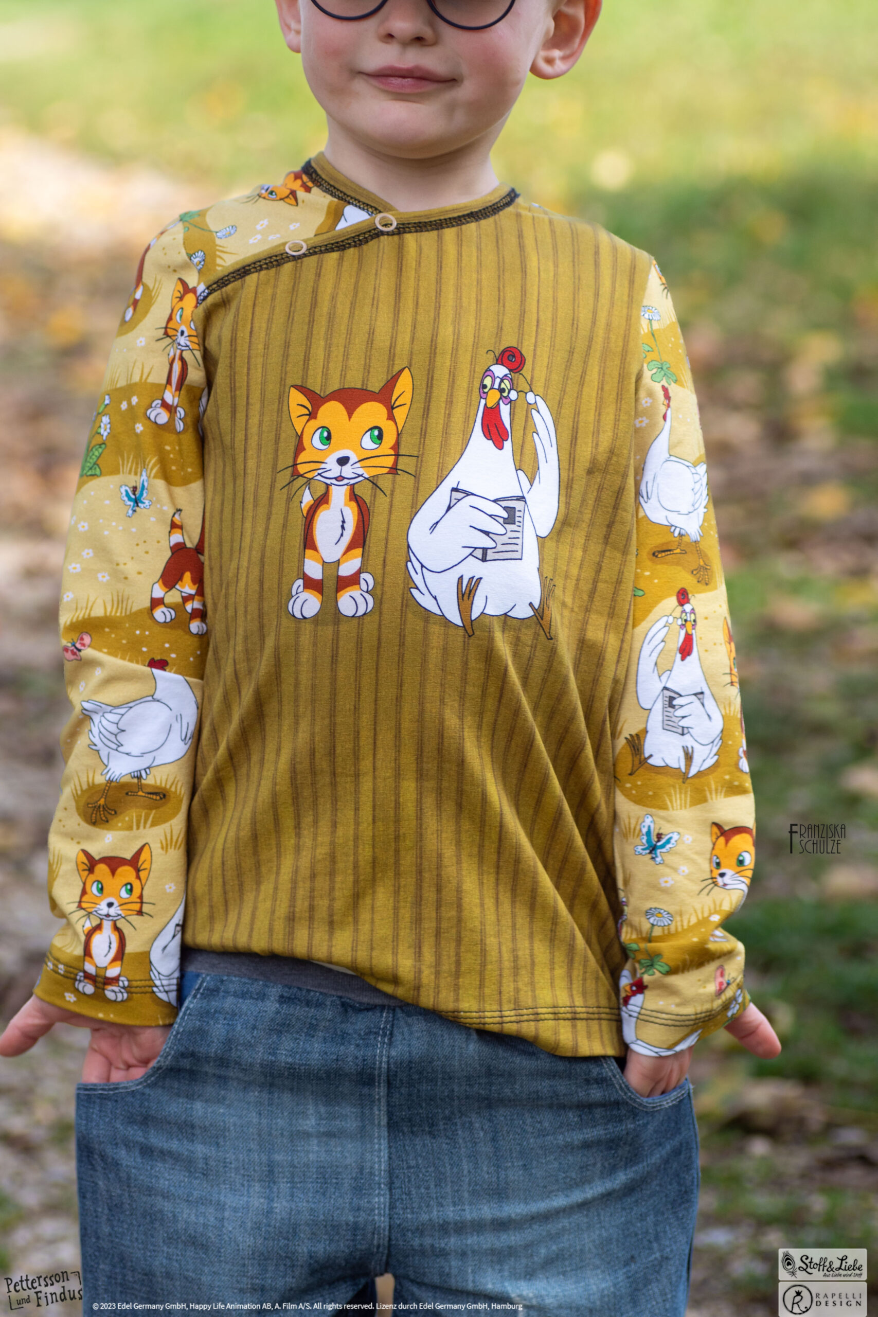 Wie schon bei den ersten zwei „Findus Klein“ Serien, ist auch hier der Hintergrund wieder in Holzoptik gehalten. Dadurch bekommt das Panel seinen ganz besonderen Look und lädt zum Kombinieren mit anderen Stoffen ein.