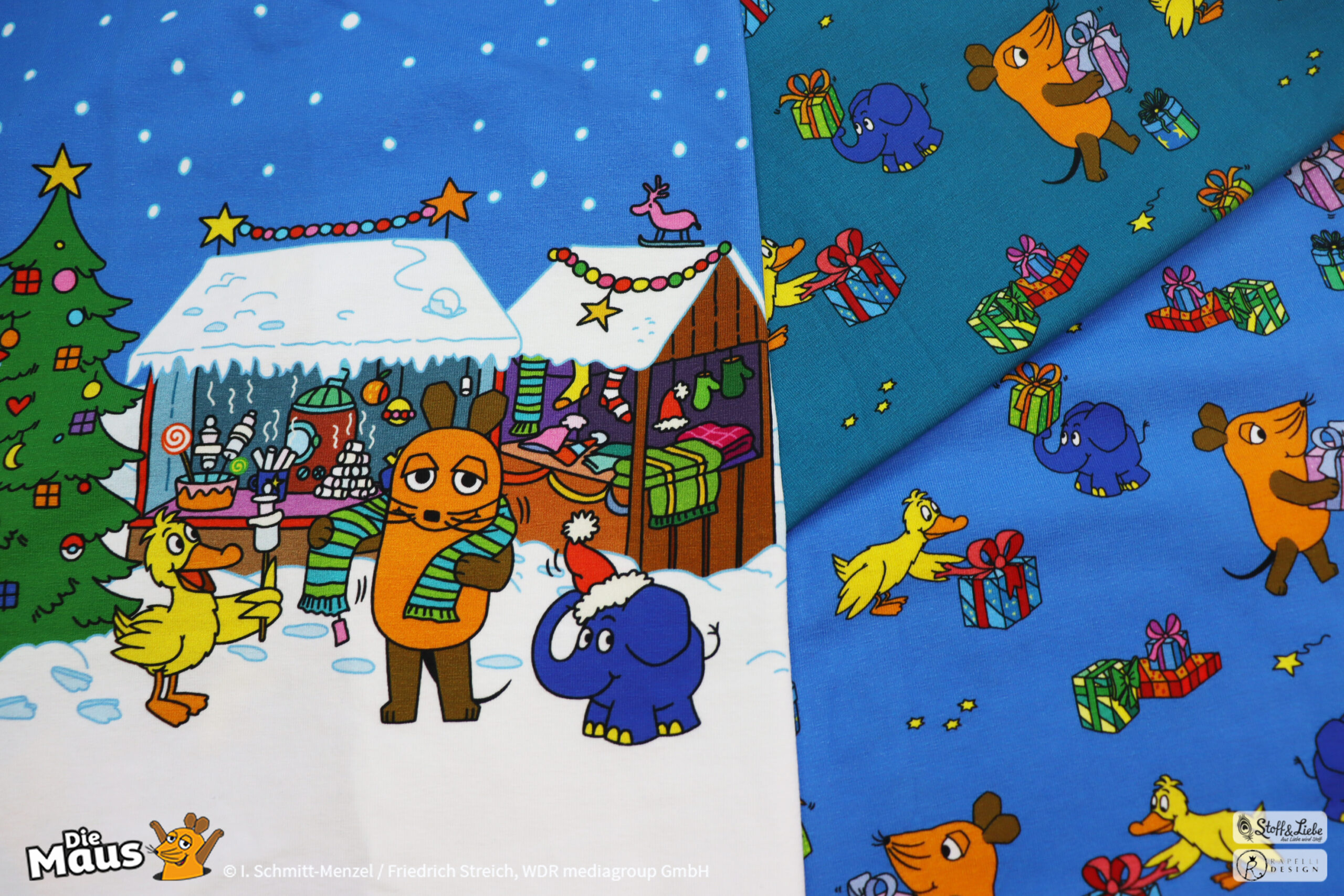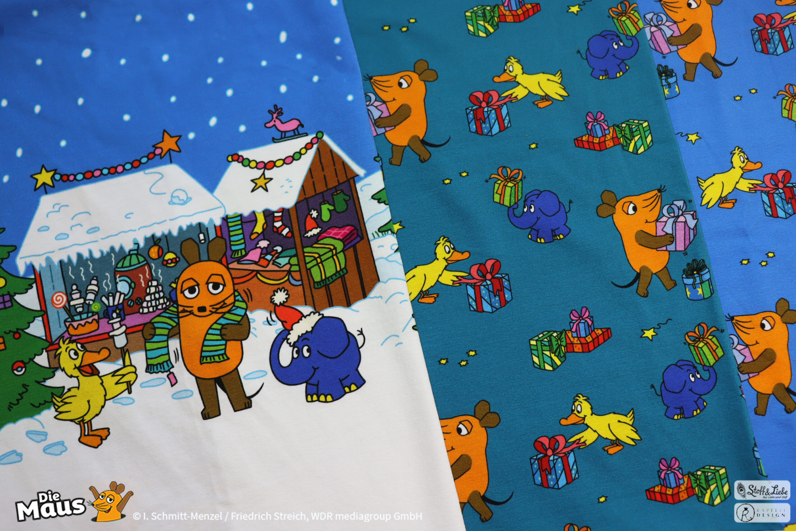 Alle Jahre wieder! Plätzchenduft, Heimlichkeiten, funkelnde Lichter, glänzende Augen. Weihnachtsmarktbesuche, klirrende Kälte, Schlittenfahren… das und vieles mehr wartet in den nächsten Wochen wieder auf uns. Liebt Ihr die Weihnachtszeit auch so sehr wie DieMaus, der Elefant und die Ente? Dann kommt Ihr an diesen Stoffen nicht vorbei!