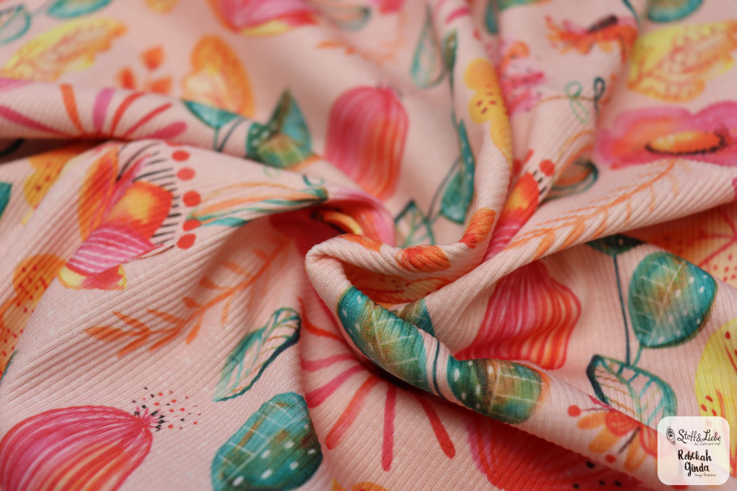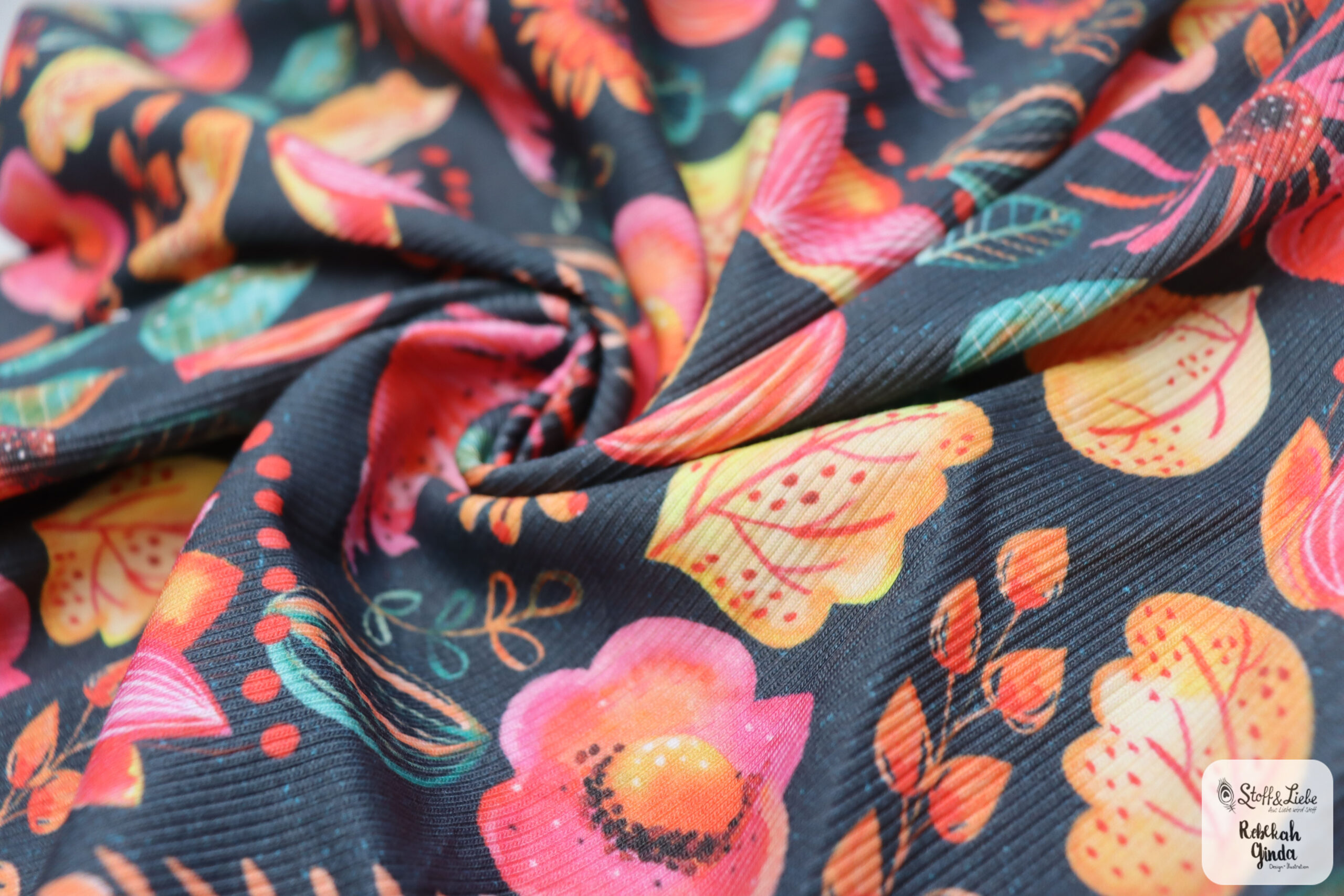 Unser Rippjersey ist angenehm weich und schmiegt sich wunderbar an. Er fühlt sich nicht nur toll an, er hinterlässt auch ein angenehmes Tragegefühl und ist dazu total bequem. Die Materialzusammensetzung besteht aus 95 % Baumwolle und 5 % Elasthan. Die Grammatur liegt bei 240 g/qm. Eine wichtige Info bei der Berechnung Eurer benötigten Menge für Eure geplanten Nähwerke ist, das der Rippjersey ca. 110 cm breit liegt. Das Design stammt natürlich aus der Feder von Rebekah Ginda. Genauso wie auch schon die Kollektionen aus Jersey und French Terry.