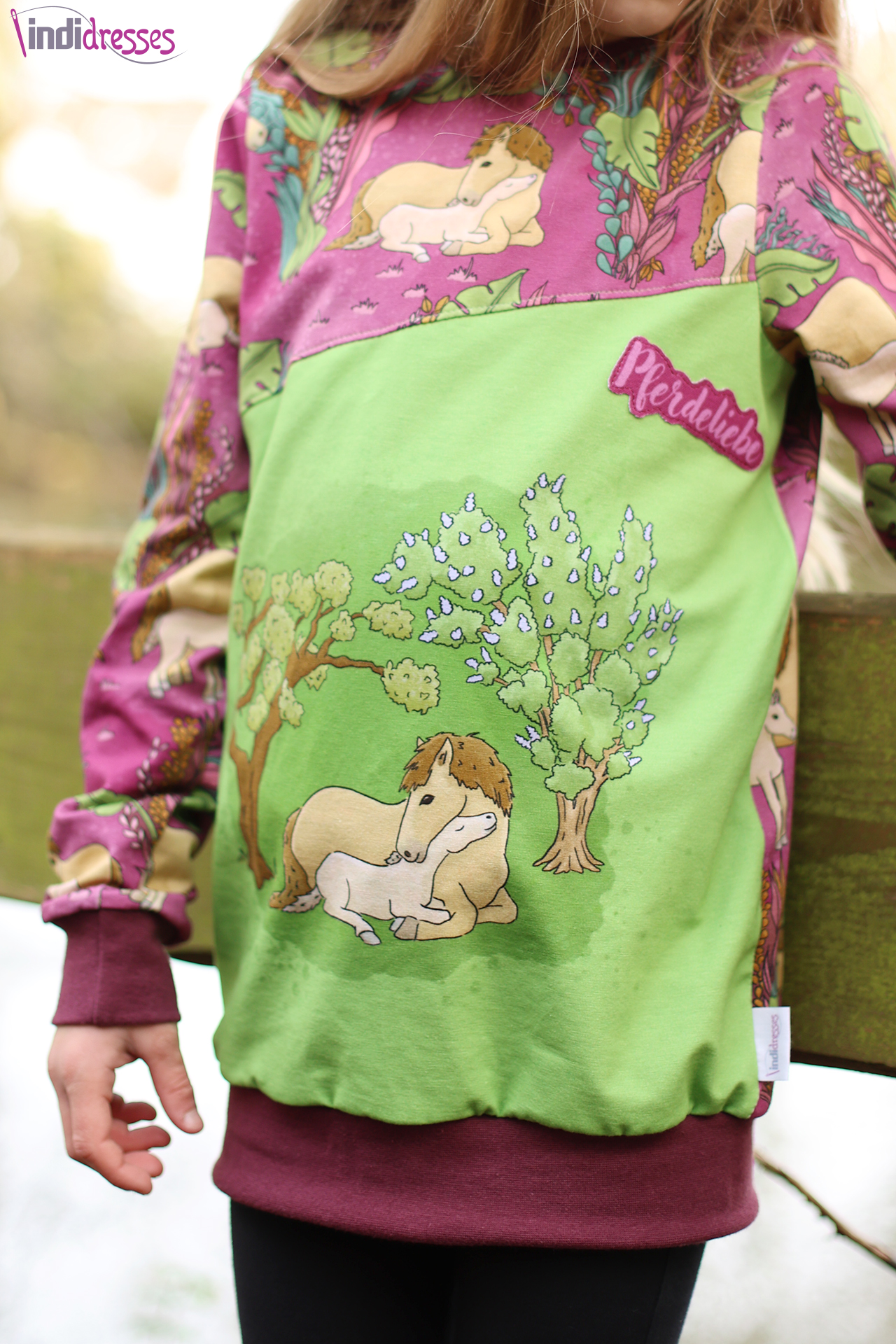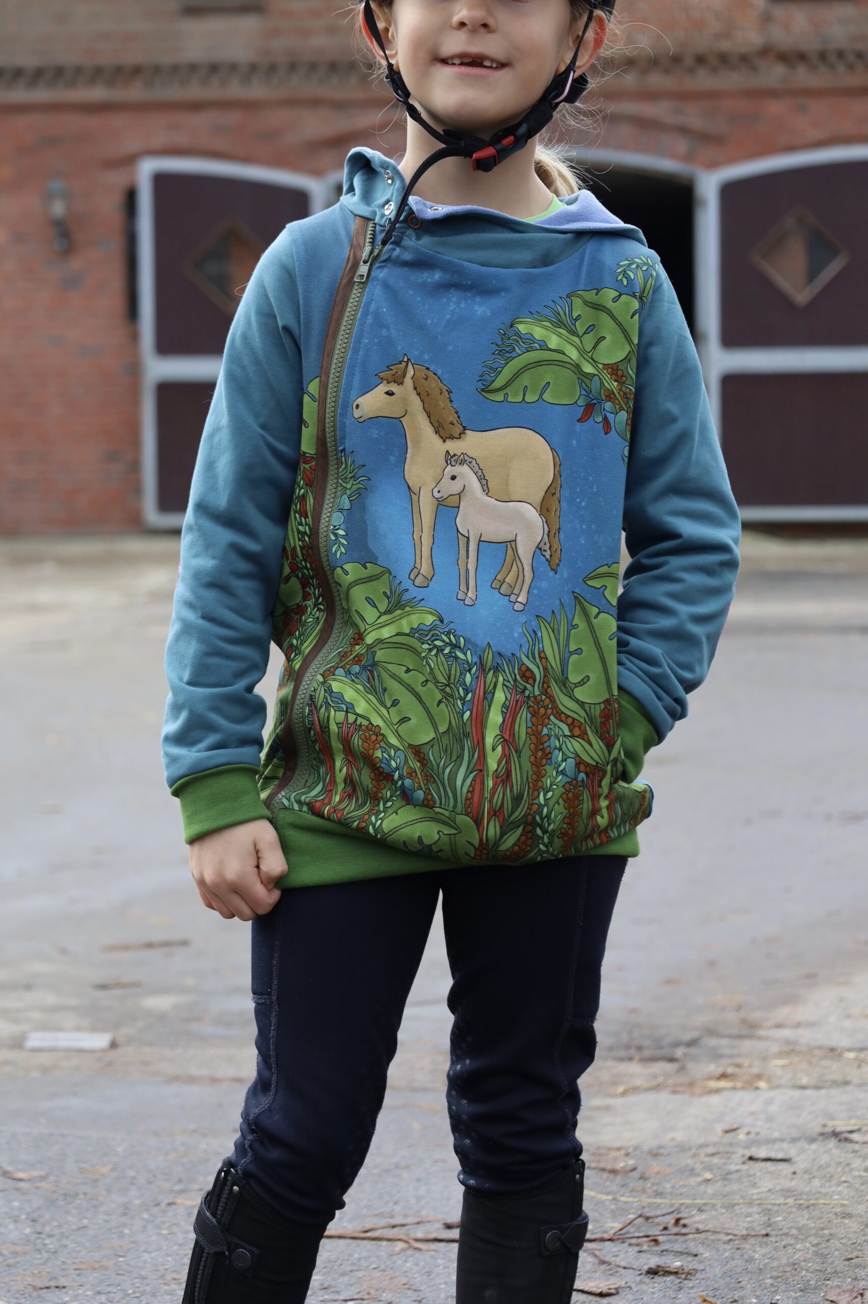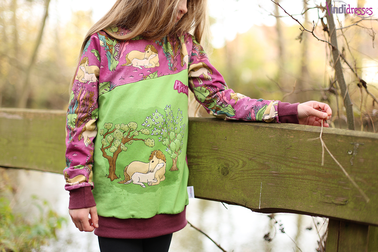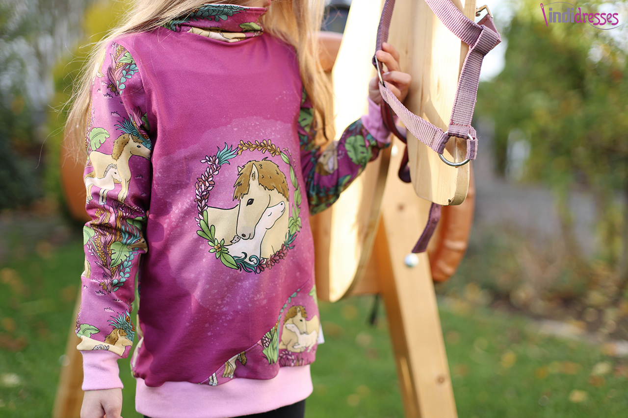 Solo vernäht ist dieser Stoff auch einfach wunderbar. Wie wäre es mit einem lässigen Pulli? Oder doch lieber einem eleganten Kleid? Sicher könnt Ihr auch Eure Reitgarderobe hiermit aufstocken. Oder eine leichte Jacke für nach dem Ausritt? Egal was Ihr näht, mit diesen Stoffen könnt Ihr jedem ohne auch nur ein Wort von Eurer Pferdeliebe überzeugen. Hier ist wieder so vieles möglich. Lasst Euch gerne auch von unseren Designbeispielen inspirieren.