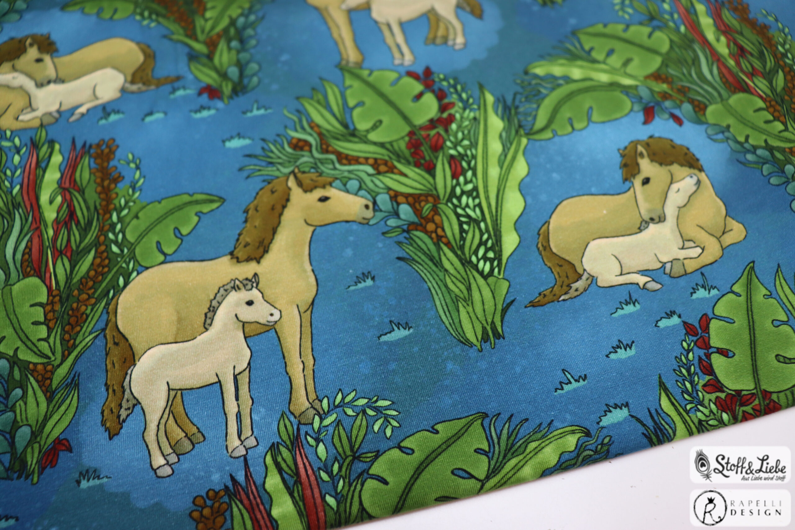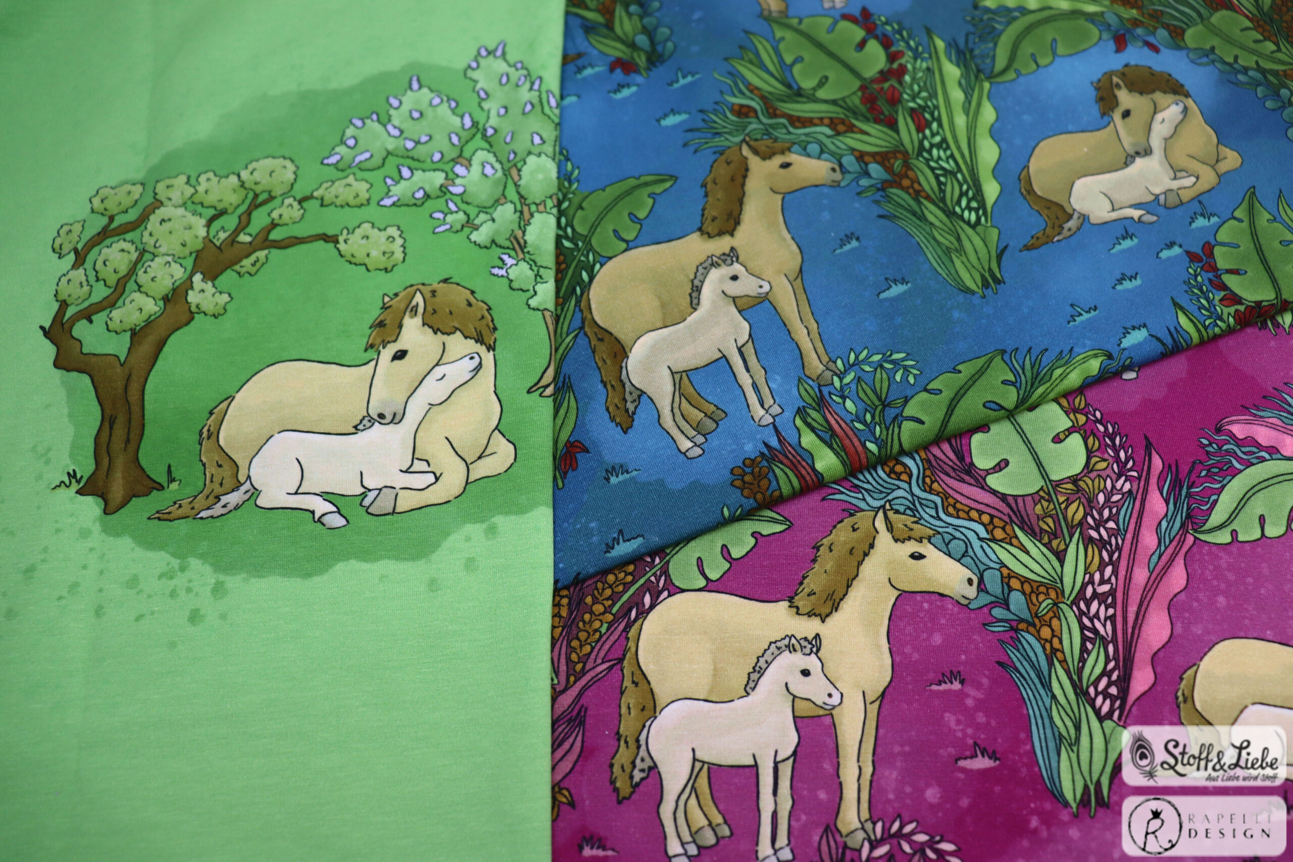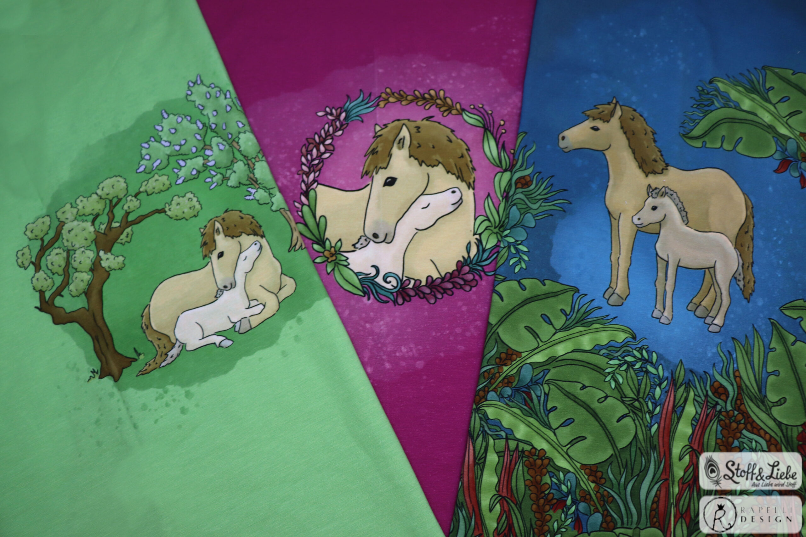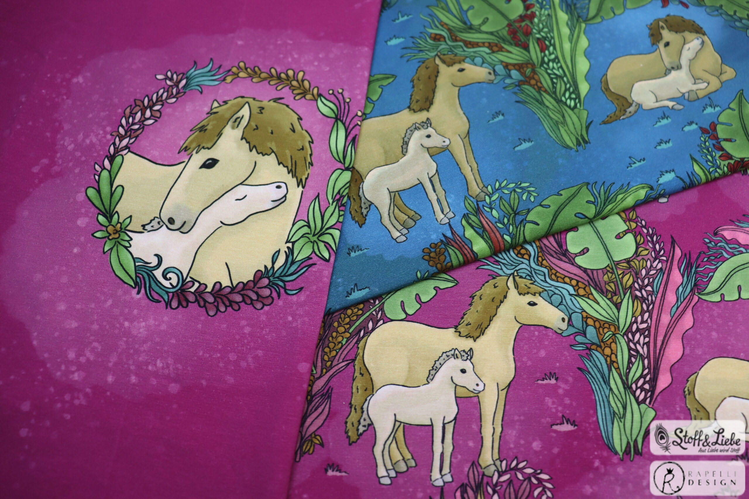 Unsere „Pferdeliebe“ Kollektion stammt aus der Feder von Rapelli Design. Wir haben für Euch ein Panel und einen Allover in zwei Farbvarianten. Die Stoffe dieser Kollektionen erscheinen auf Jersey und haben eine Materialzusammensetzung von 95% Baumwolle und 5% Elasthan.
