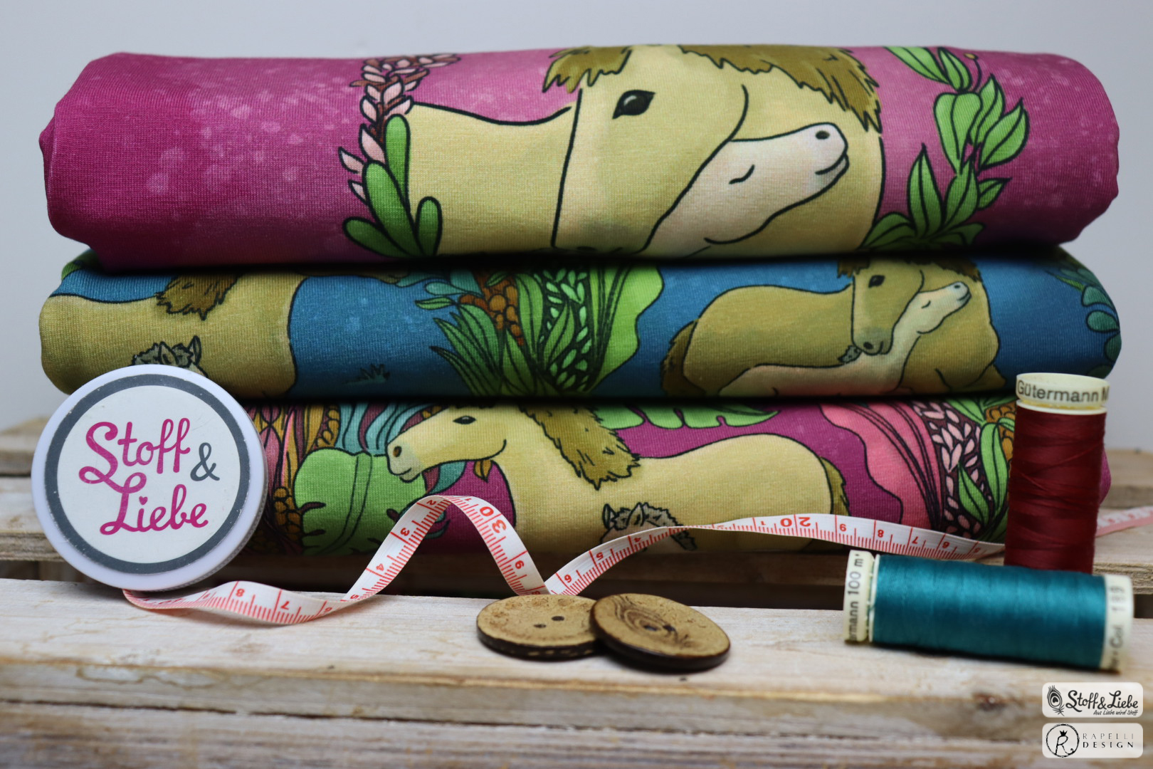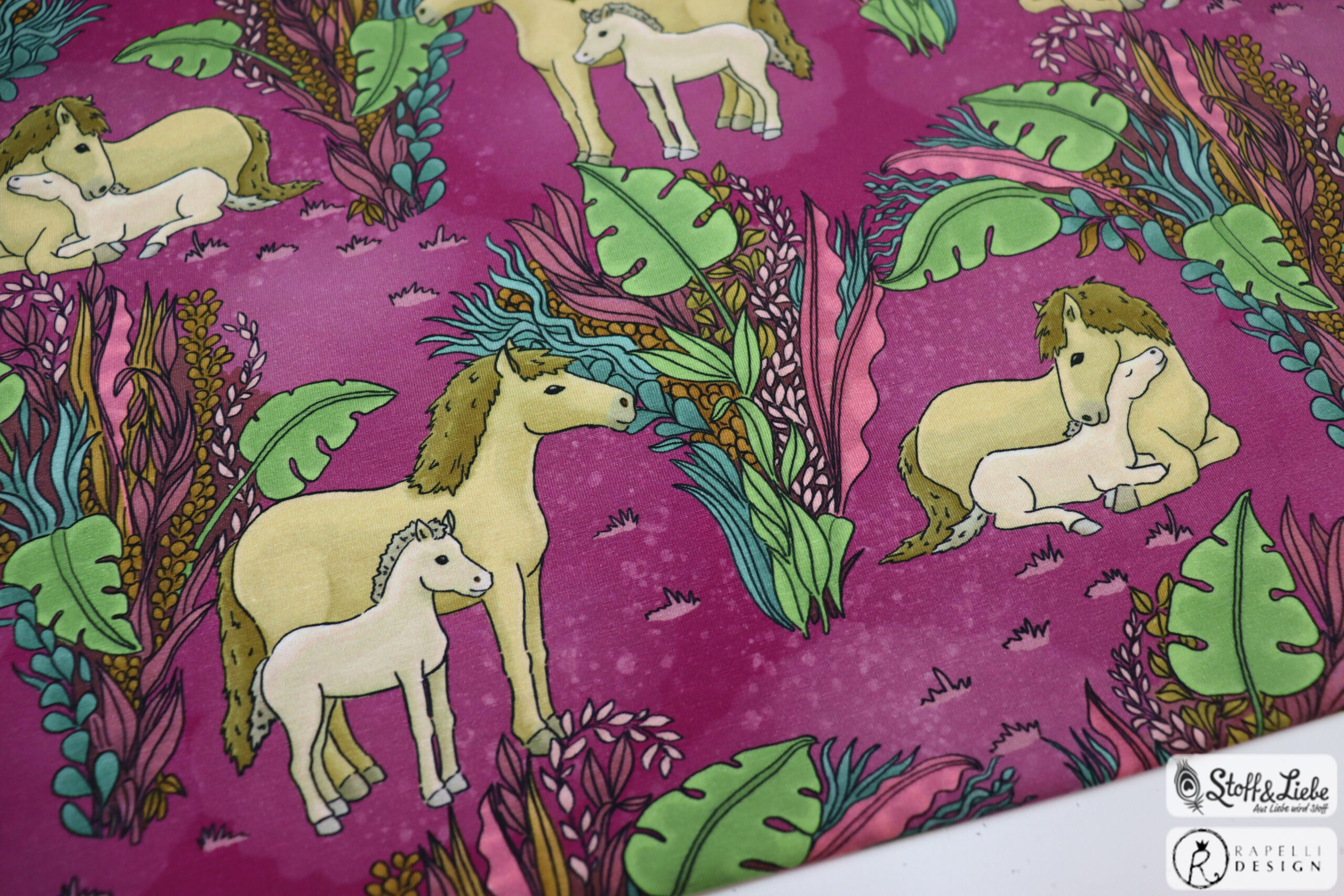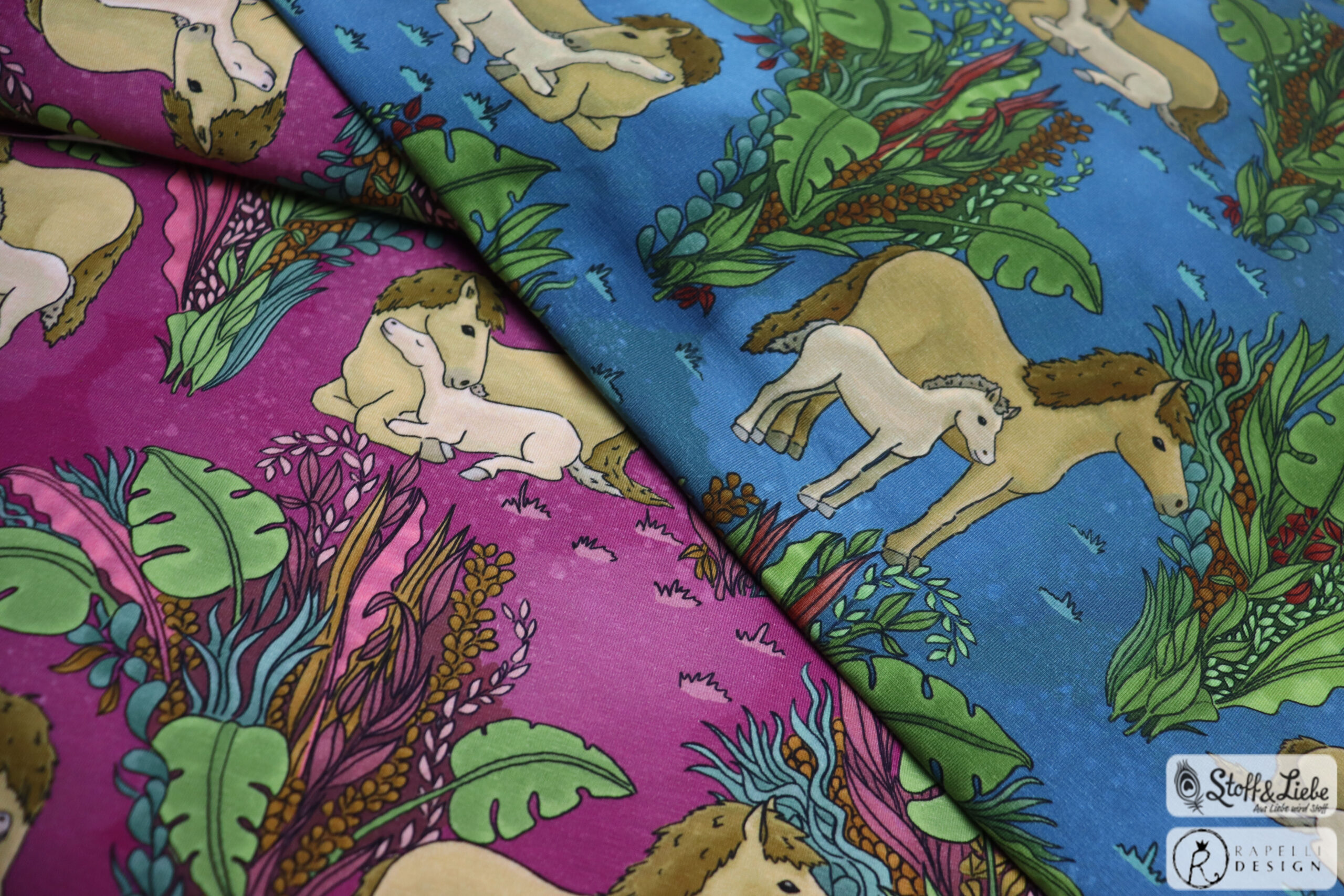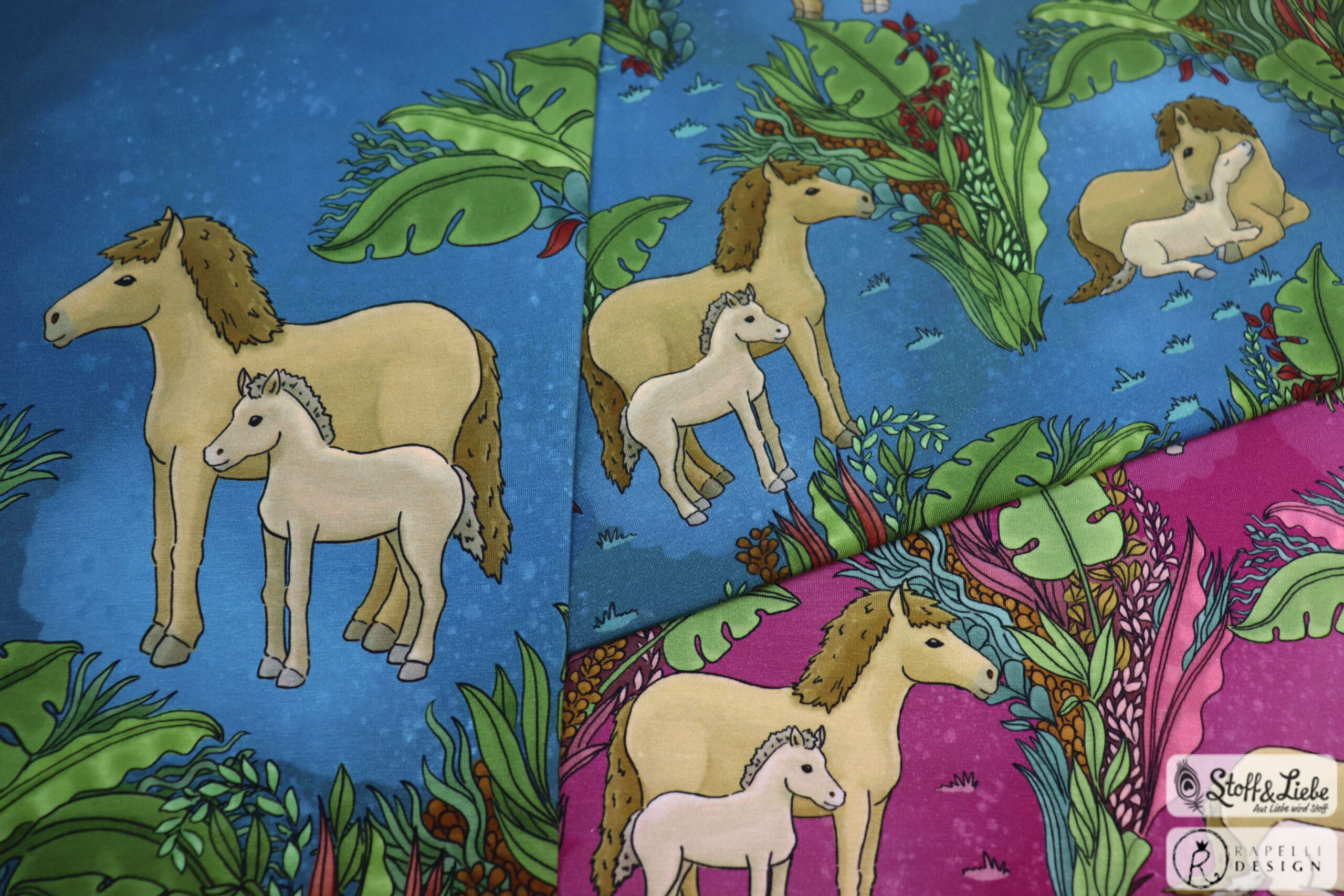 Unsere „Pferdeliebe“ Kollektion stammt aus der Feder von Rapelli Design. Wir haben für Euch ein Panel und einen Allover in zwei Farbvarianten. Die Stoffe dieser Kollektionen erscheinen auf Jersey und haben eine Materialzusammensetzung von 95% Baumwolle und 5% Elasthan.