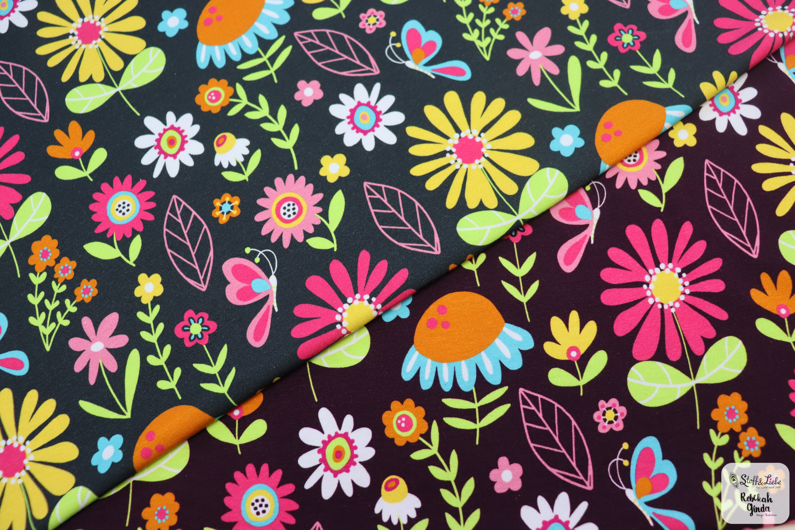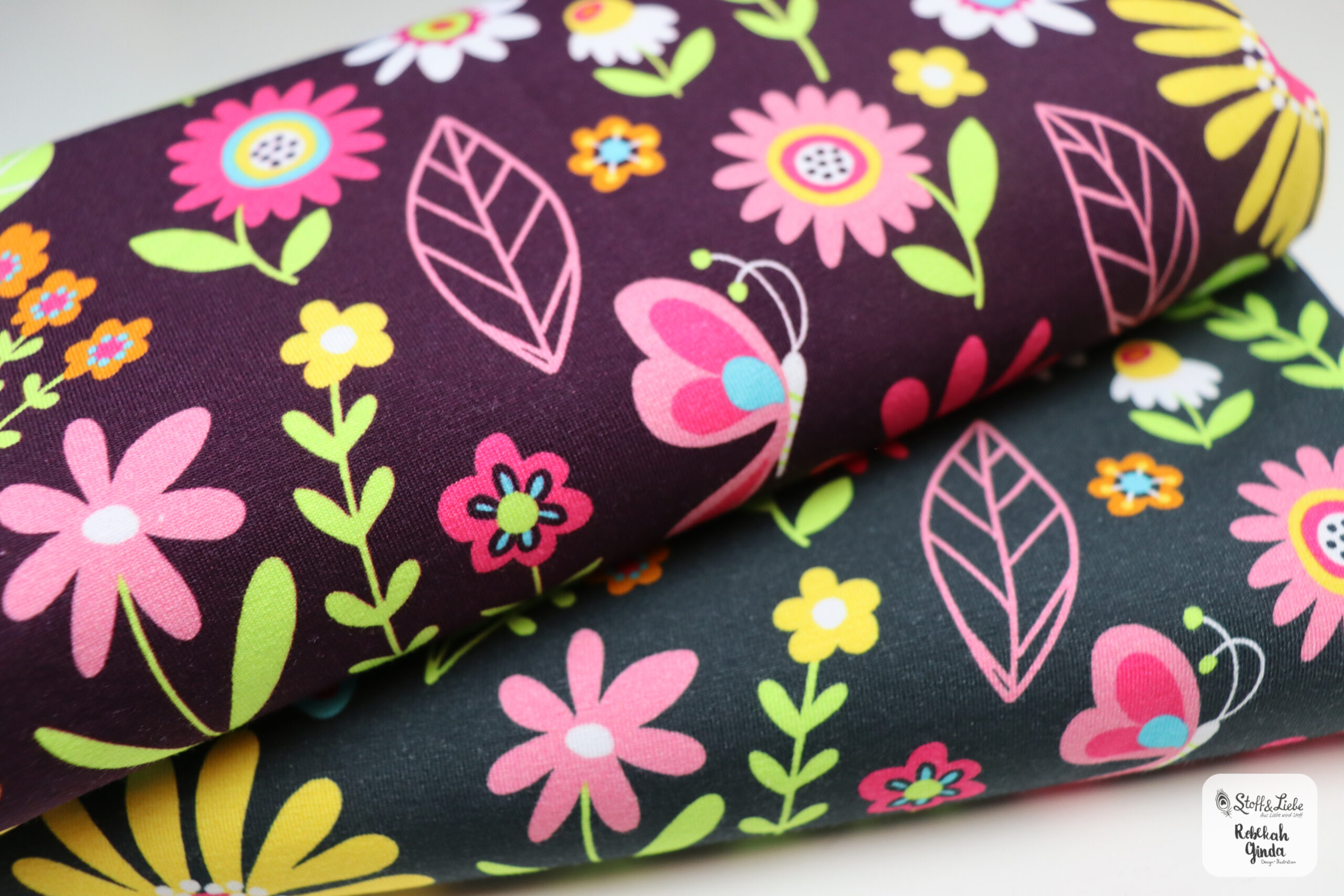 Durch die enthaltenen Farben der Blumen habt Ihr wieder alle Möglichkeiten Eure Nähwerke zu gestalten. Passend zum Panel haben wir einen Allover in zwei Farbvarianten für Euch.