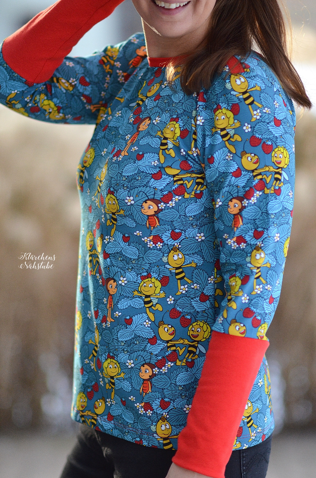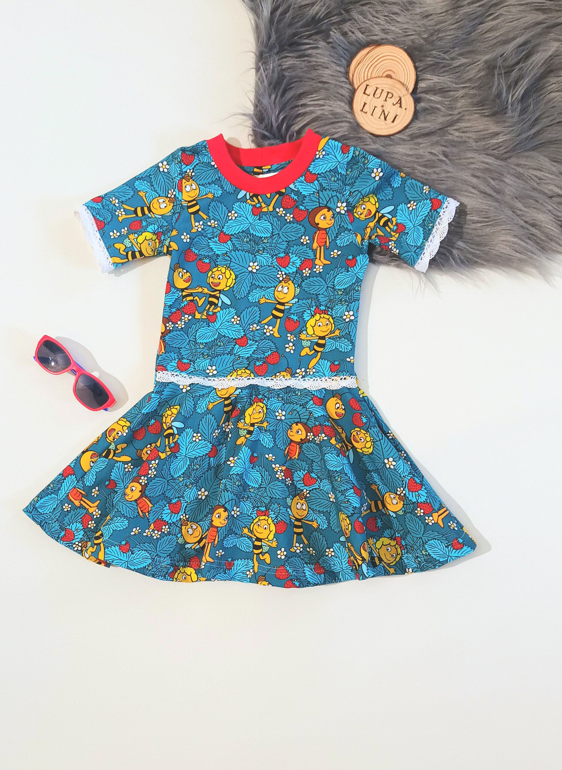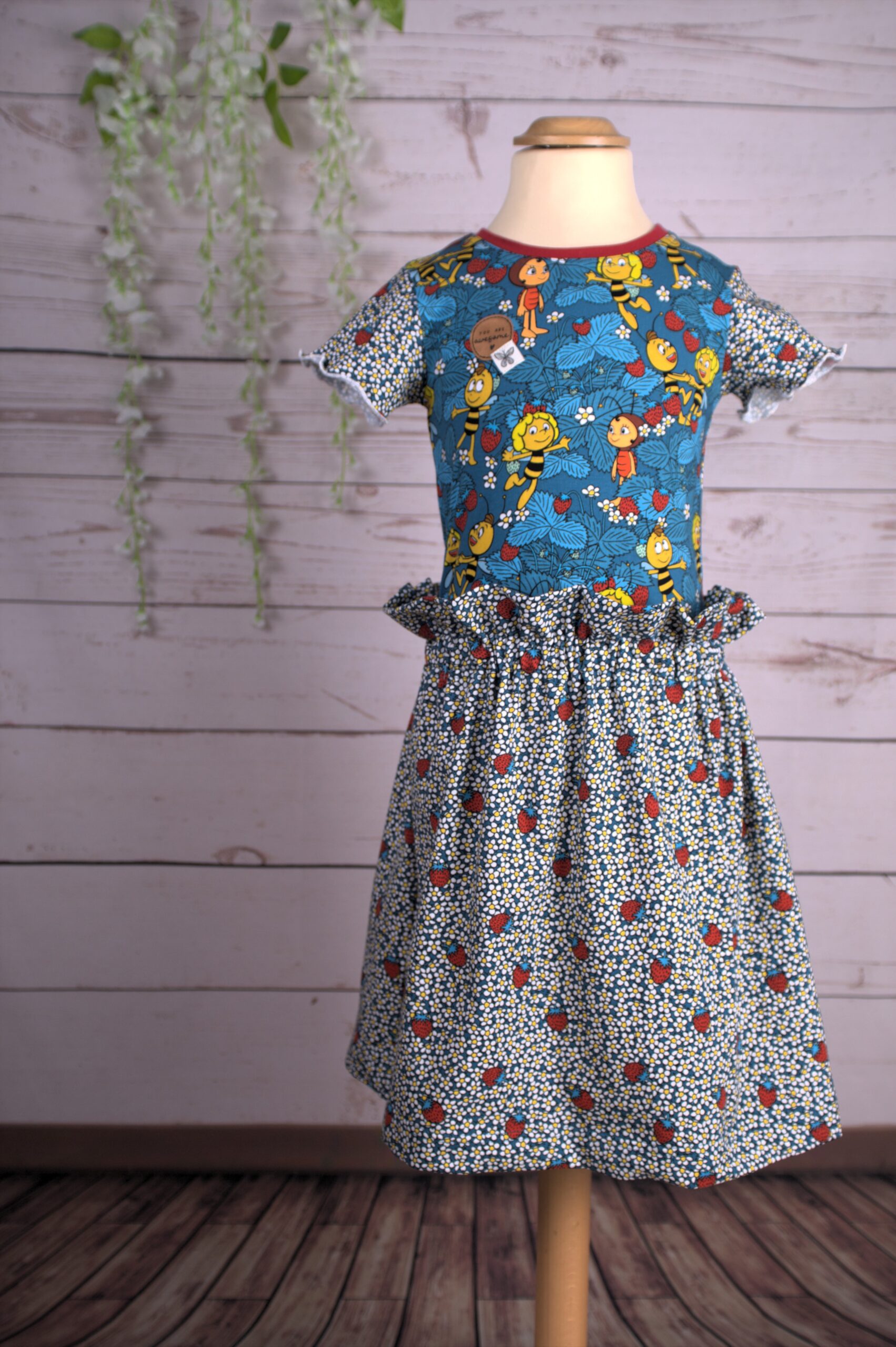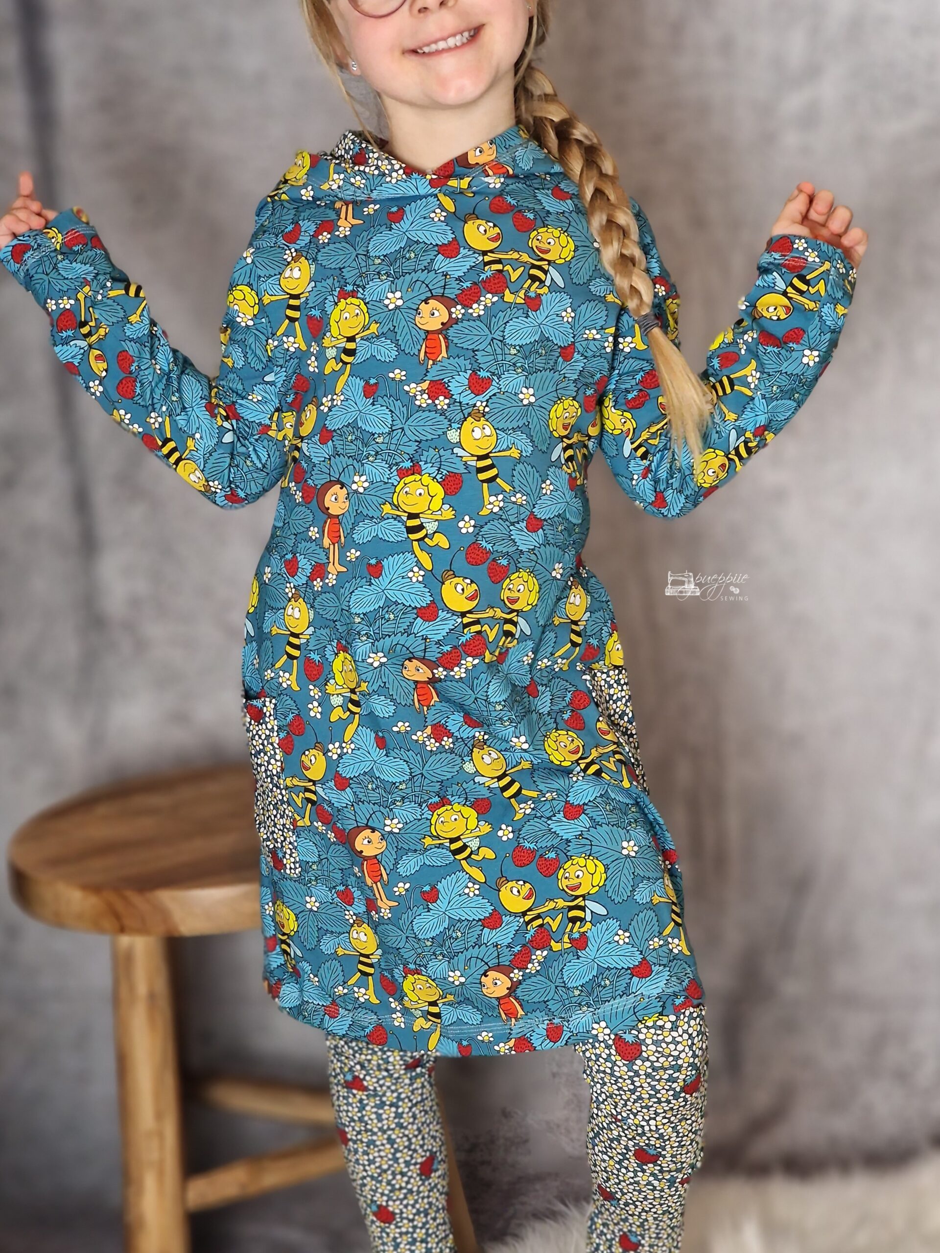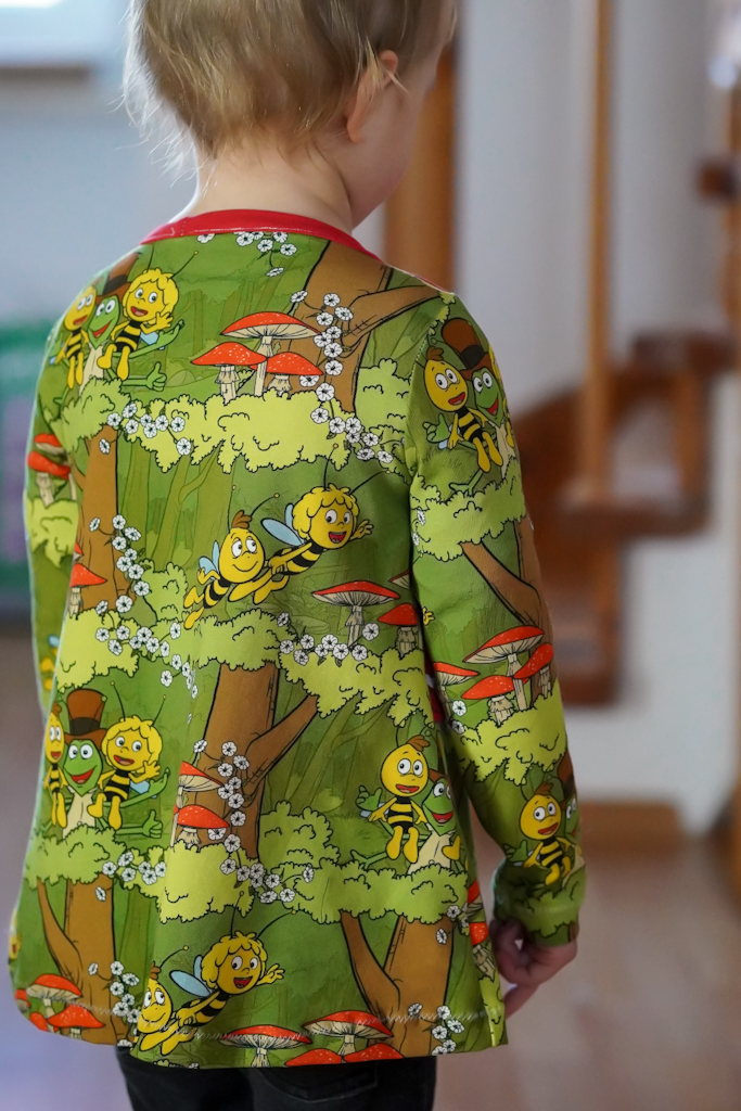 Die Motive haben hier eine Größe von ca. 2,5 cm (Erdbeeren) und ca. 7 cm (Maja). Dadurch sind auch diese beiden Stoffe in vielen Größen wunderbar vernähbar ohne überladen zu wirken.