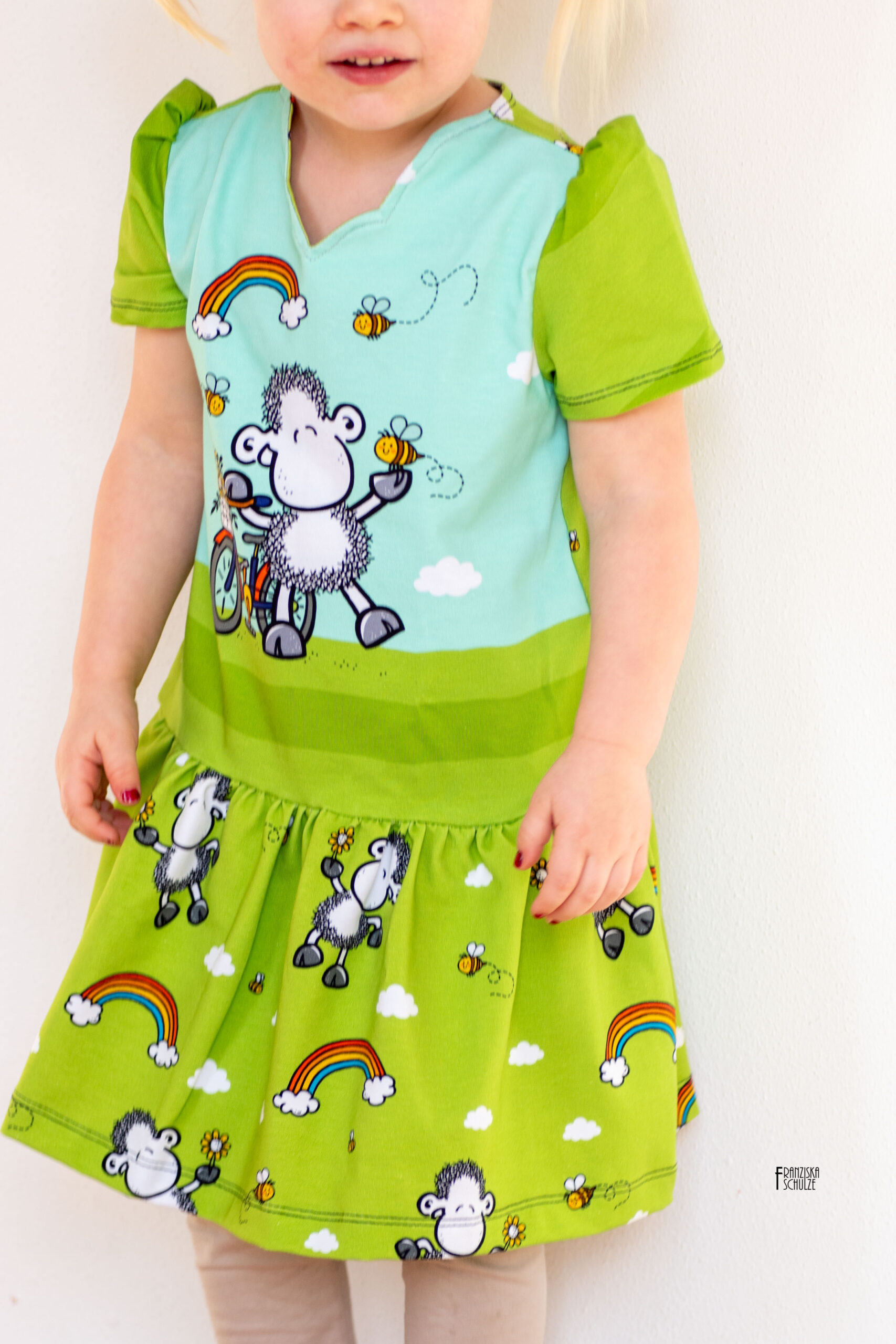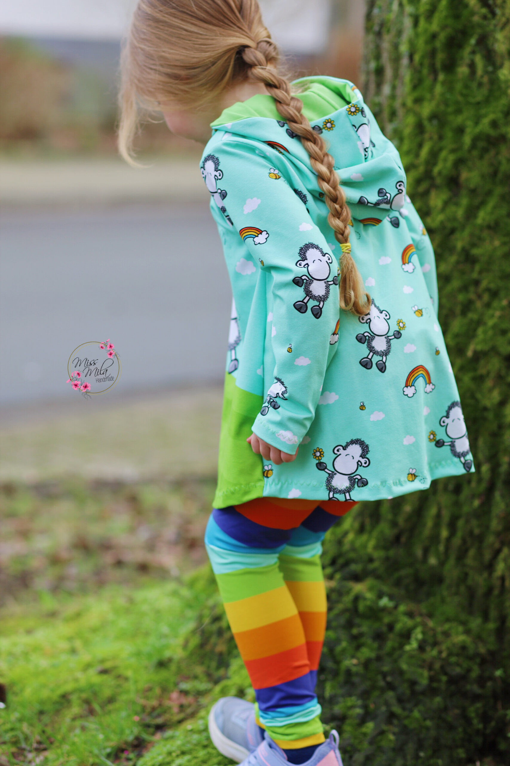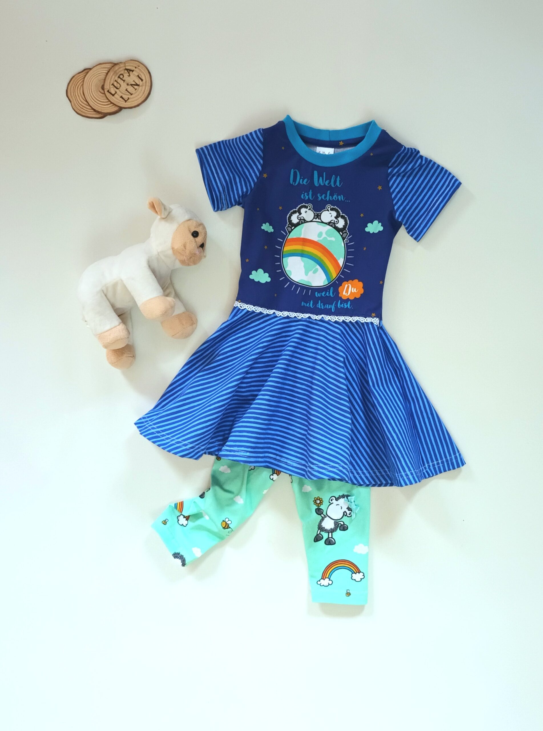 Den Allover „Die Welt ist schön“ bekommt Ihr in zwei Farben: Grün und Mint. Hier findet Ihr das liebenswerte Schäfchen in einer Größe von ca. 8,3 cm, umrahmt von Wolken, Regenbögen und Bienchen.