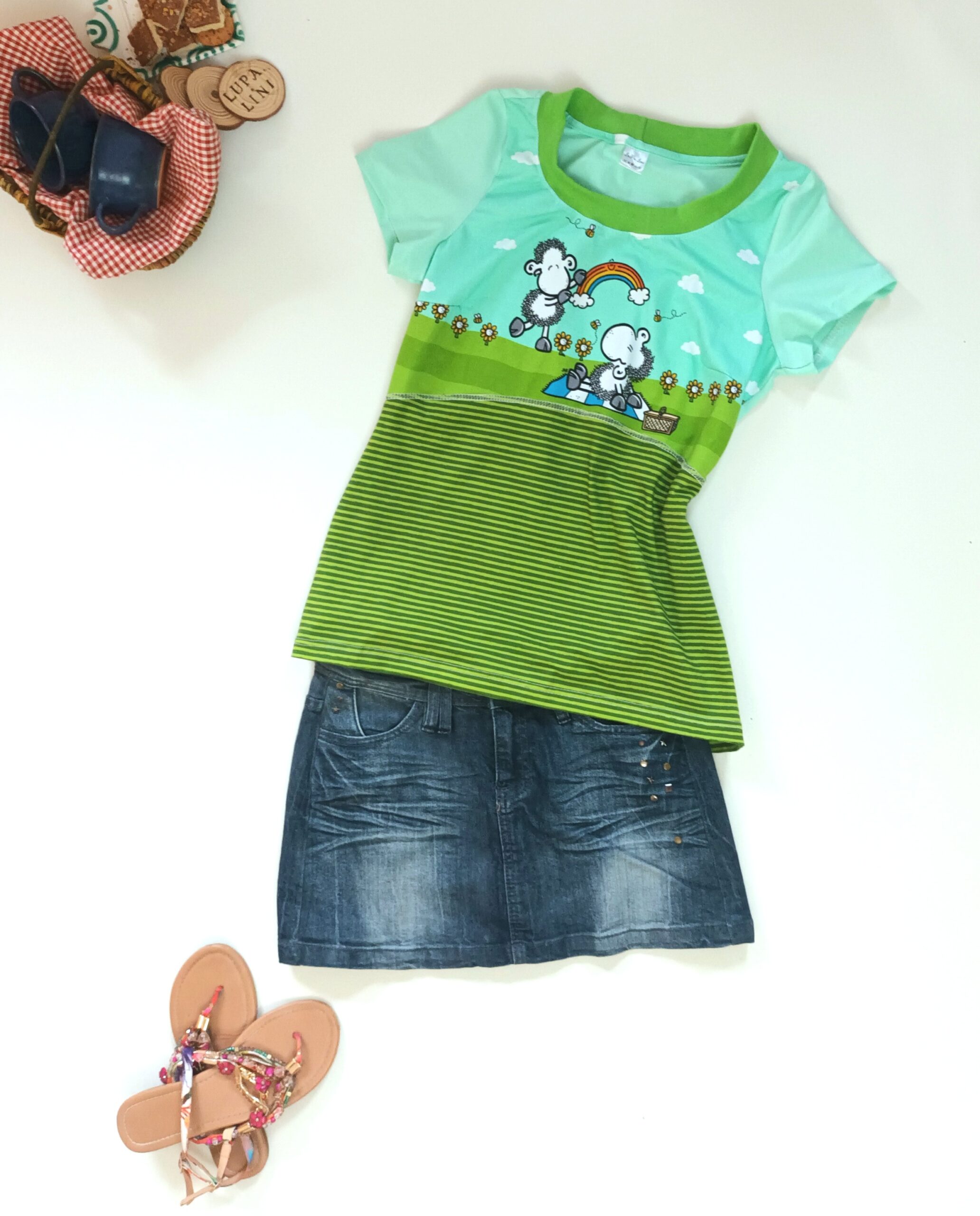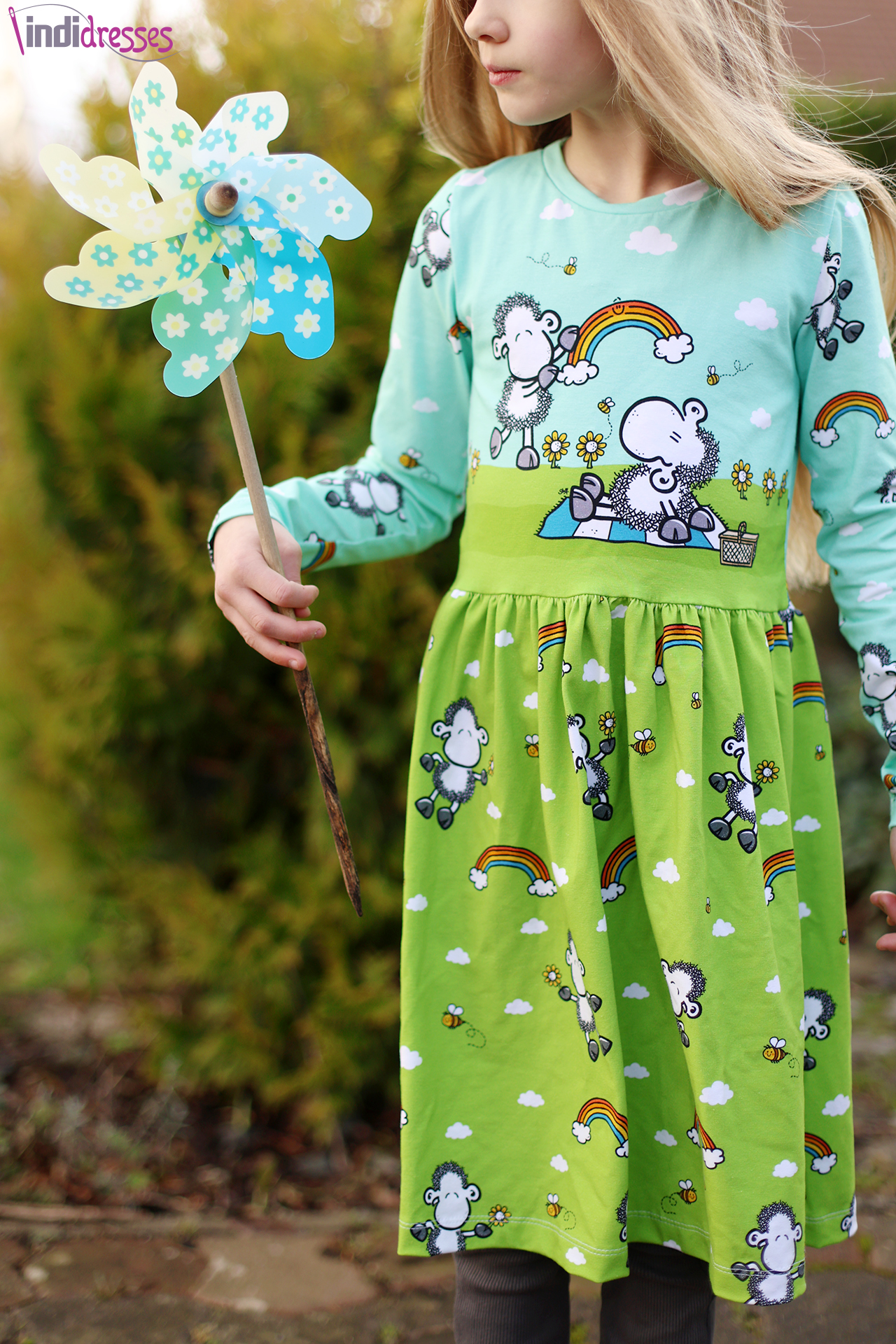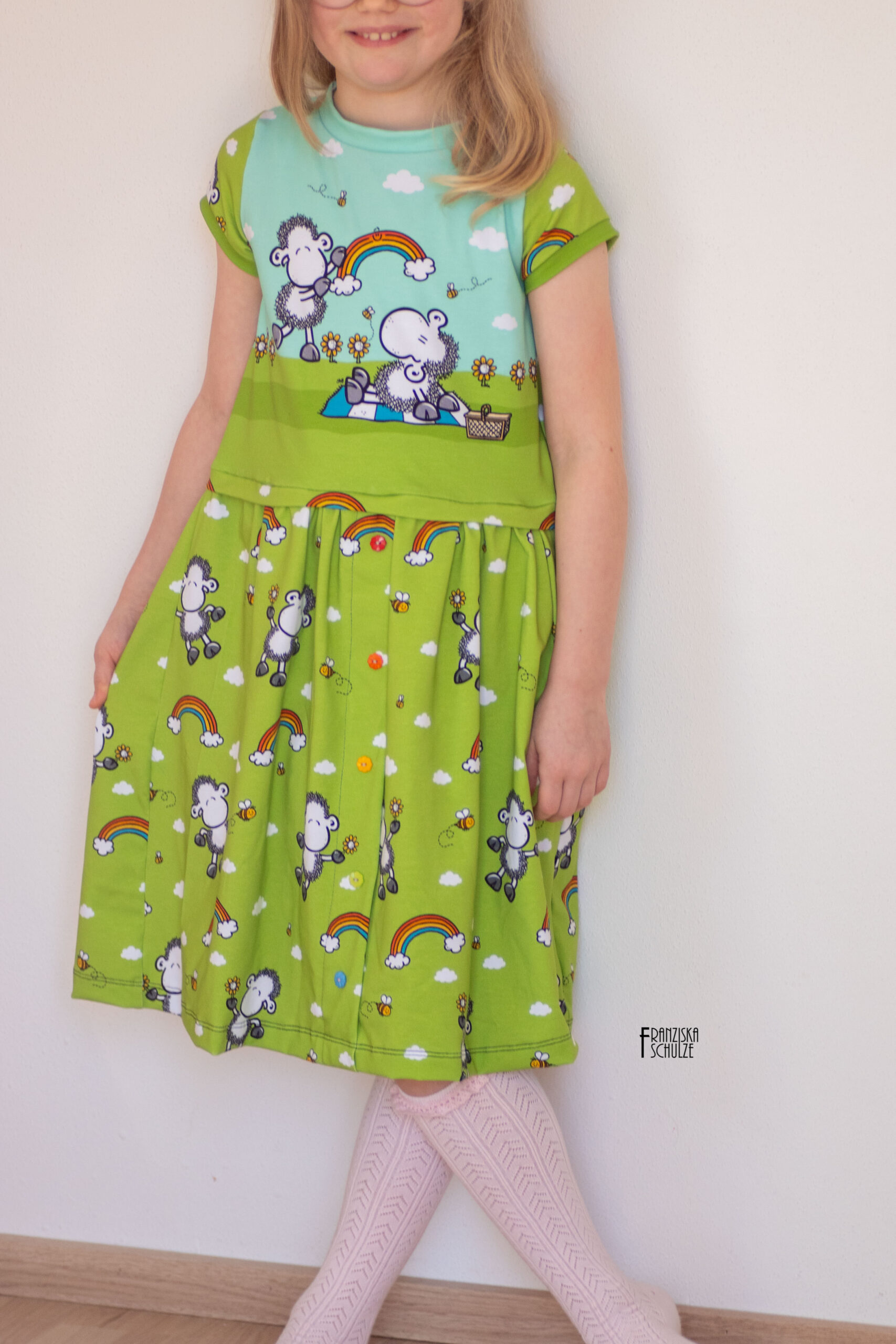 Den Allover „Die Welt ist schön“ bekommt Ihr in zwei Farben: Grün und Mint. Hier findet Ihr das liebenswerte Schäfchen in einer Größe von ca. 8,3 cm, umrahmt von Wolken, Regenbögen und Bienchen.