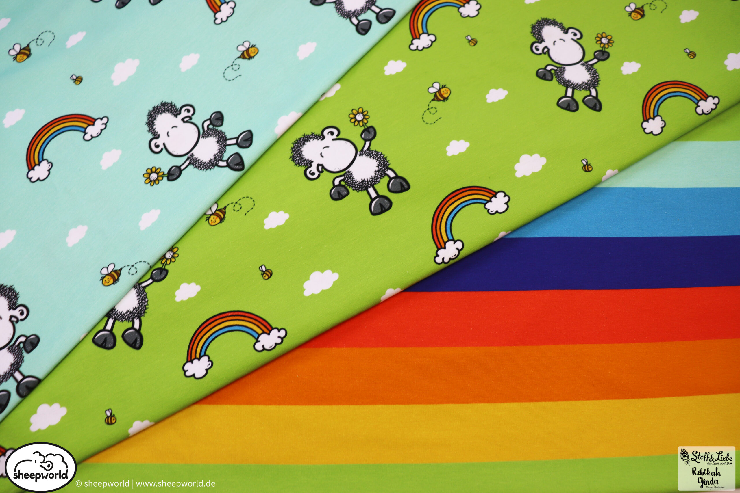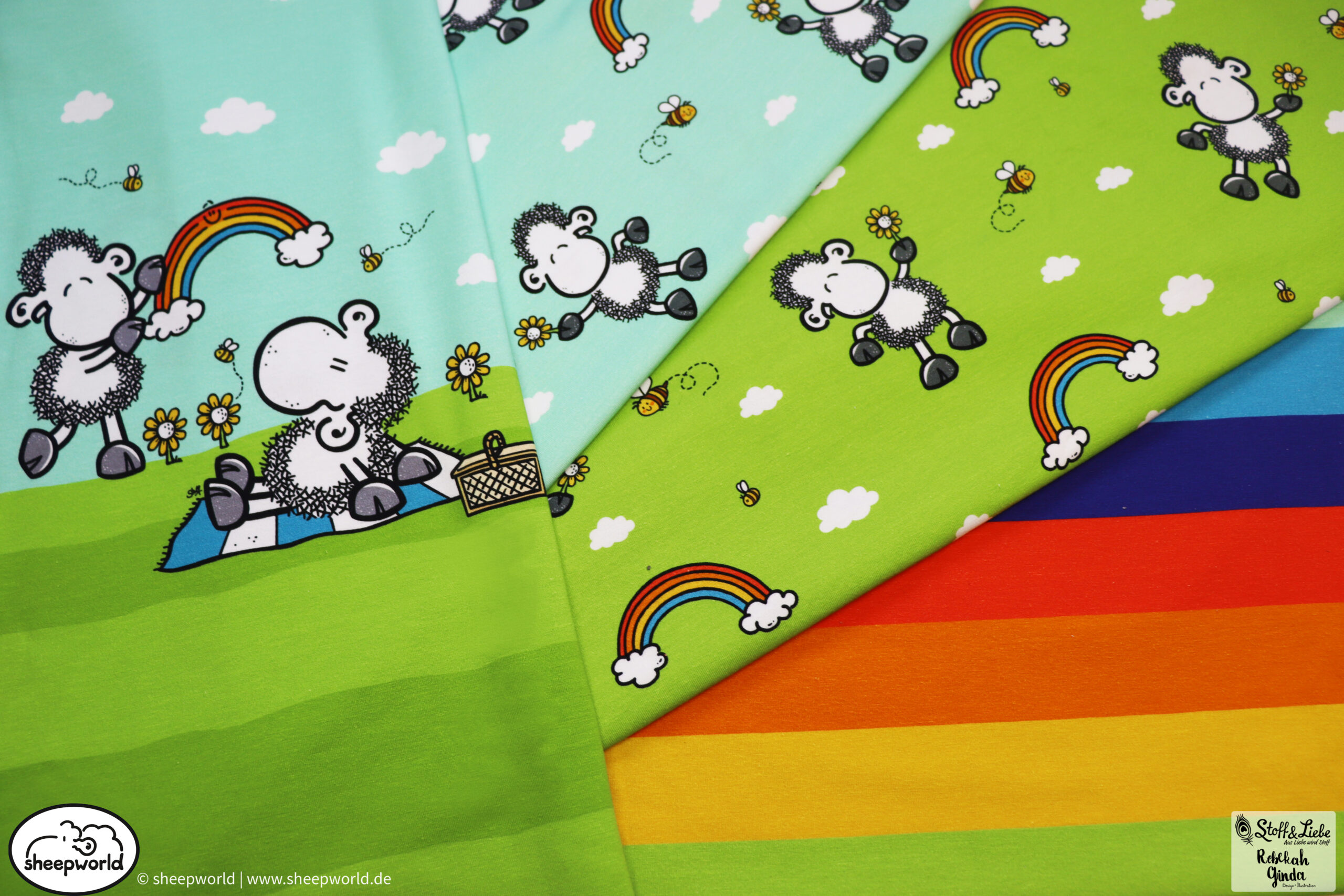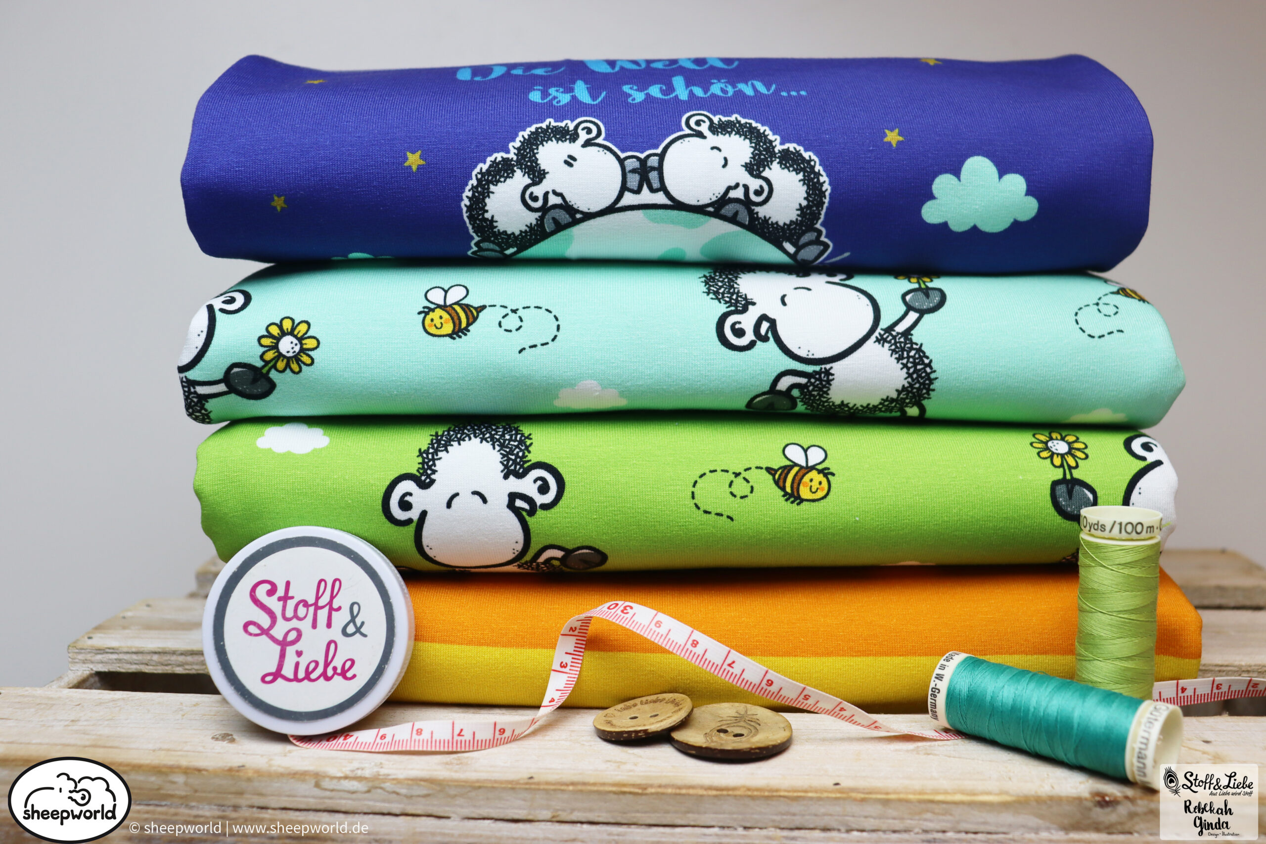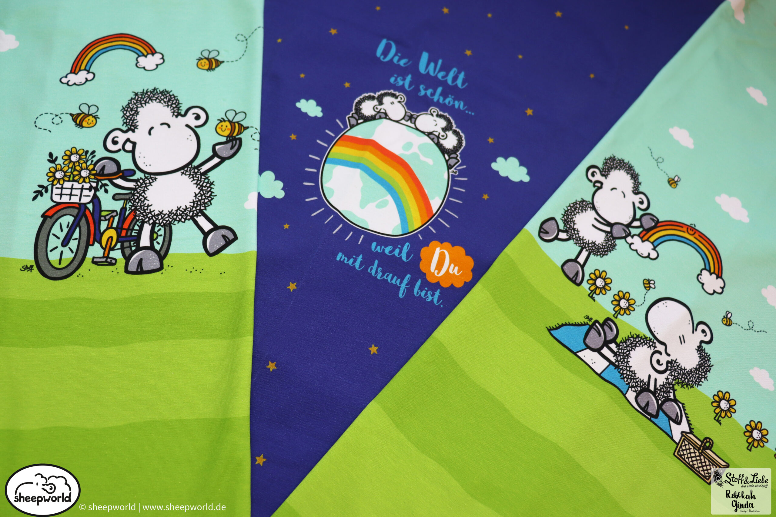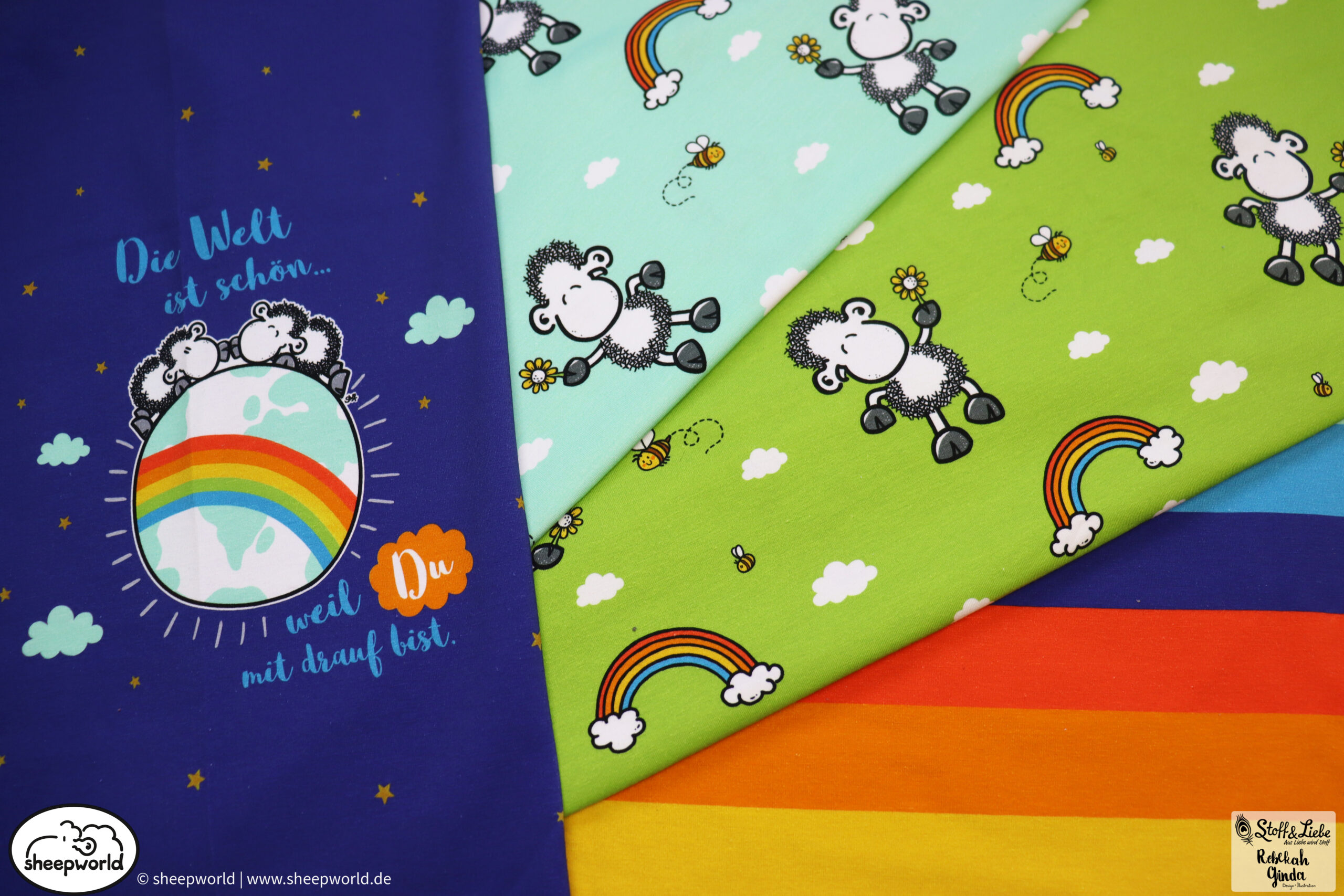 Unsere „sheepworld – Die Welt ist schön “ Kollektion wurde umgesetzt von Rebekah Ginda Design. Wir haben für Euch ein Panel, einen Hauptstoff in zwei Farben und passend dazu einen Kombistoff. Die Stoffe dieser Kollektionen erscheinen auf Jersey und haben eine Materialzusammensetzung von 95% Baumwolle und 5% Elasthan.