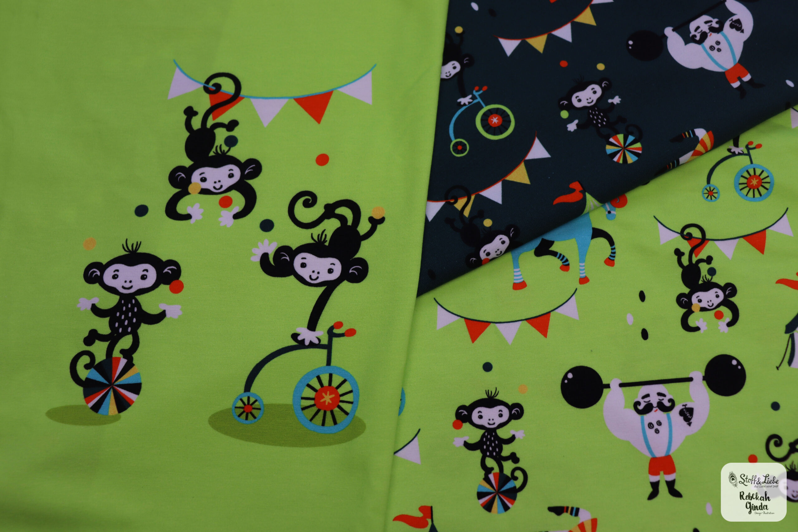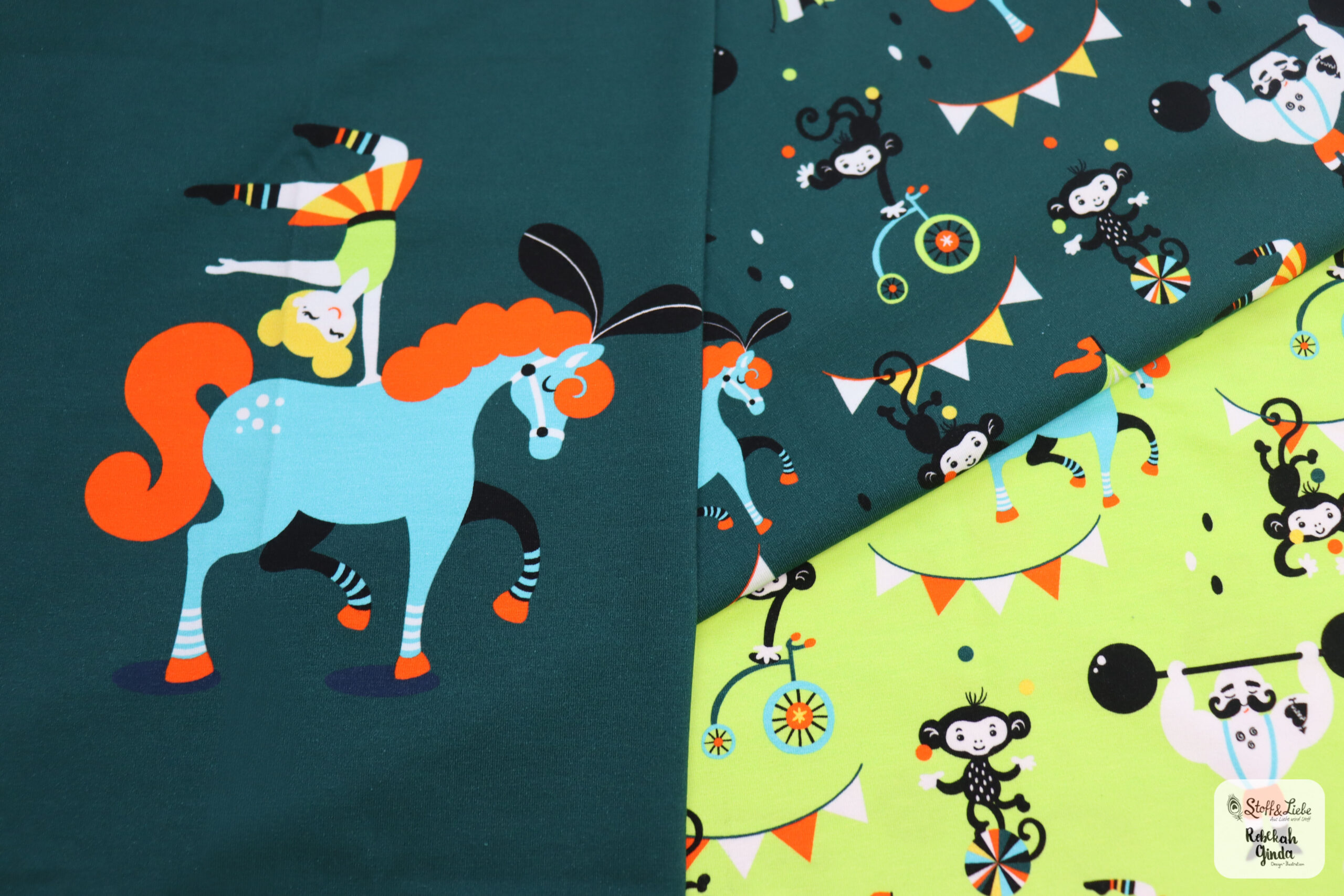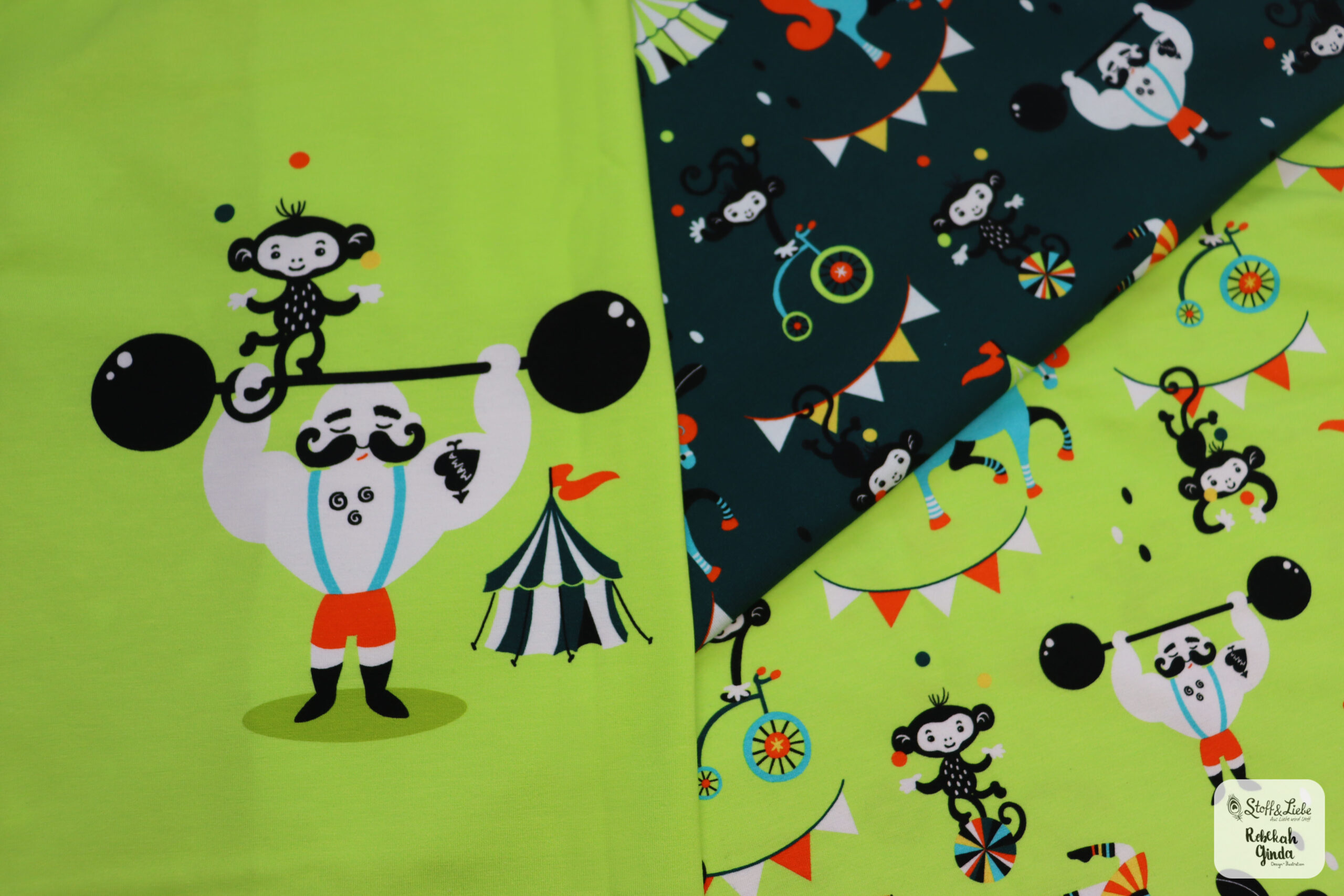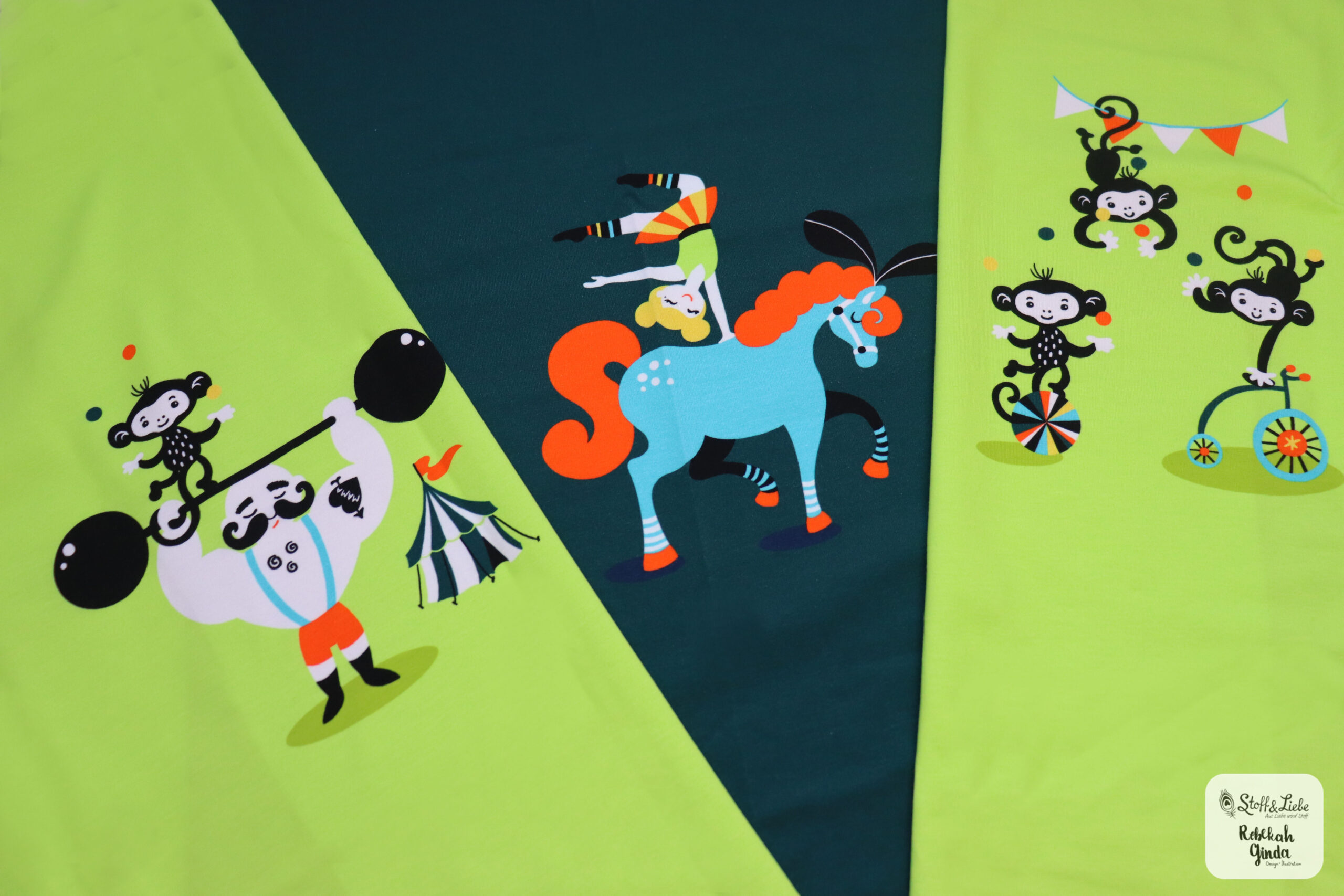 Das linke Motiv mit dem Gewichtheber und das rechte Motiv mit den Zirkusaffen findet Ihr jeweils auf einem frischen Grün. Auf dem mittleren Panelmotiv voltigiert eine Akrobatin auf ihrem Pferd. Durch die gewählten Farben wirken Motive und Hintergrund harmonisch und lassen sich prima mit weiteren Stoffen kombinieren.