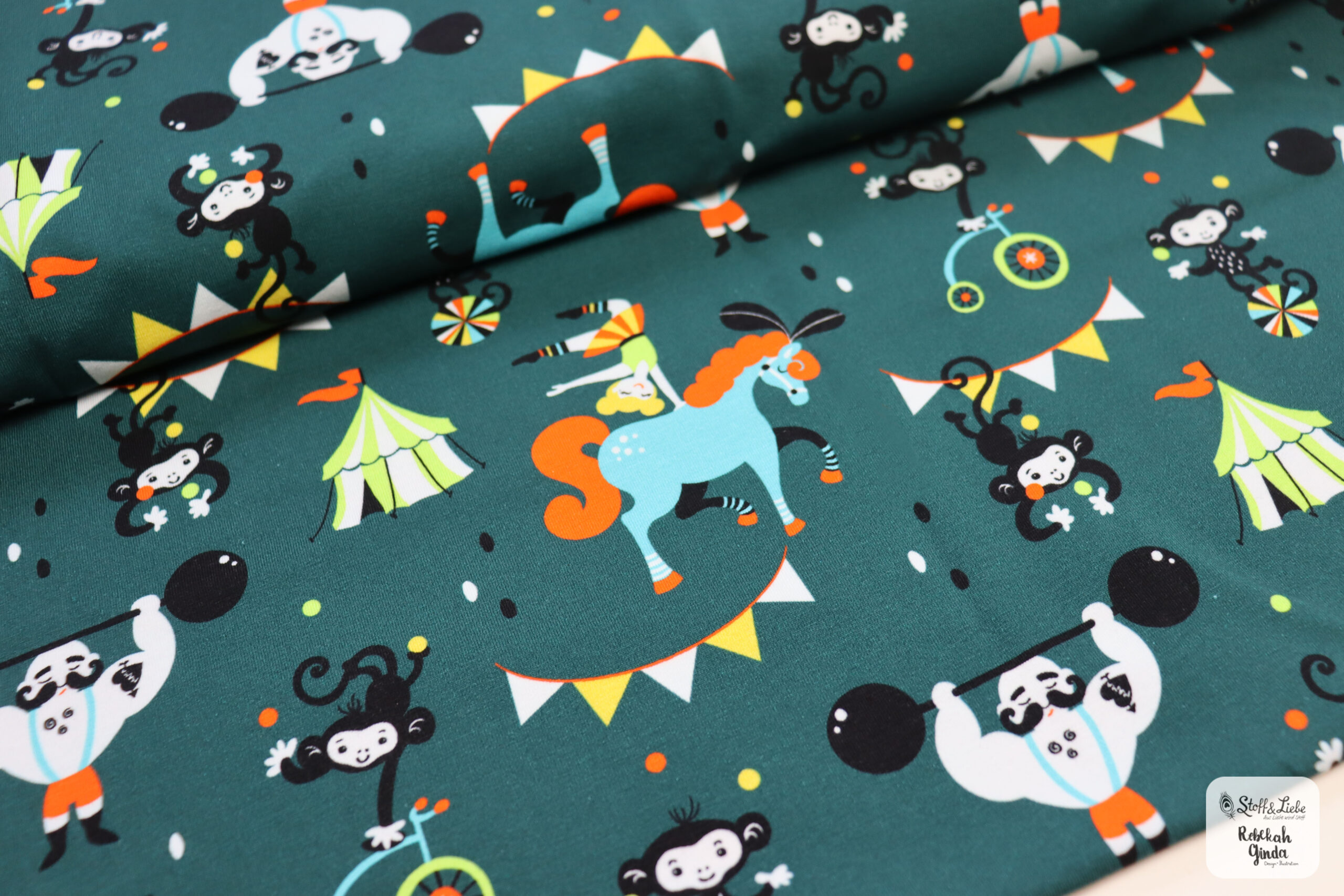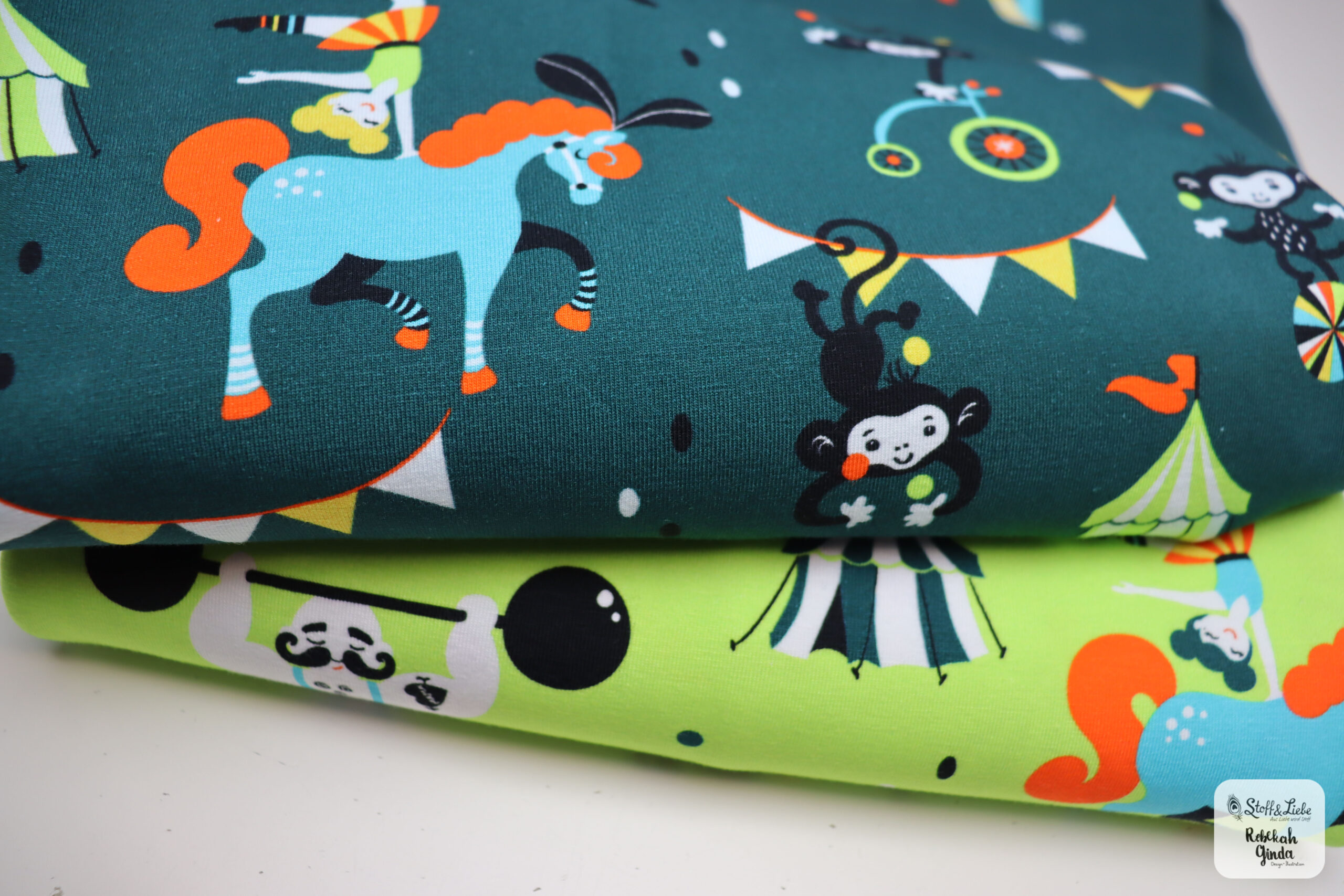 Unsere „Zirkus“ Kollektion stammt aus der Feder von Rebekah Ginda. Wir haben für Euch zwei Panels und einen Allover in zwei passenden Farbvarianten. Die Stoffe dieser Kollektionen erscheinen auf Jersey und hat eine Materialzusammensetzung von 95% Baumwolle und 5% Elasthan.