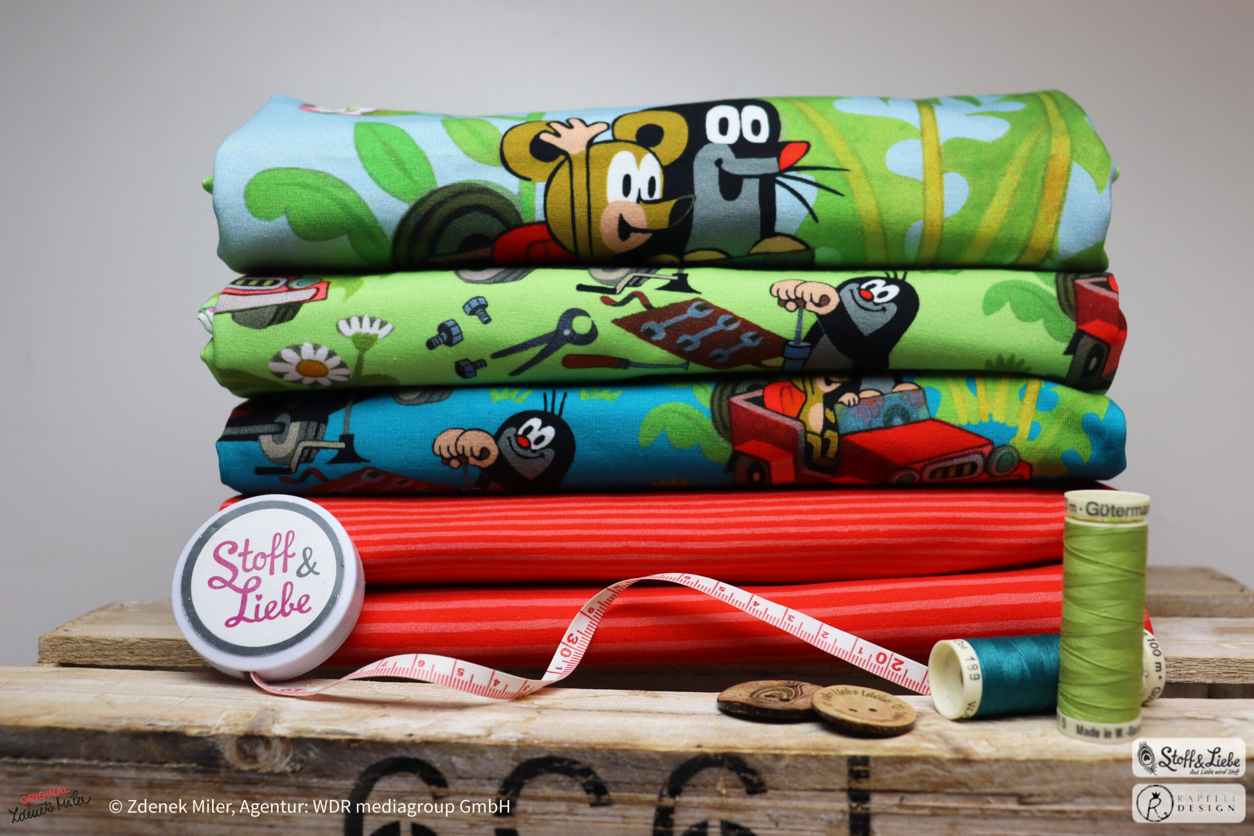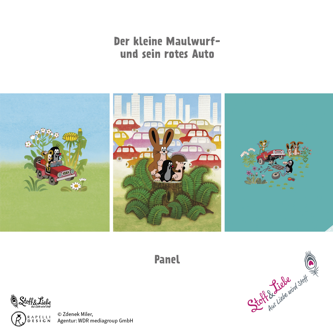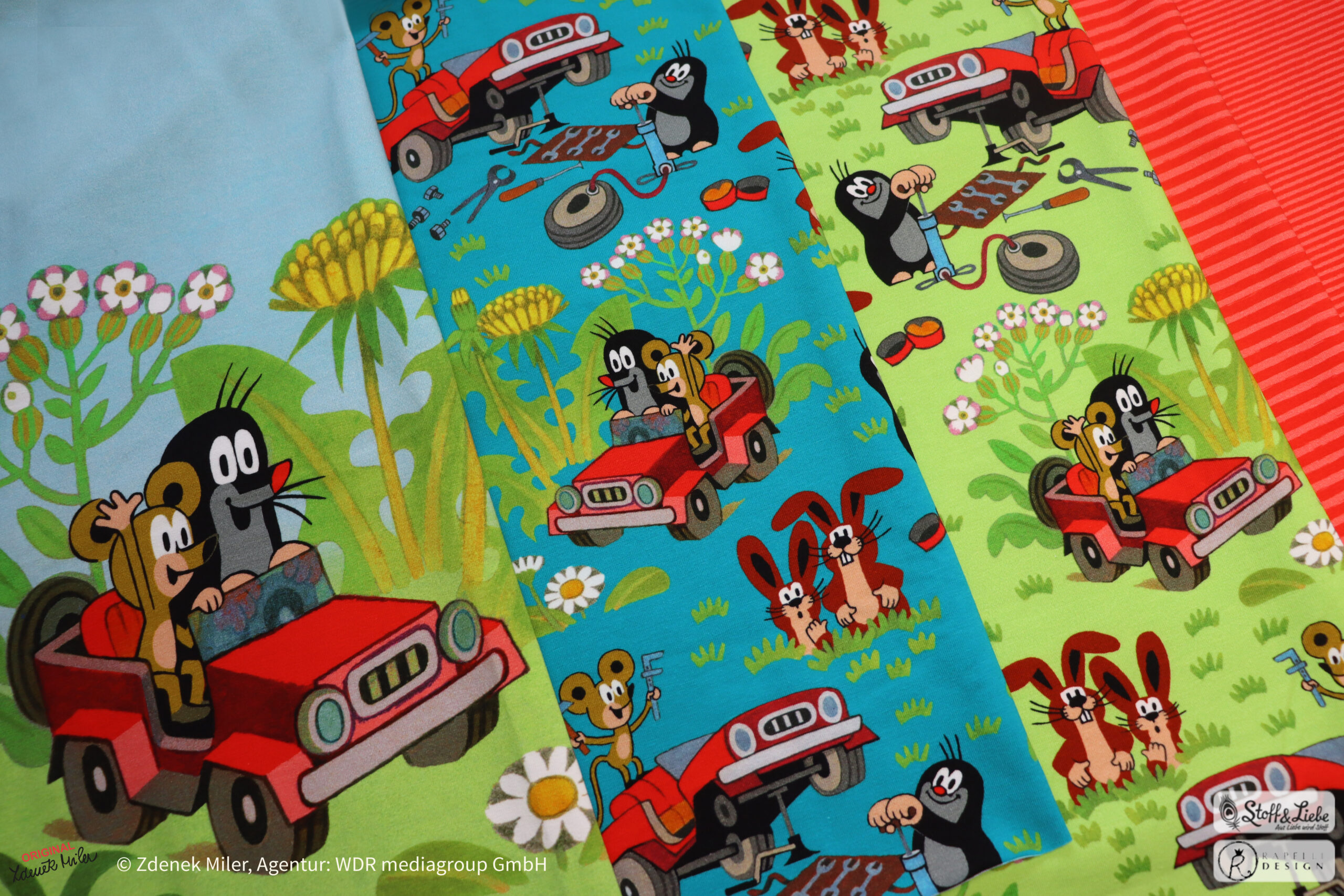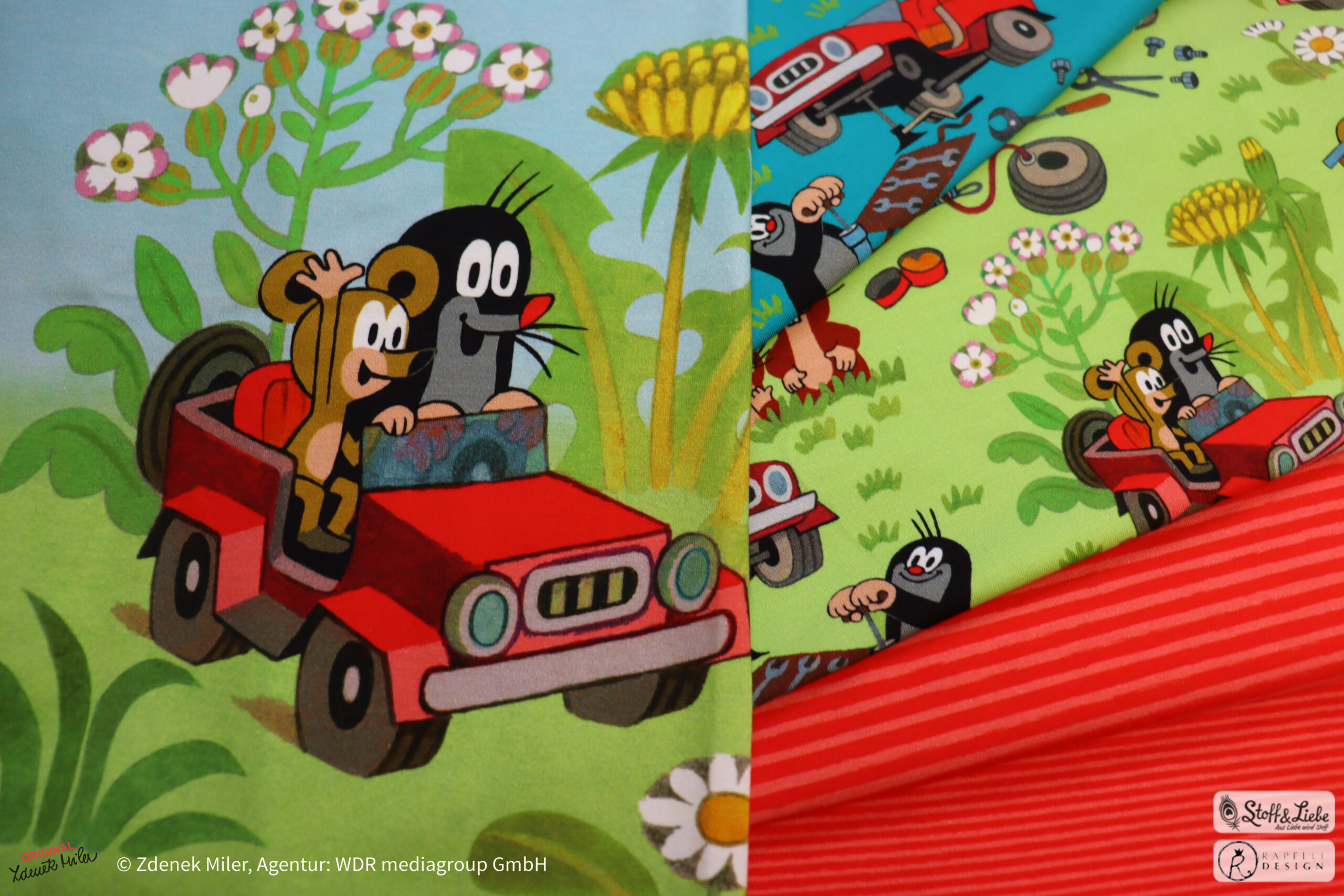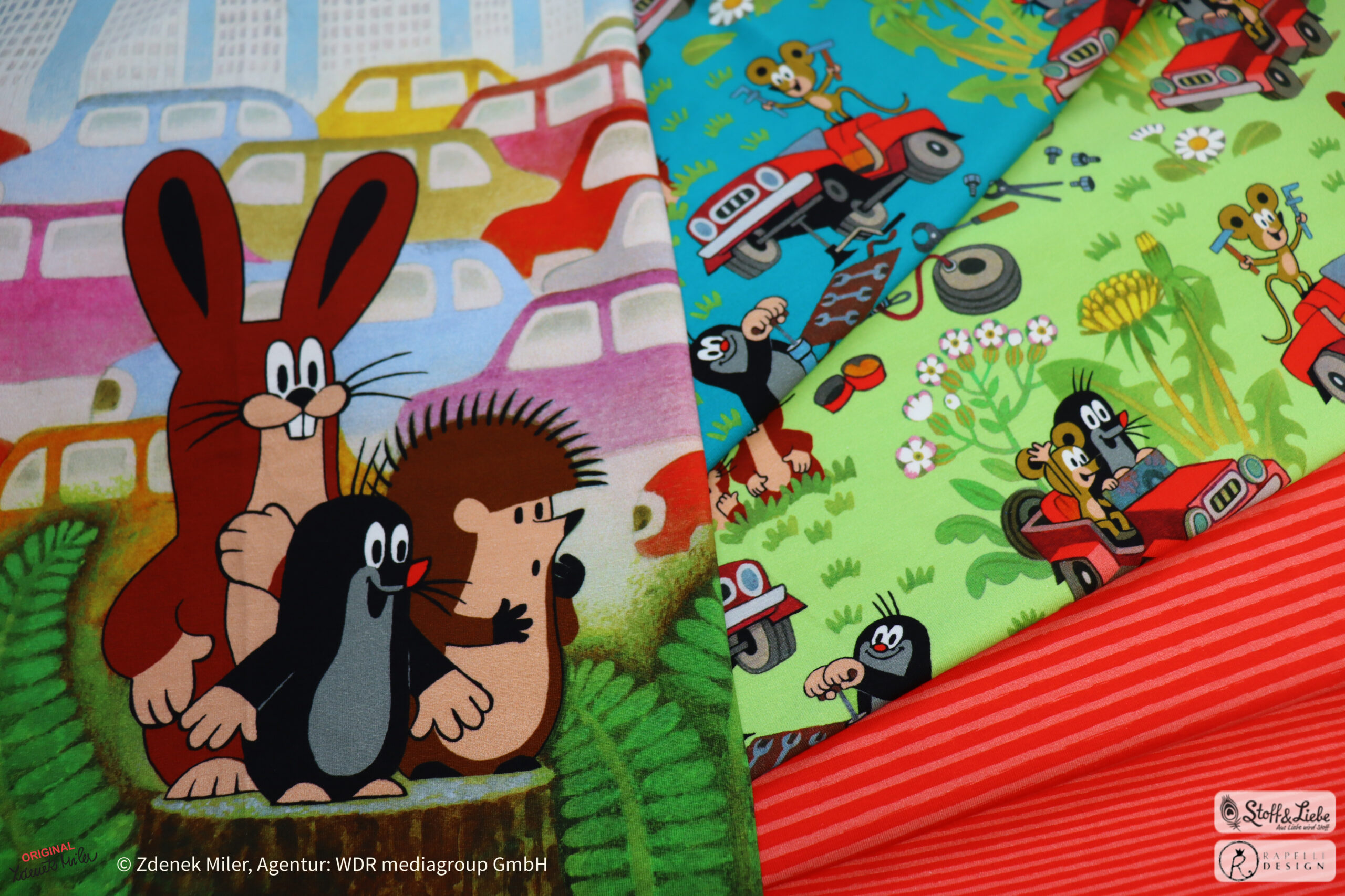 Unsere „Der kleine Maulwurf und sein rotes Auto“ Kollektion besteht aus einem Panel, einem Allover in zwei Farbstellungen und passenden Kombistoffen. Die Stoffe erhaltet ihr auf Jersey in unserer gewohnten Spitzenqualität. Die Materialzusammensetzung beträgt 95 % Baumwolle und 5 % Elasthan. Dieses Design wurde von der lieben Marleen von Rapelli Design umgesetzt.