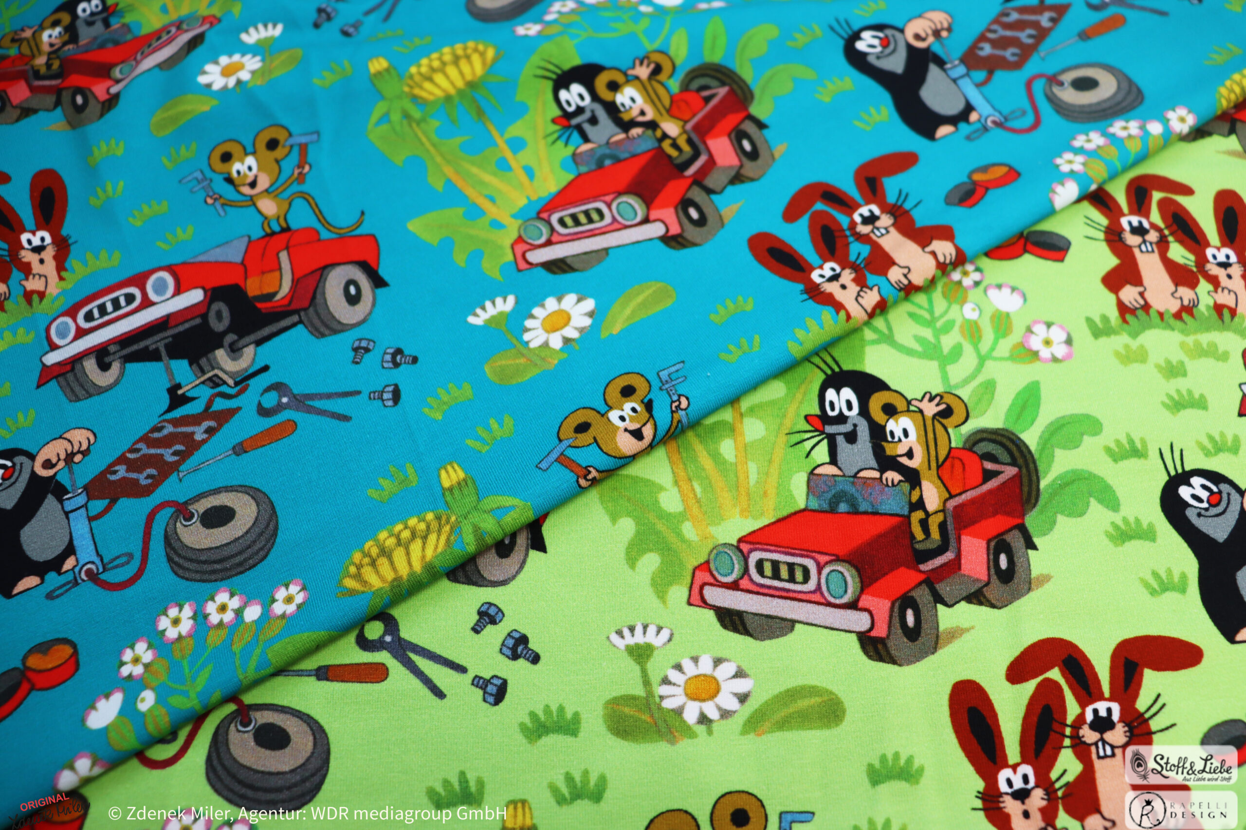 Den Allover „Der kleine Maulwurf und sein rotes Auto“ haben wir für Euch in zwei fantastischen Farben: Petrol und Grün.