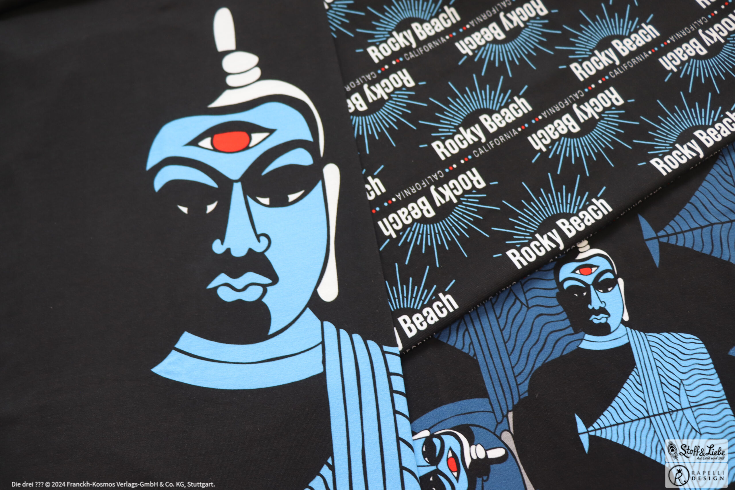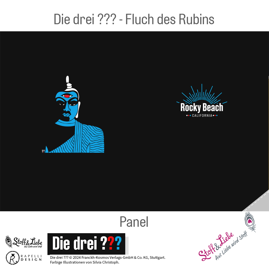 Die Panels mit einer Höhe von ca. 95 cm haben wir wieder bewusst schlicht gehalten. Dadurch sind sie total gut kombinierbar und lassen genügend Spielraum für Eure Kreativität. Somit könnt Ihr die Stoffe ganz in Eurem Stil bzw. nach Euren Wünschen vernähen. Zwei Motive stehen Euch diesmal zur Auswahl. Auf der linken Hälfte findet Ihr das Motiv „Fluch des Rubins“ und auf der rechten Seite das „Rocky Beach“ Logo.