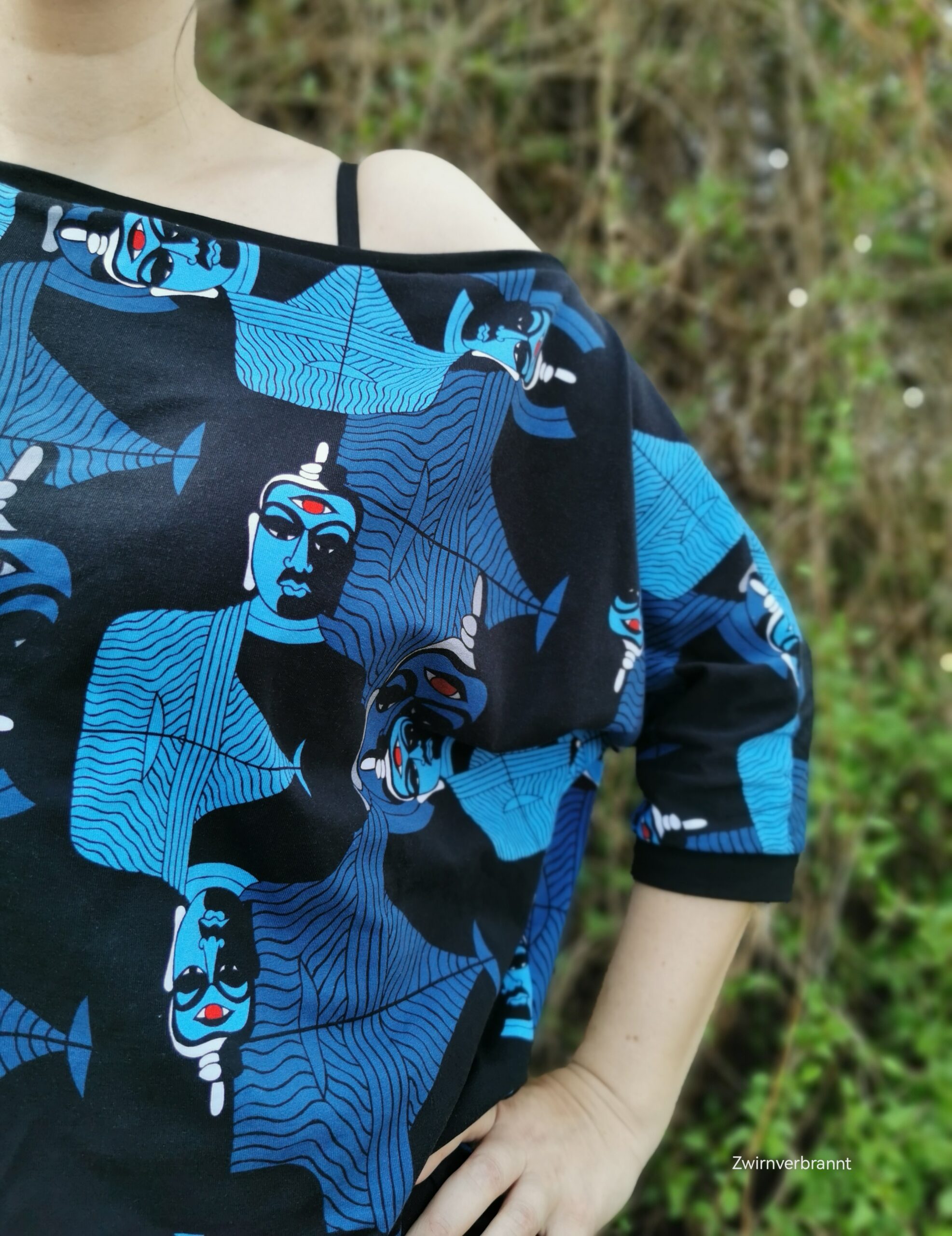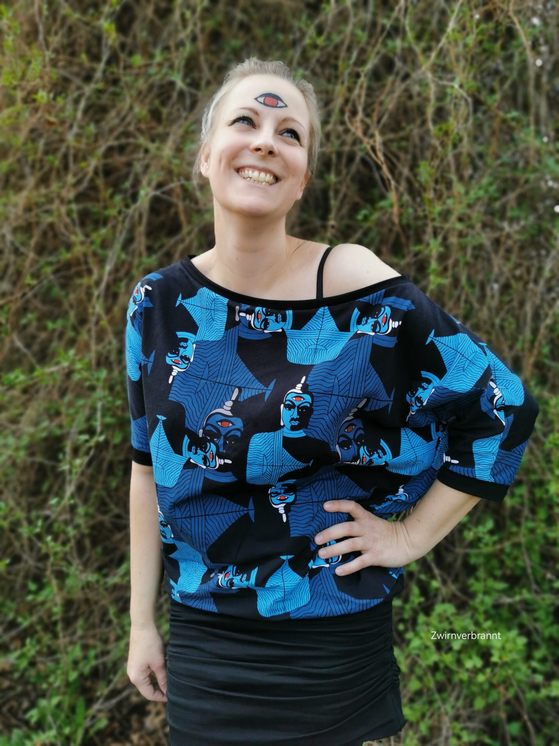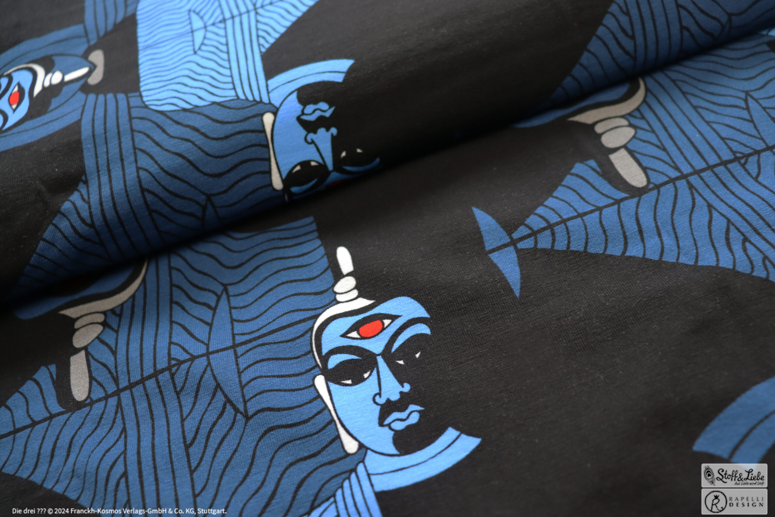 Der Allover „Fluch des Rubins“ wird seinem Namen auf jeden Fall gerecht und ist nicht nur zum Panel vernäht ein wahrer Hingucker. Auch Solo macht er so richtig was her. Und wisst Ihr was? Wenn Ihr ihn solo vernäht, ist er nicht ohne weiteres als Drei ??? Stoff zu erkennen. Es sei denn, Euer gegenüber ist ein wahrer Fan.