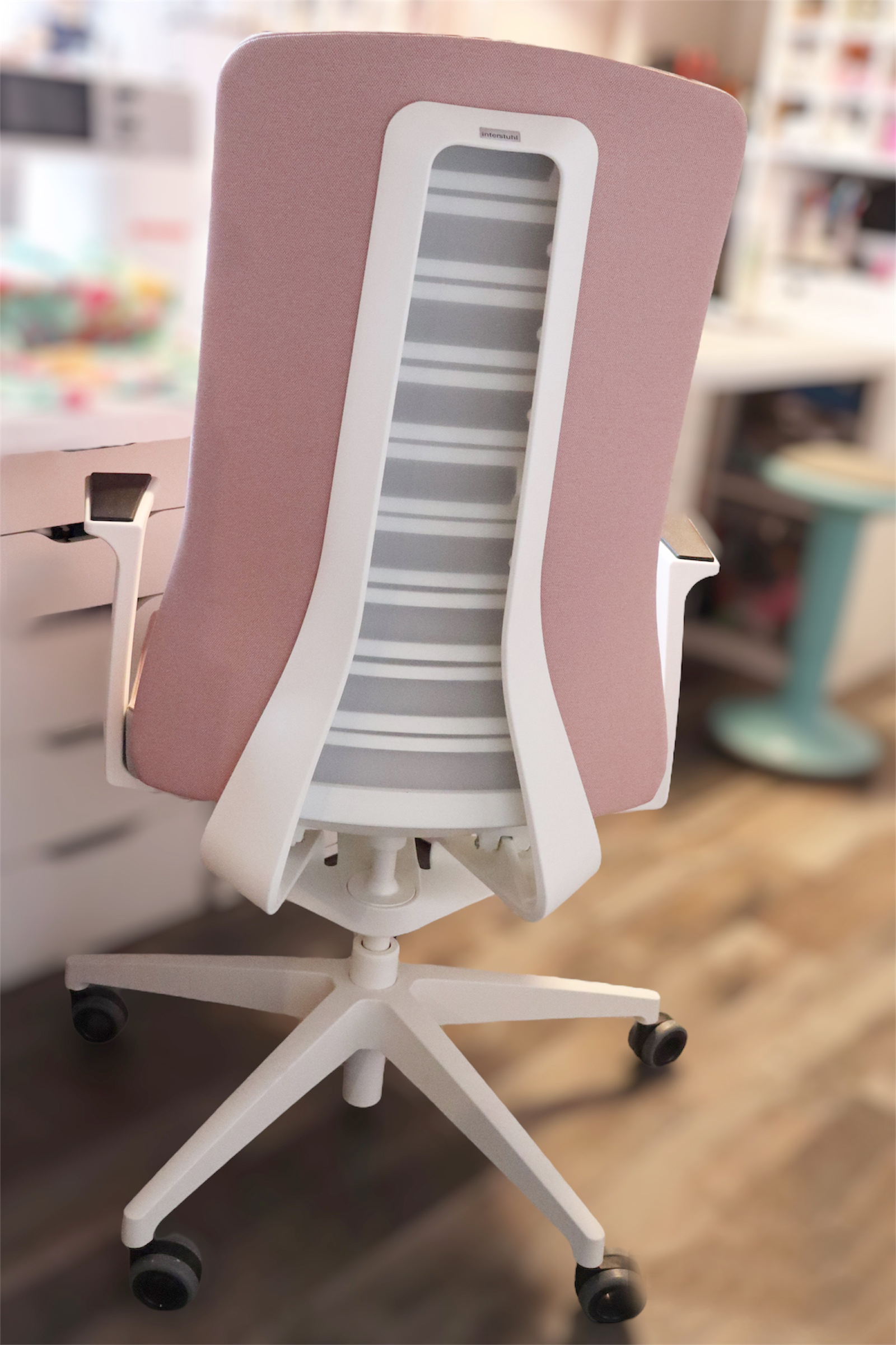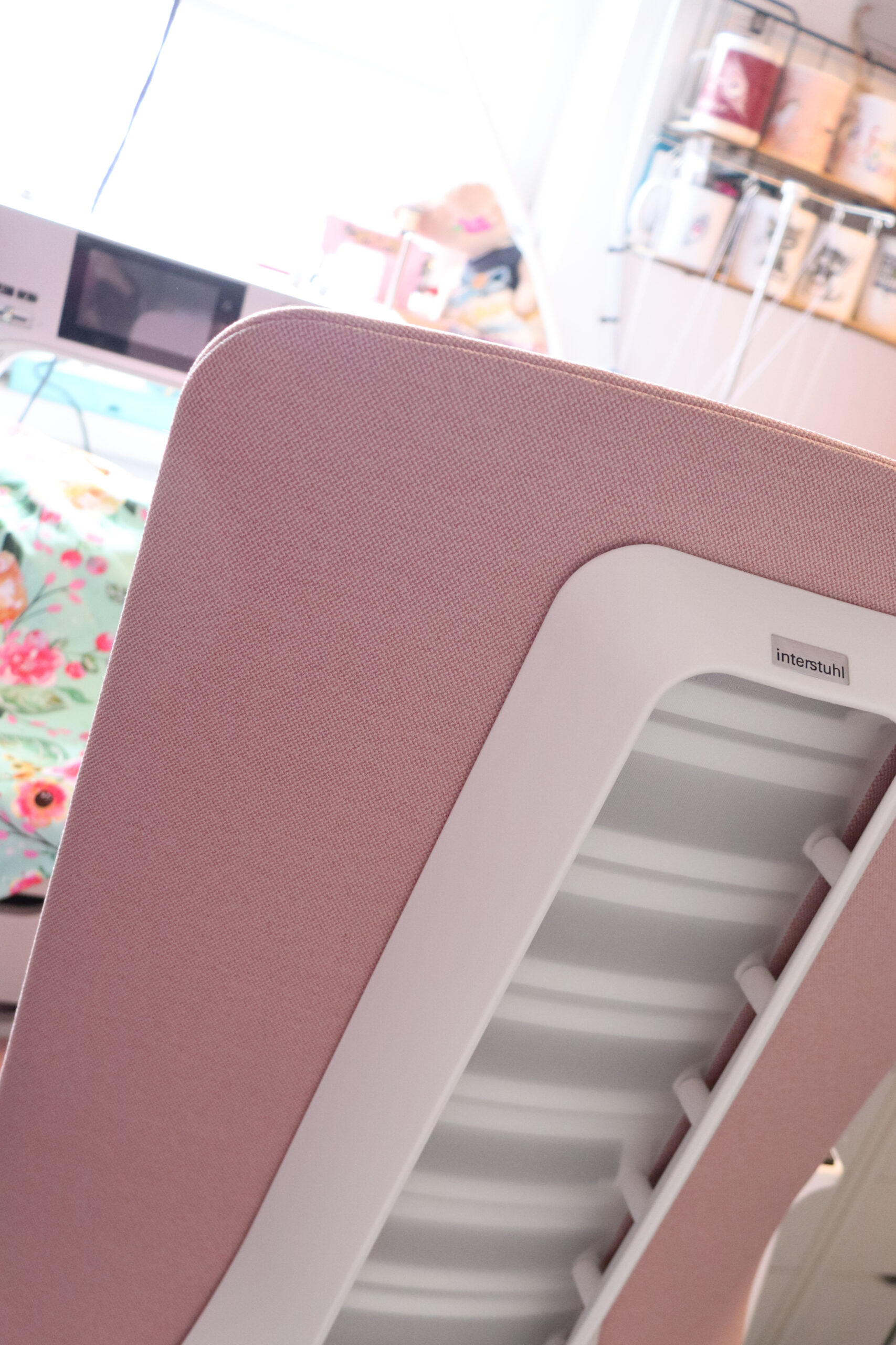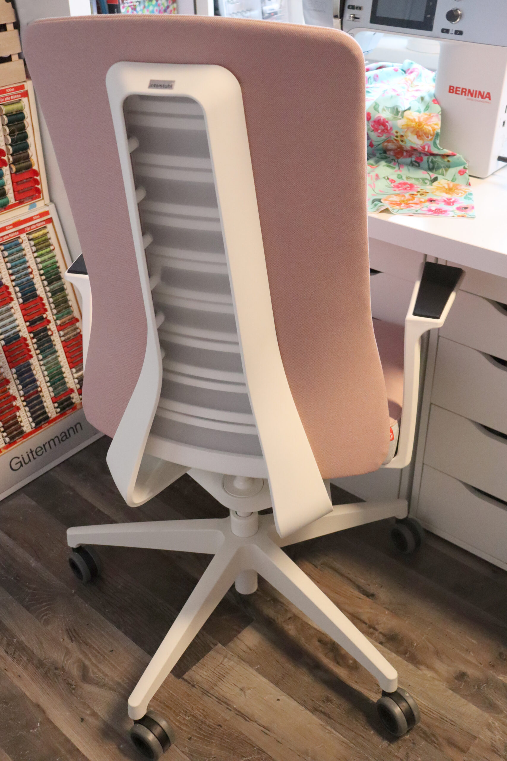 Tja, was soll ich sagen, ich bin in diesen Bürostuhl verliebt wie am ersten Tag! Nicht nur wegen der Farbe. OK, zugegeben, genau mein Beuteschema, denn wenn man sich bei mir im Arbeitszimmer umschaut, ist schon viel in Rosa zu finden. Und der Pure in Rosa passt wirklich zu vielen unserer Stoffe und vor allem zu meinem Lieblingstuch aus dem Pavo Jaqauard in GrauRosa. Aber darum geht es ja nicht 😉