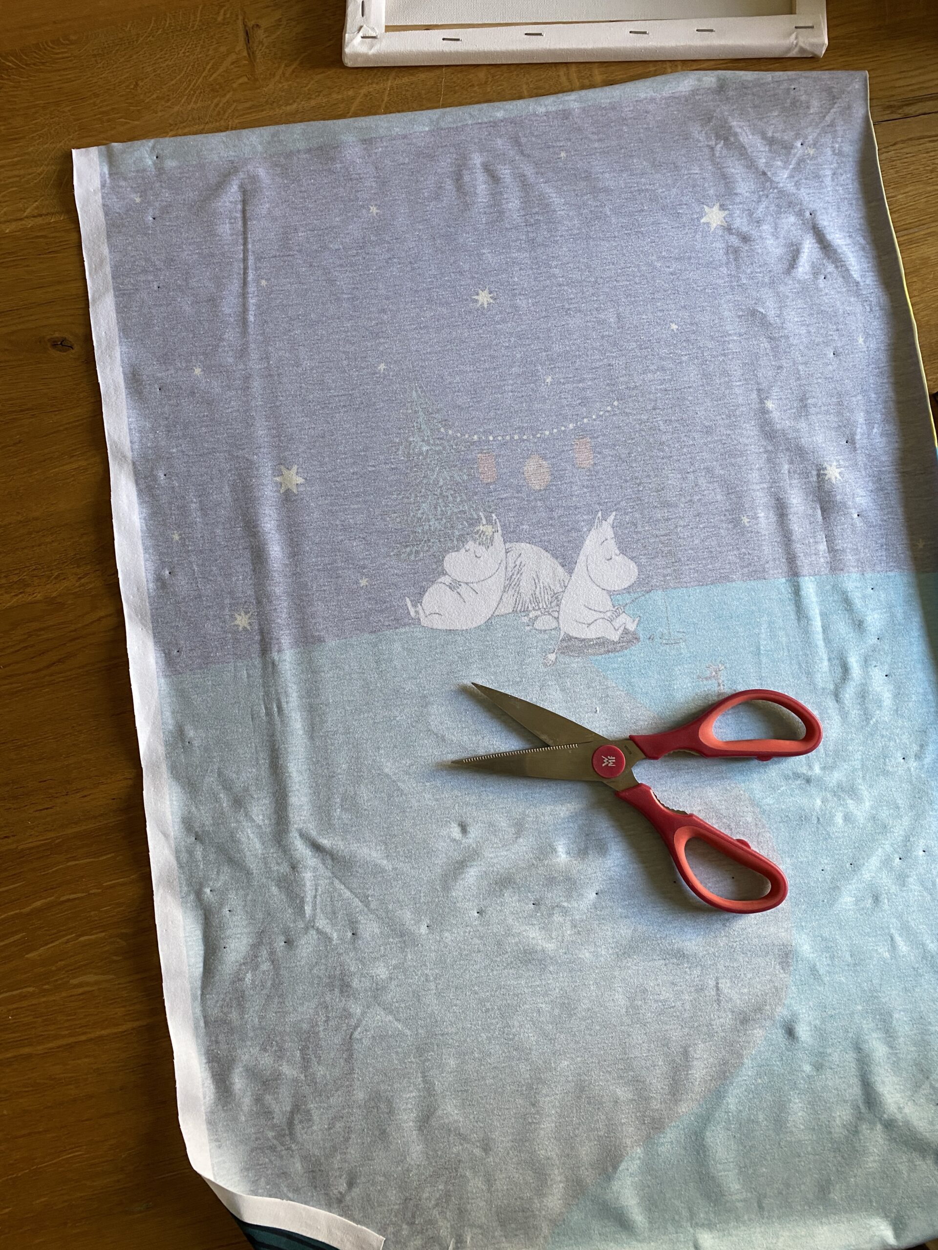 Bitte lieber etwas großzügiger zuschneiden, damit der Stoff noch über den Rahmenrand gezogen werden kann. Wendet jetzt alles und kontrolliert, ob Ihr das Motiv gut getroffen habt.