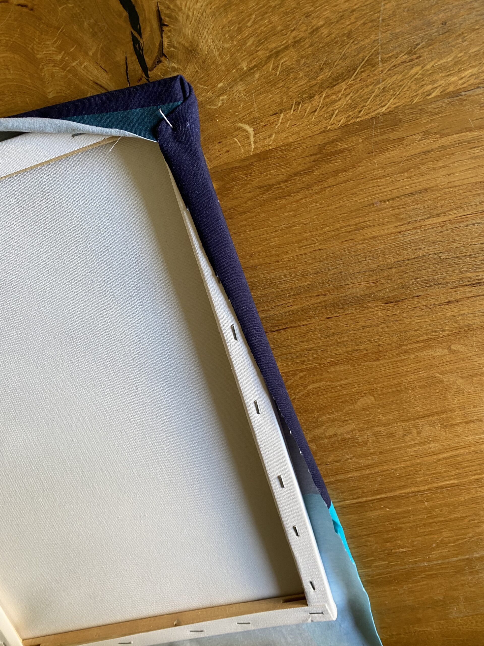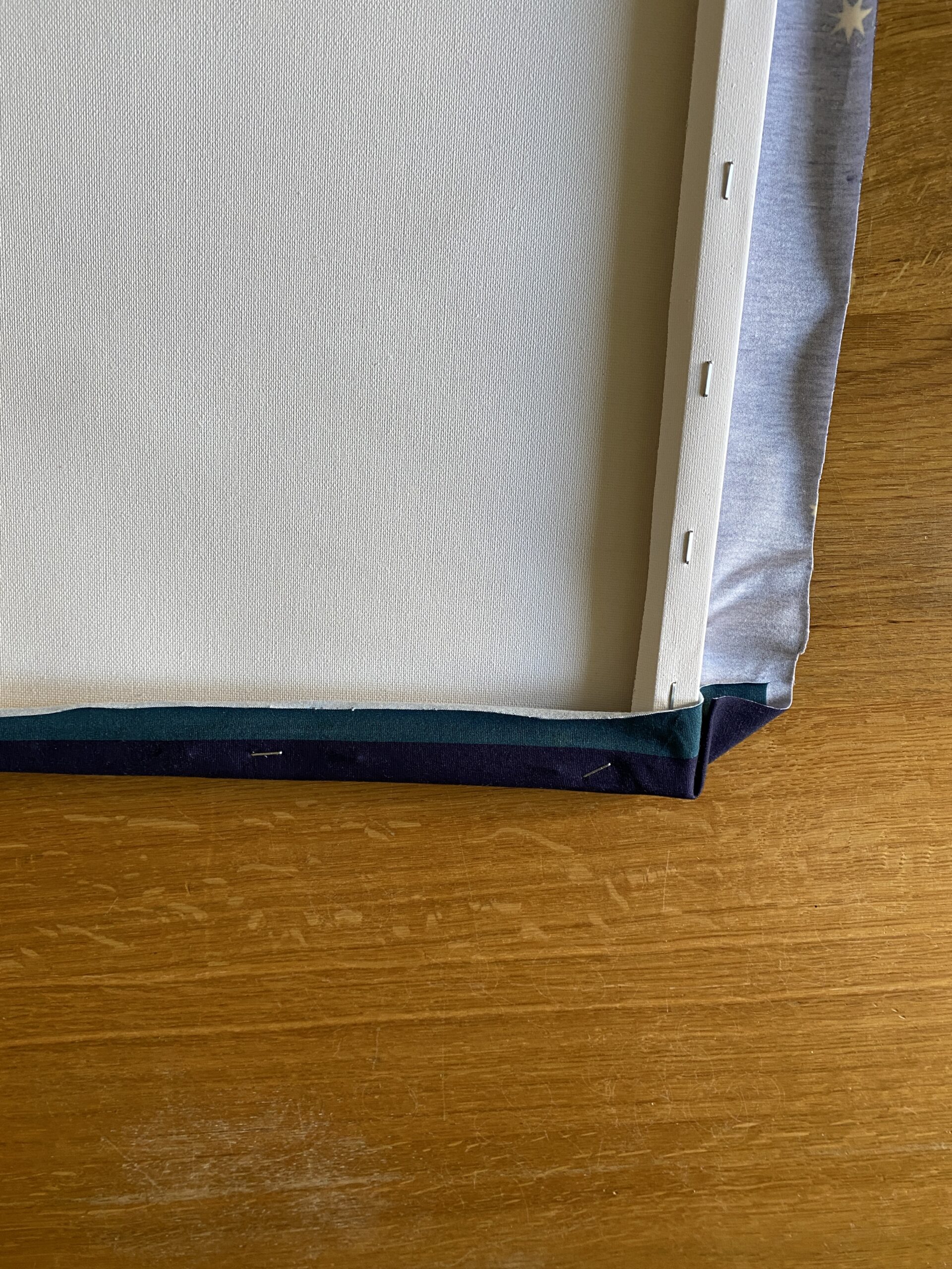 Wenn Ihr den Stoff ausgerichtet habt, haltet Ihr ihn und den Rahmen gut fest und dreht alles wieder auf die Rückseite. Nun fangt Ihr an einer Ecke an und klappt den Stoff wie Geschenkpapier beim Geschenke verpacken ein und fixiert es schon mal mit dem Handtacker. Arbeitet Euch jetzt an der kurzen Seite weiter voran bis zur nächsten Ecke.