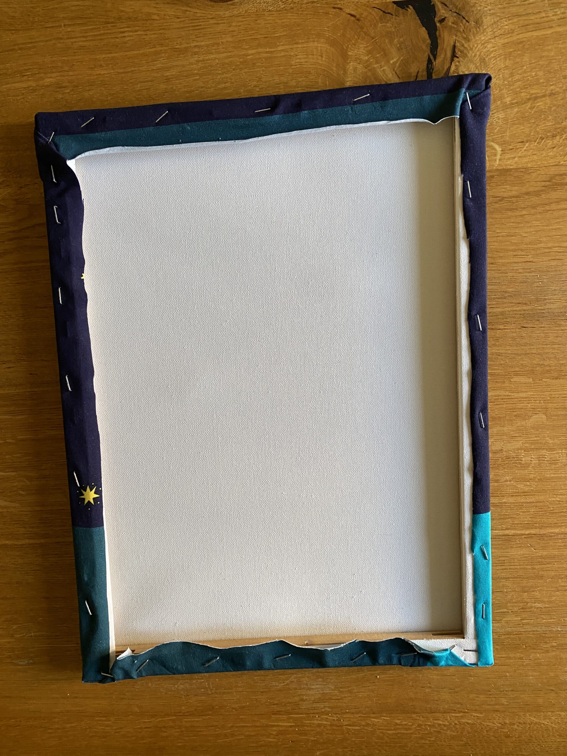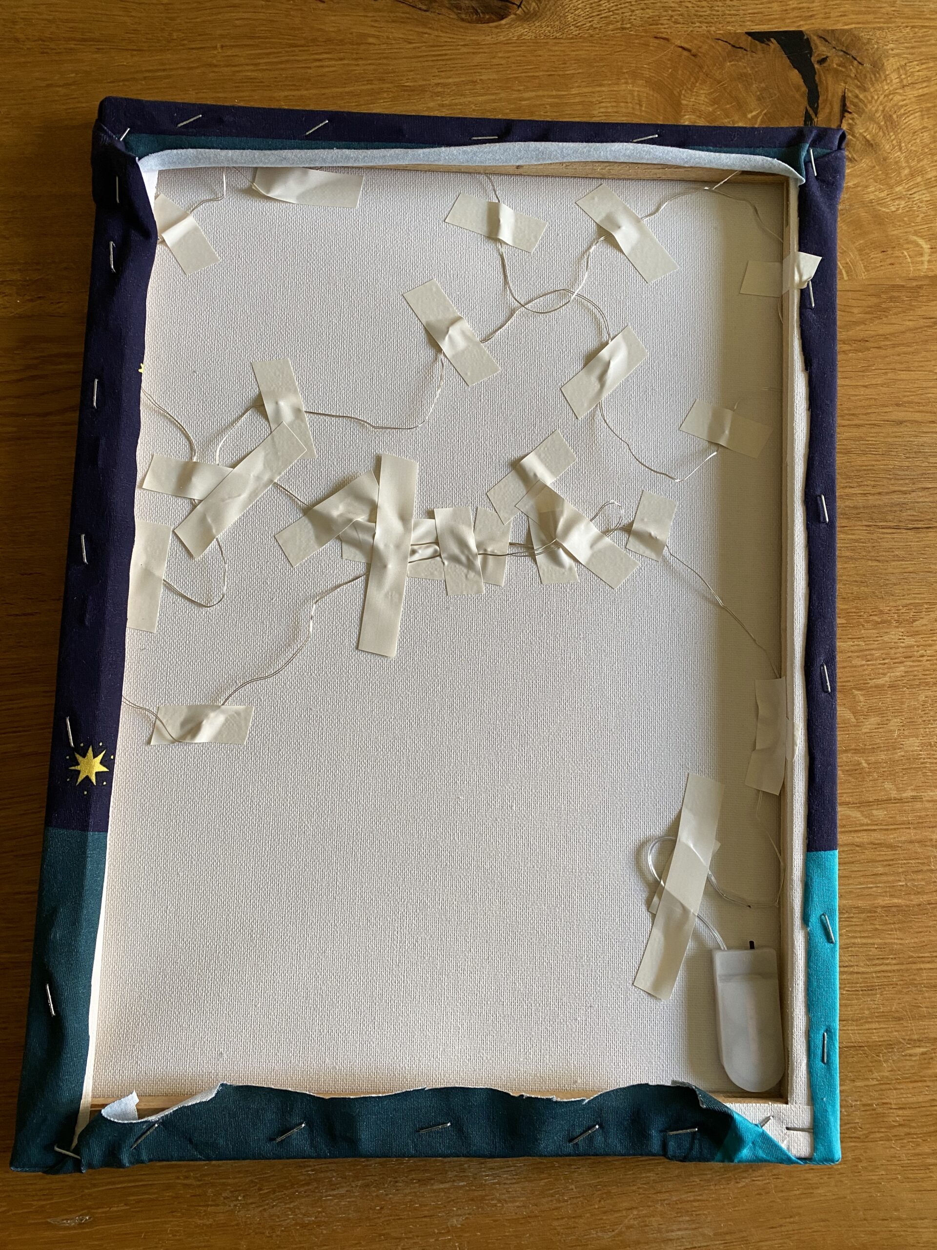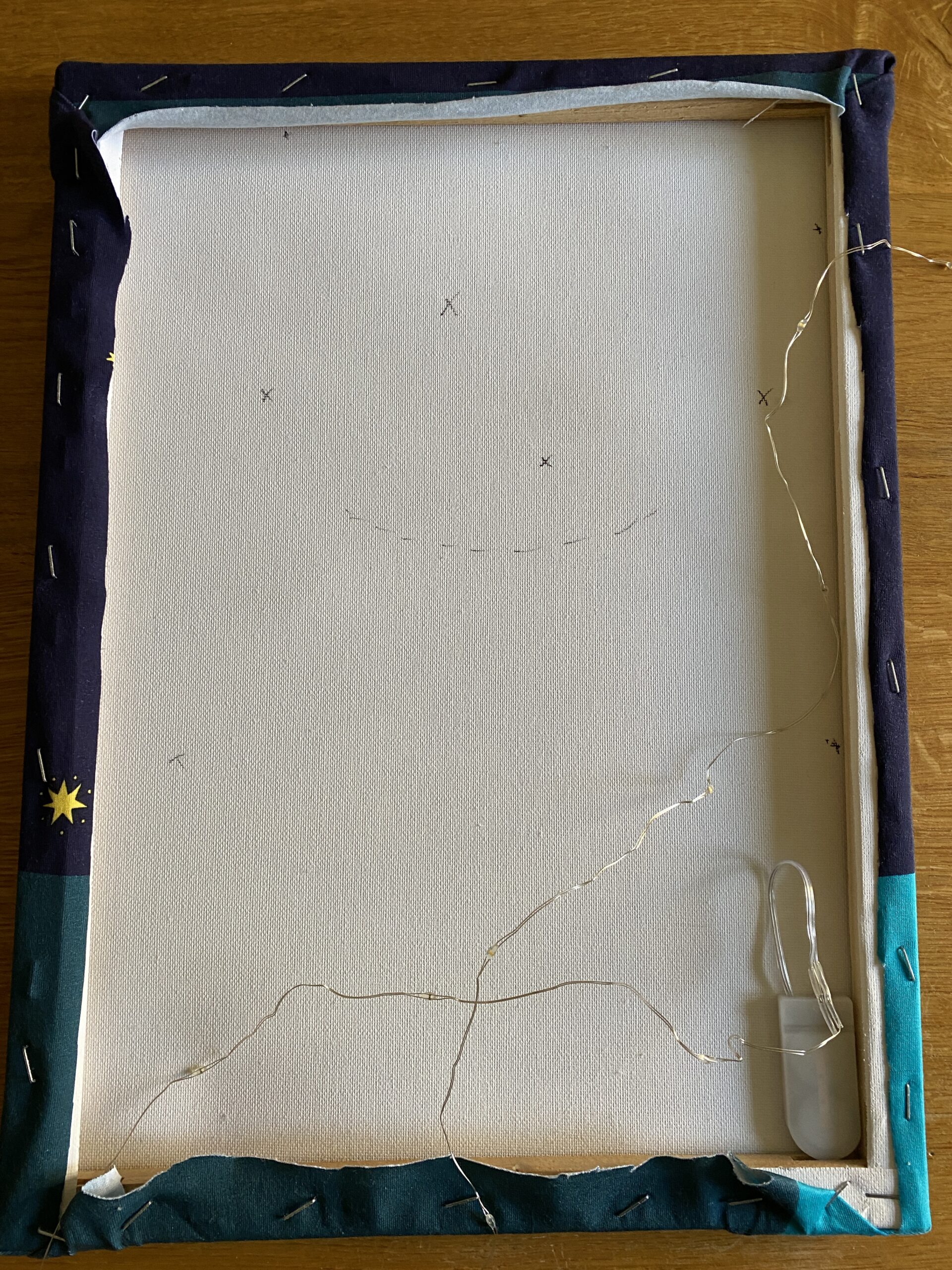 Ich mag es gerne, wenn ein Licht durch jeden Stern scheint. Damit Ihr jeden Stern trefft, haltet Ihr den Rahmen gegen eine Lichtquelle und markiert Euch auf der Leinwandrückseite alle Sterne mit einem Stift.