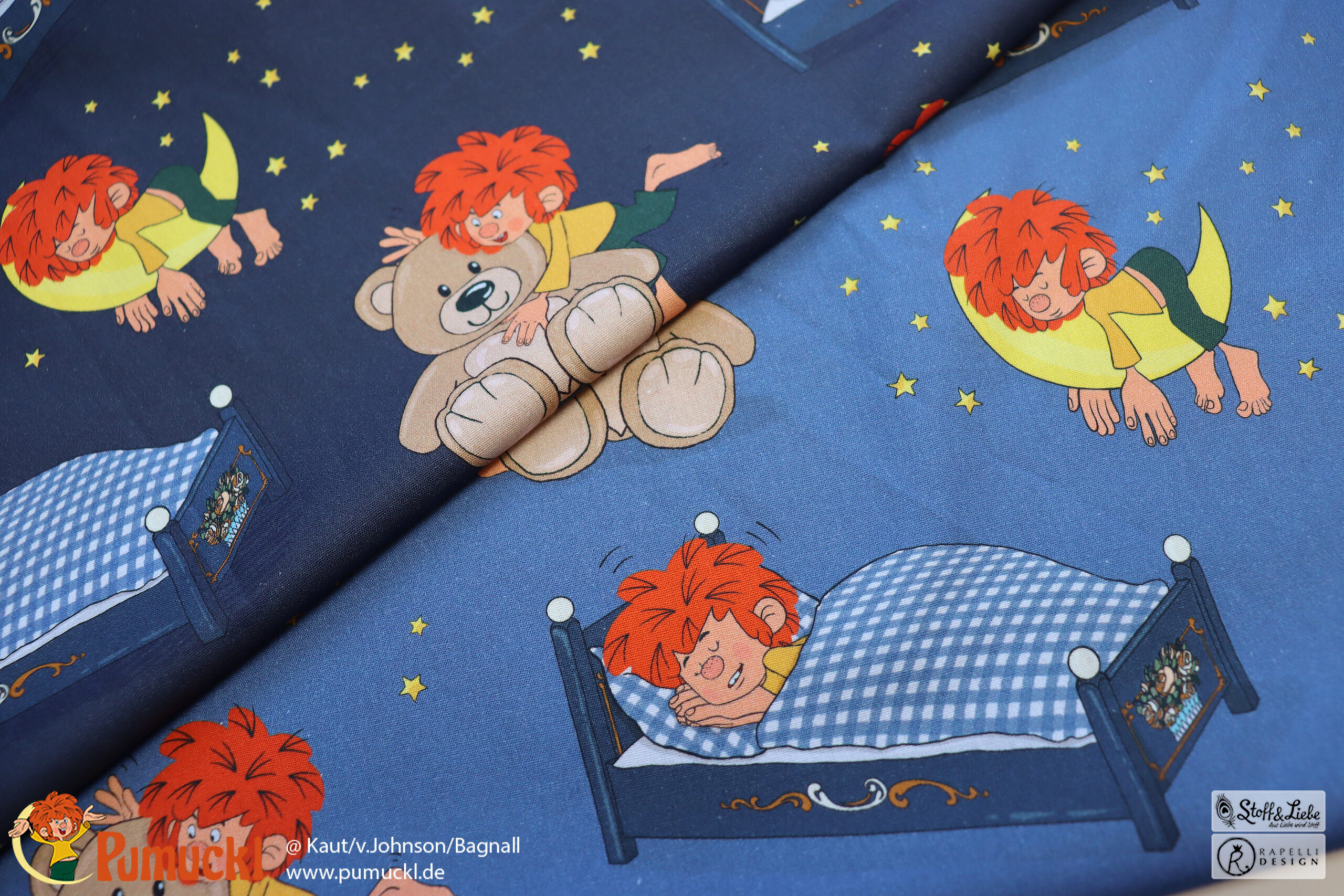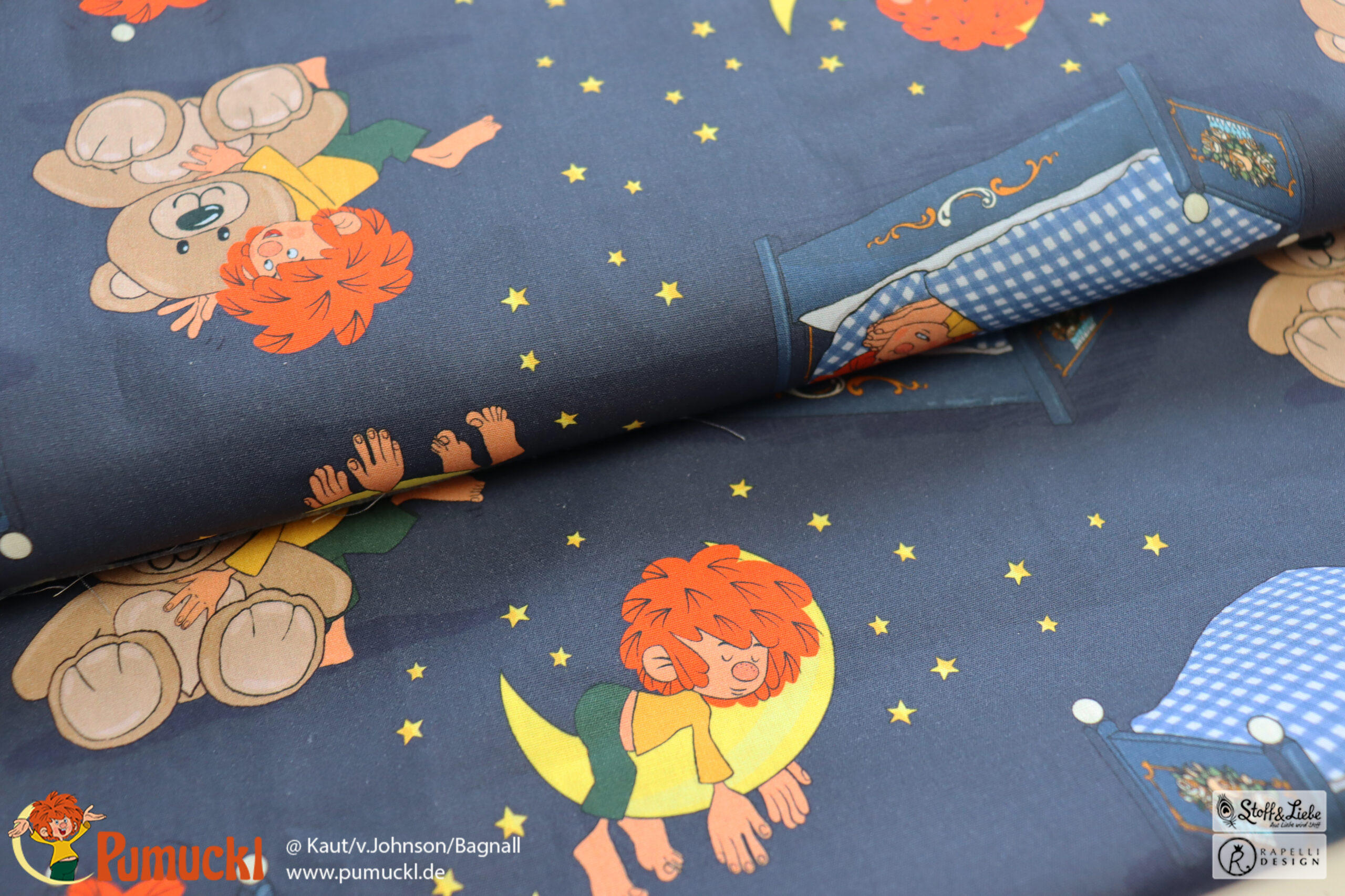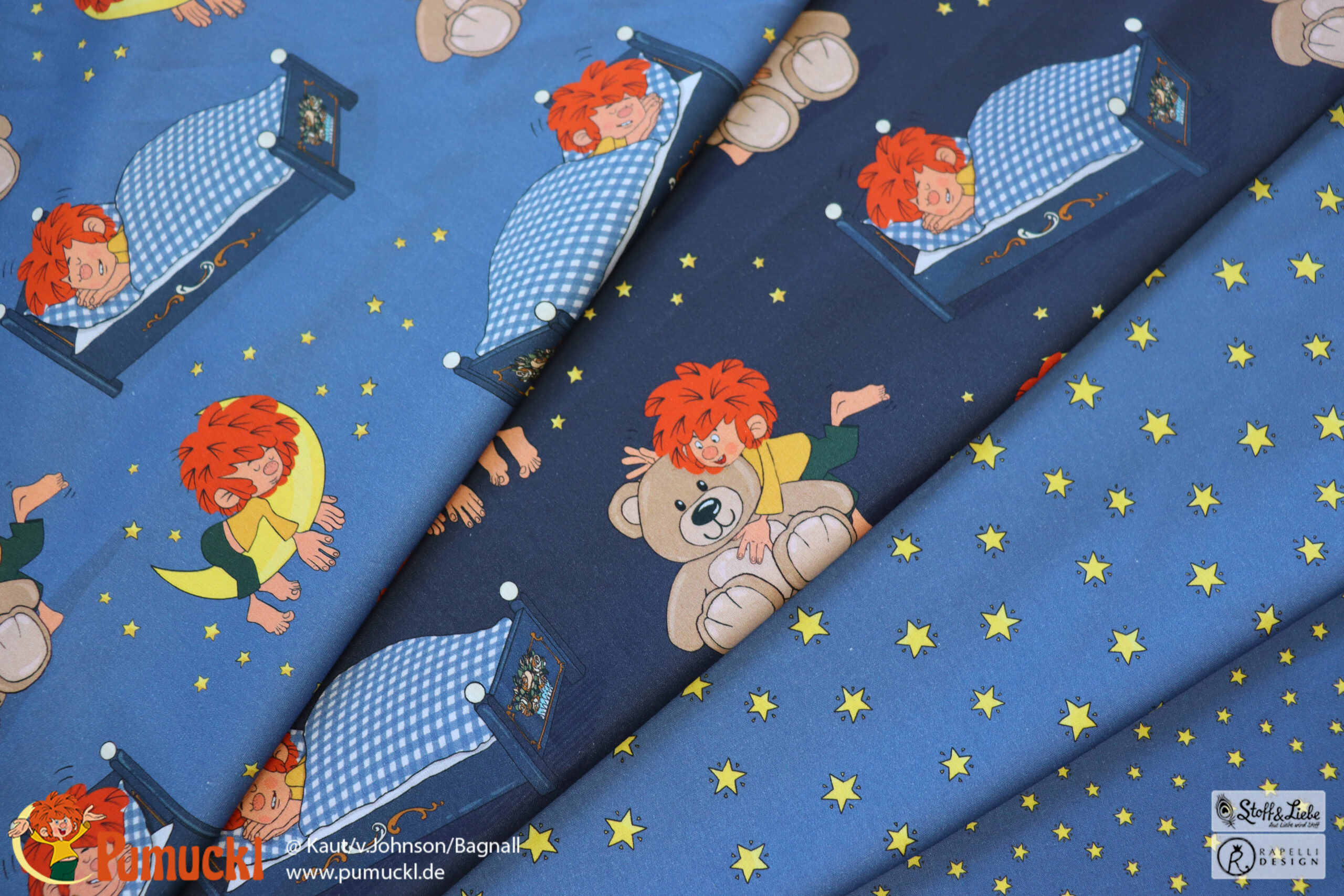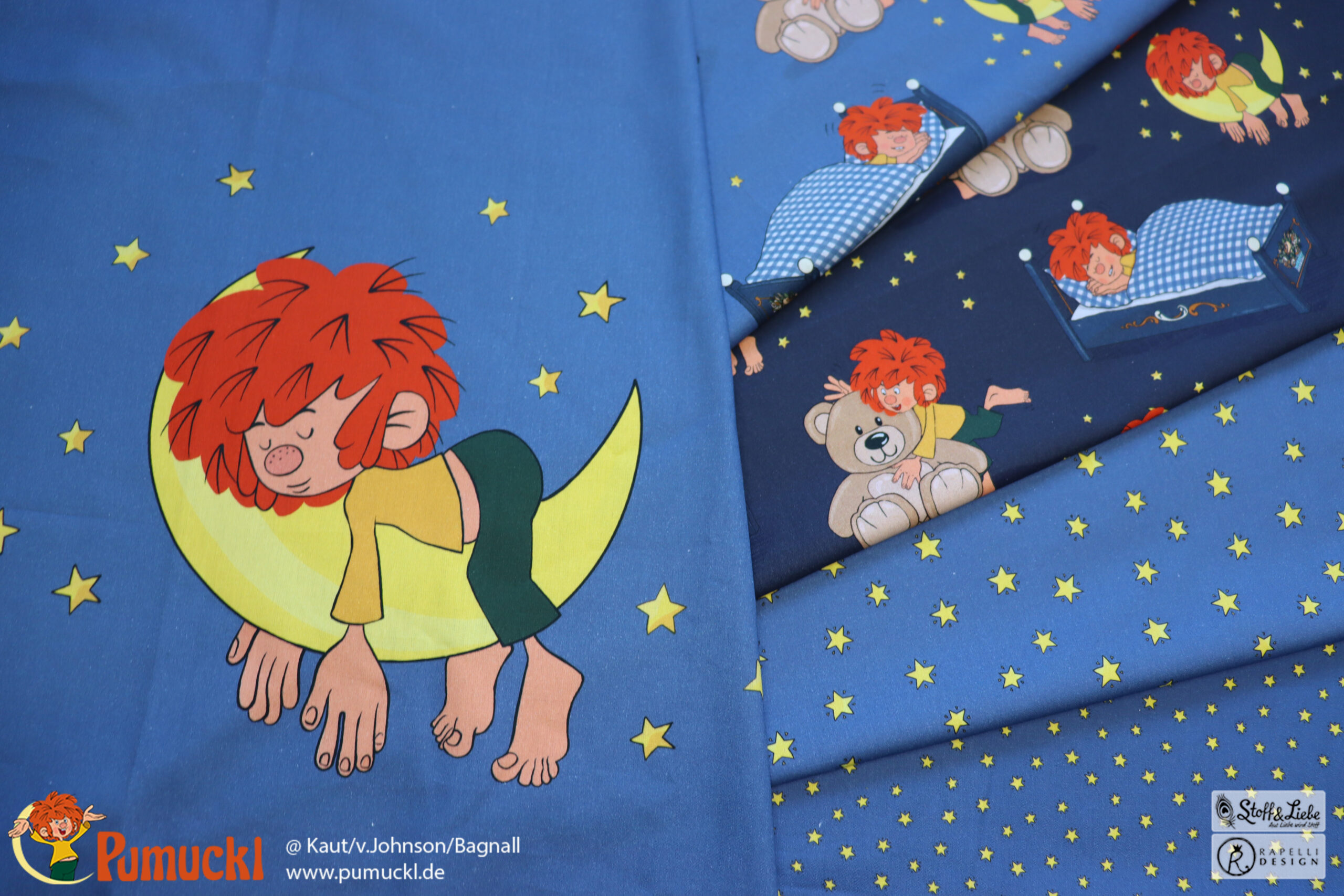 Hier findet Ihr die Motive, die Ihr bereits auf dem Panel entdecken konntet, auf einfarbigem Hintergrund, aufgelockert durch Sterne, die über den Stoff verteilt sind. Die Motive haben hier eine Größe von ca. 7 cm (Pumuckl im Mond) bis ca. 8,5 cm (Pumuckl mit Teddy).