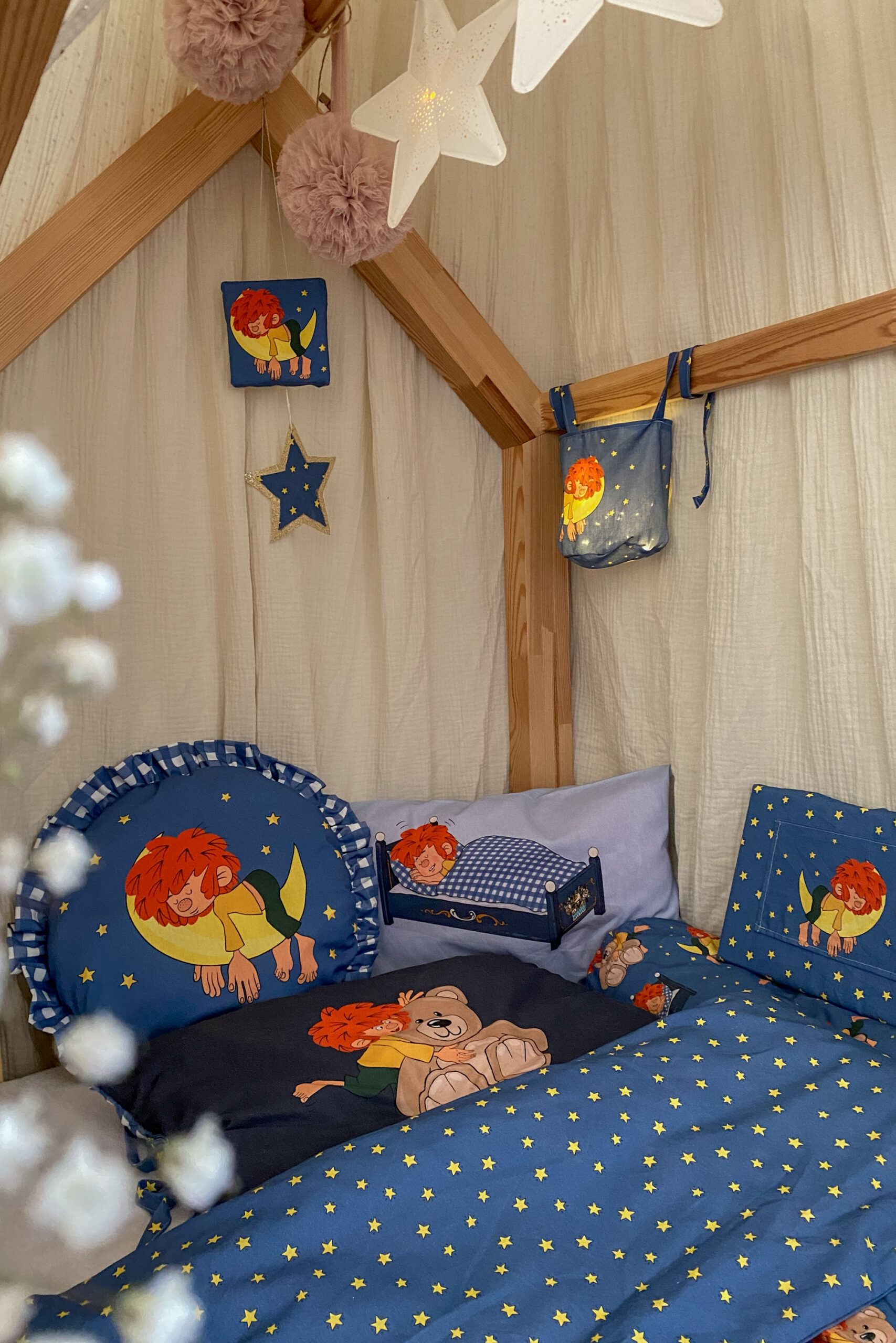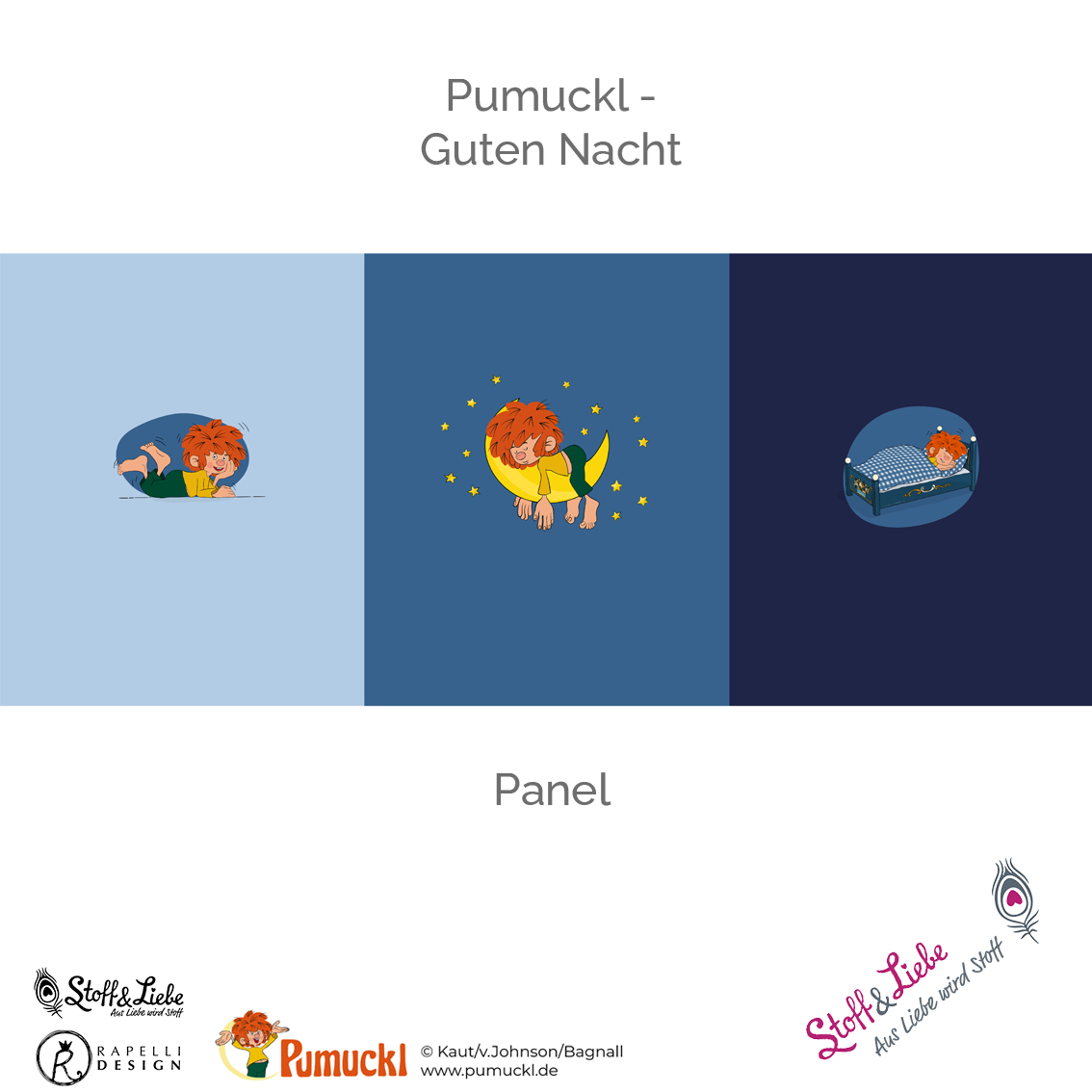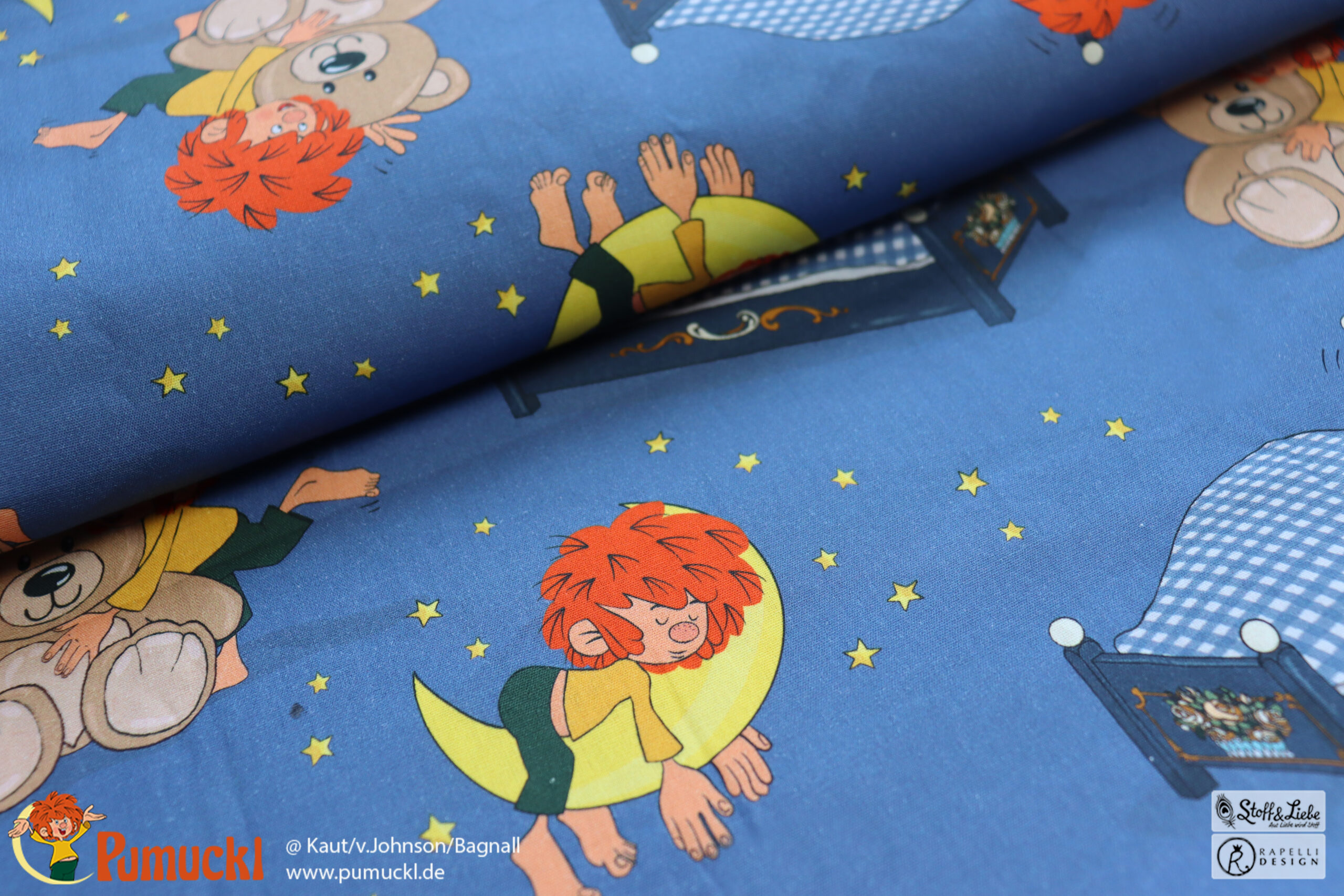 Hier findet Ihr die Motive, die Ihr bereits auf dem Panel entdecken konntet, auf einfarbigem Hintergrund, aufgelockert durch Sterne, die über den Stoff verteilt sind. Die Motive haben hier eine Größe von ca. 7 cm (Pumuckl im Mond) bis ca. 8,5 cm (Pumuckl mit Teddy).