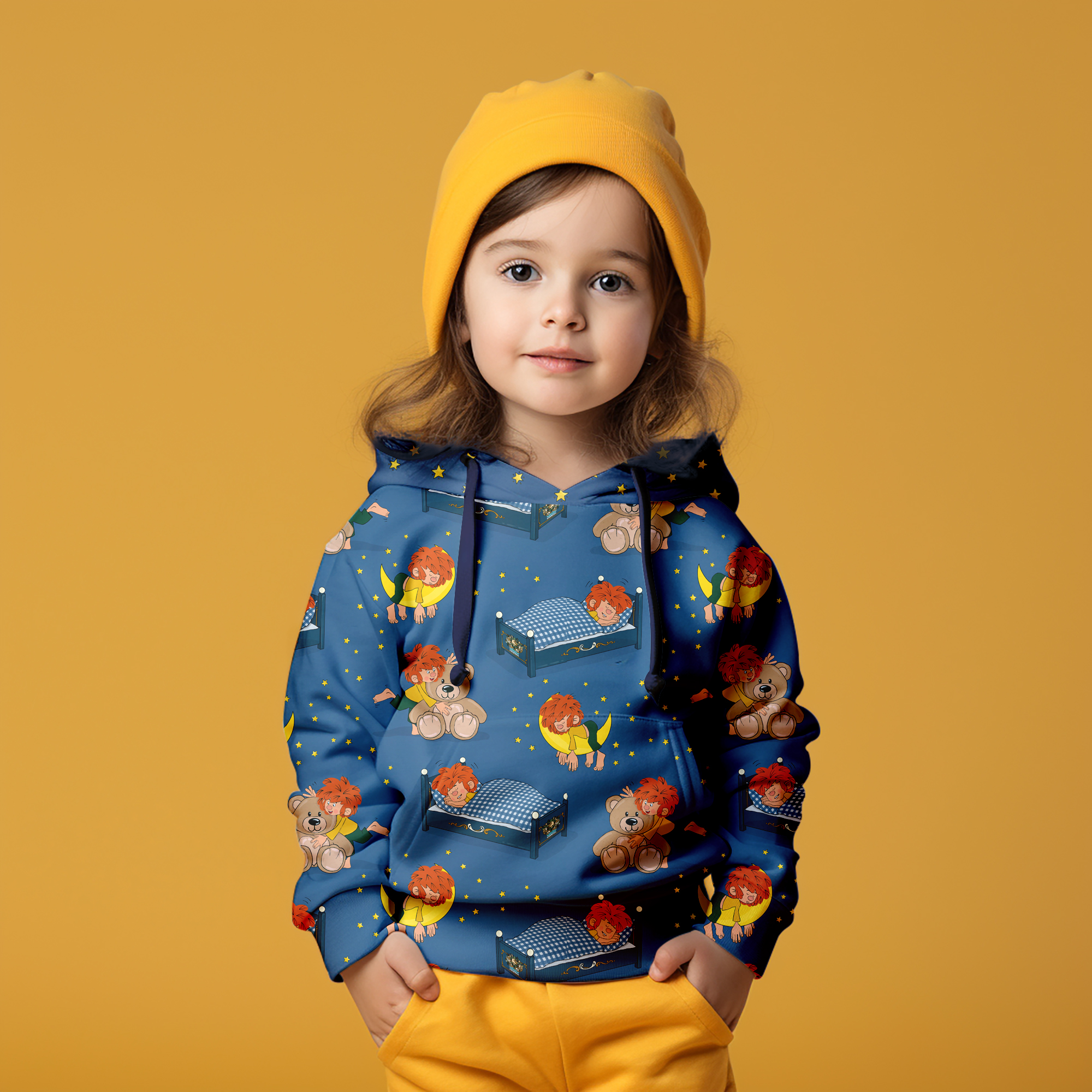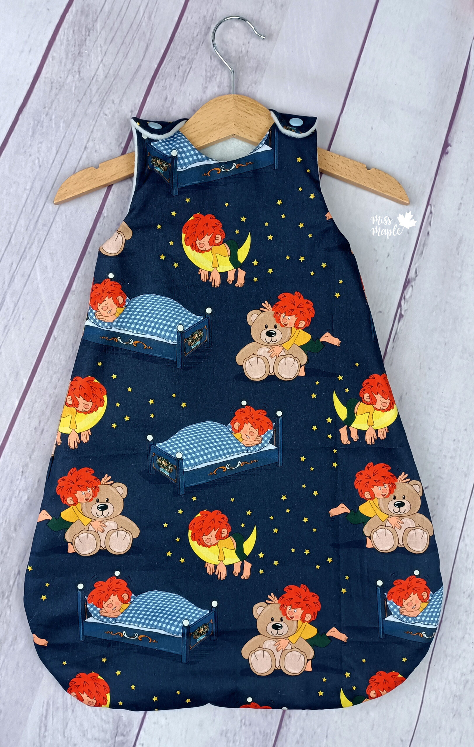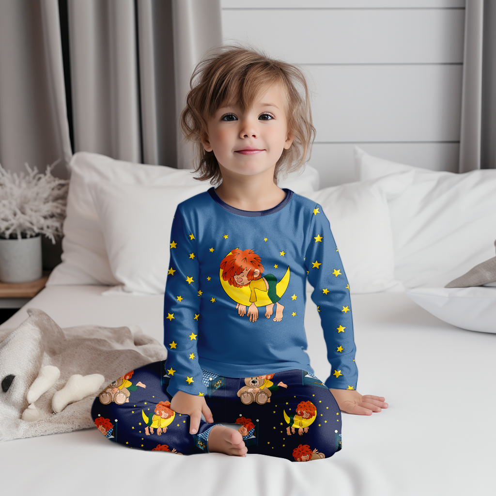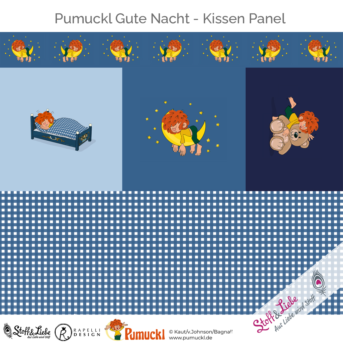 Hier findet Ihr die Motive, die Ihr bereits auf dem Panel entdecken konntet, auf einfarbigem Hintergrund, aufgelockert durch Sterne, die über den Stoff verteilt sind. Die Motive haben hier eine Größe von ca. 7 cm (Pumuckl im Mond) bis ca. 8,5 cm (Pumuckl mit Teddy).