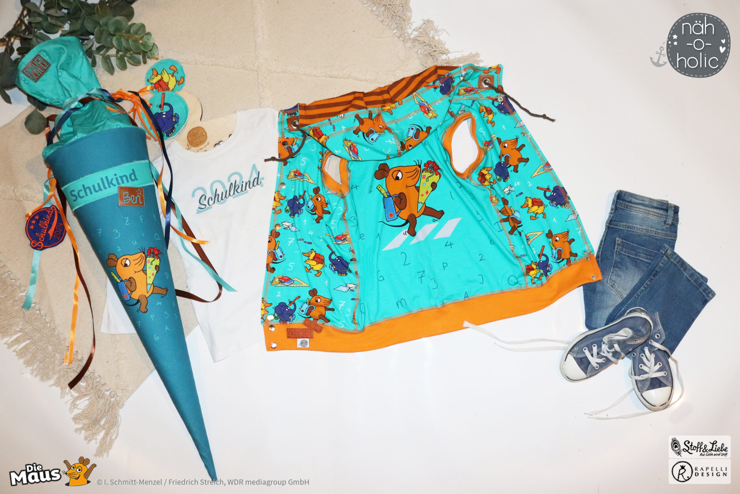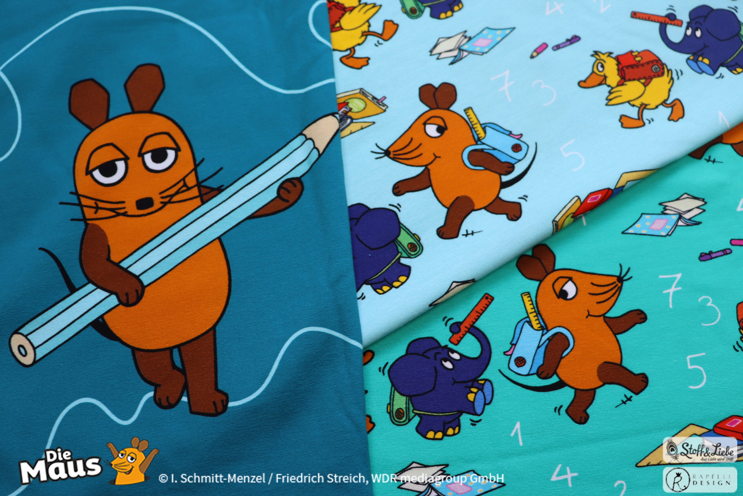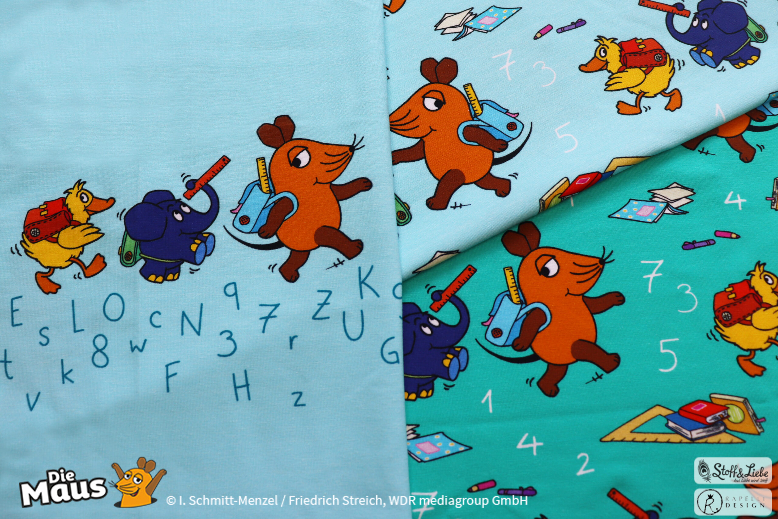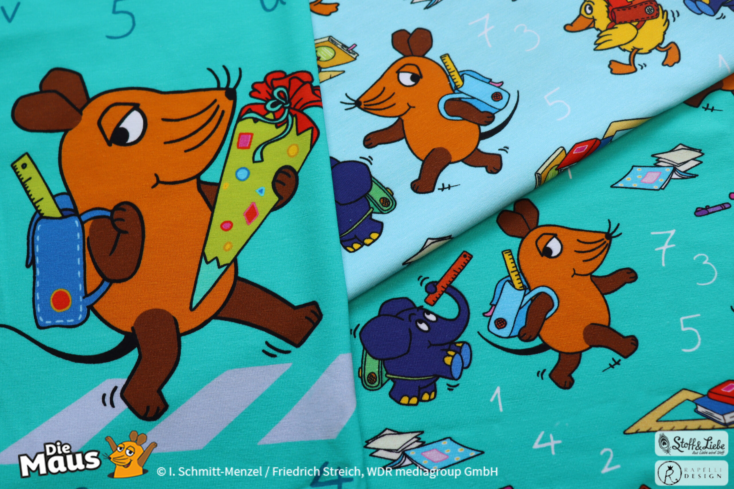 Unsere „DieMaus – Hurra! Endlich Schule“ wurde umgesetzt von Rapelli Design. Zu diesem Design gehört ein Panel sowie ein Allover in zwei Farvarianten. Die Stoffe bekommt Ihr auf Jersey in unserer bekannten Spitzenqualität.